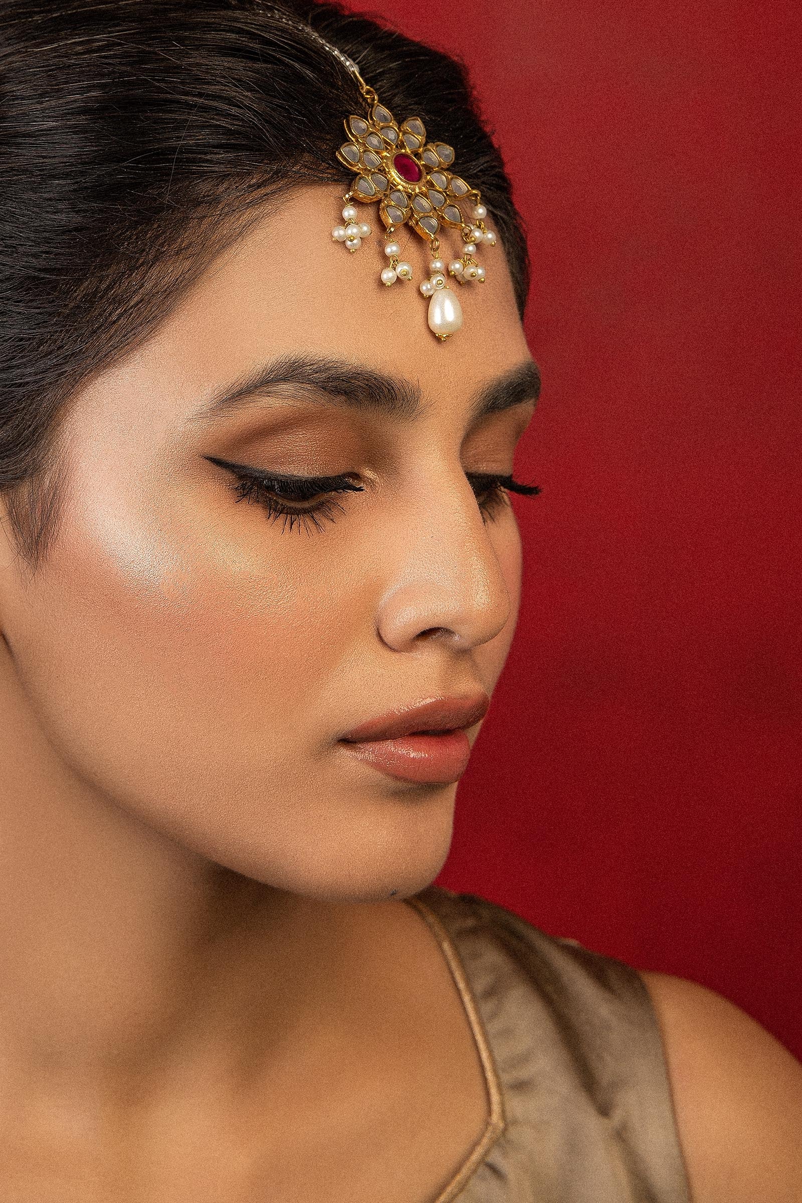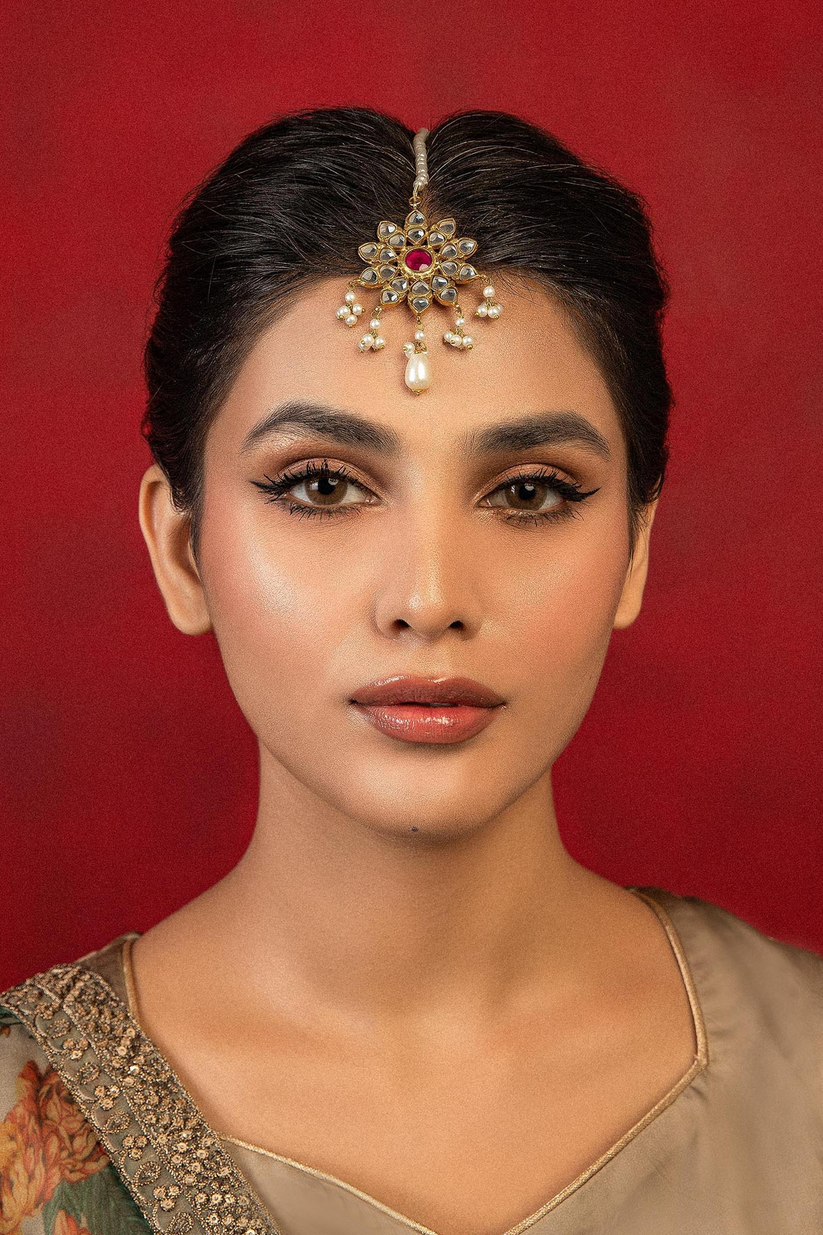 Shine bright in our tikka handcrafted in red onyx white handcut glass stones, pearl piroyi with pearl string sahara in a brilliant 21K gold plated finish. Alloy metal