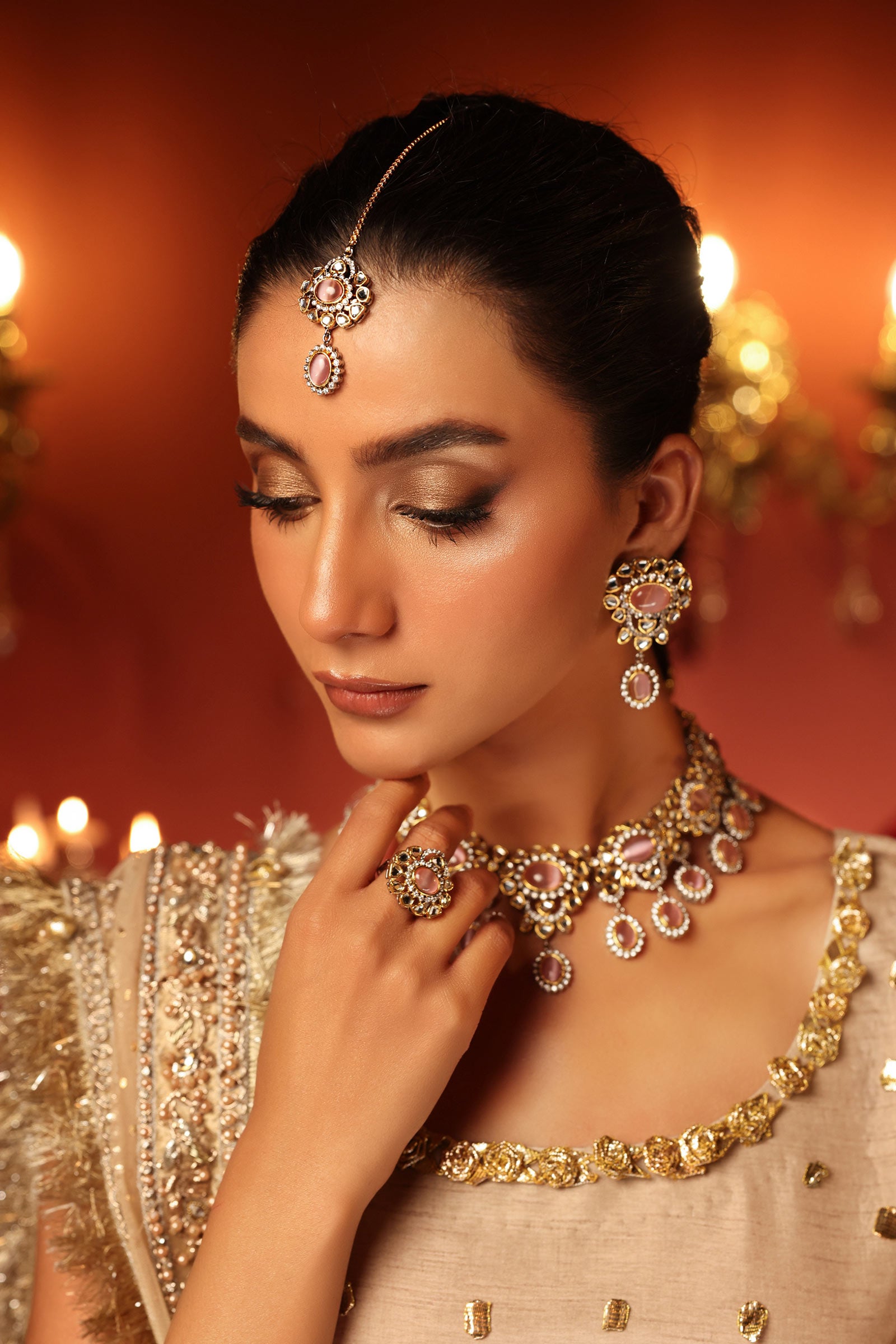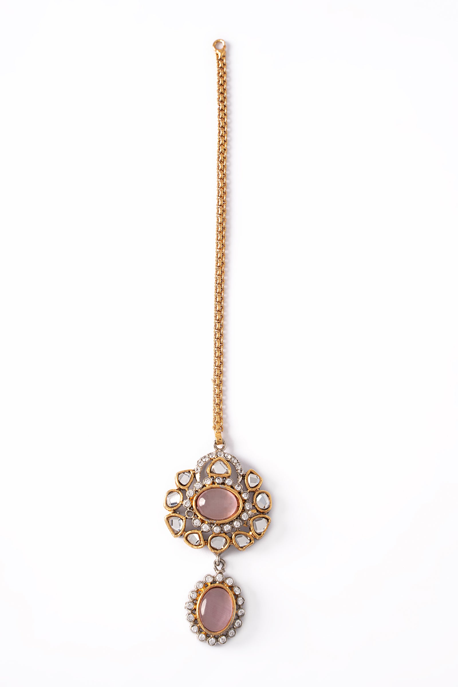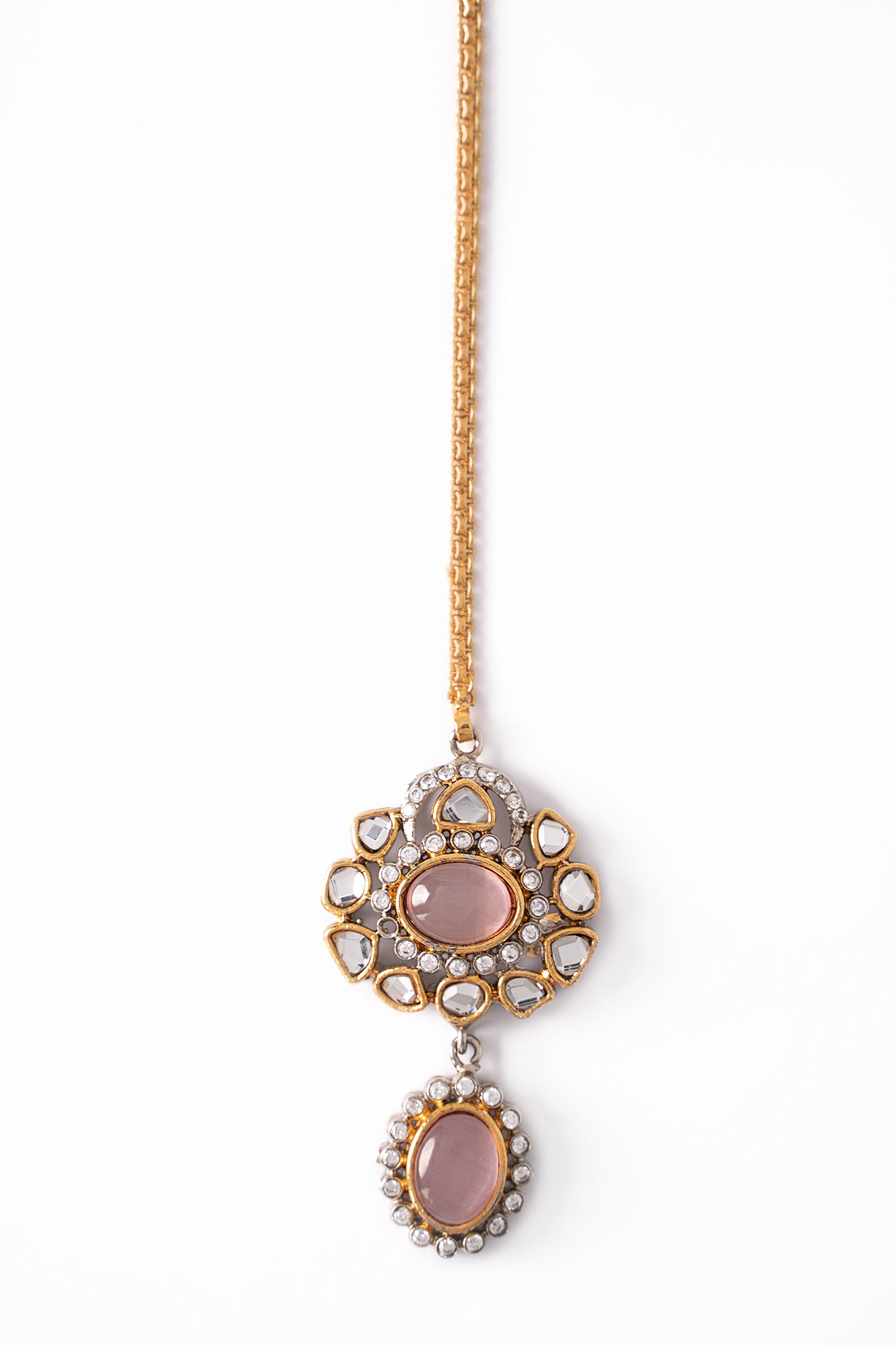 Single-stranded Sultana Bridal Tikka set showcases handcut glass stones with pink cats eye and white zircons artistry for brides to look exceptionally elegant and fashionable for their big day.Finish: Gangajamni (21K Gold & Silver Plated)Product Care: Wipe Clean