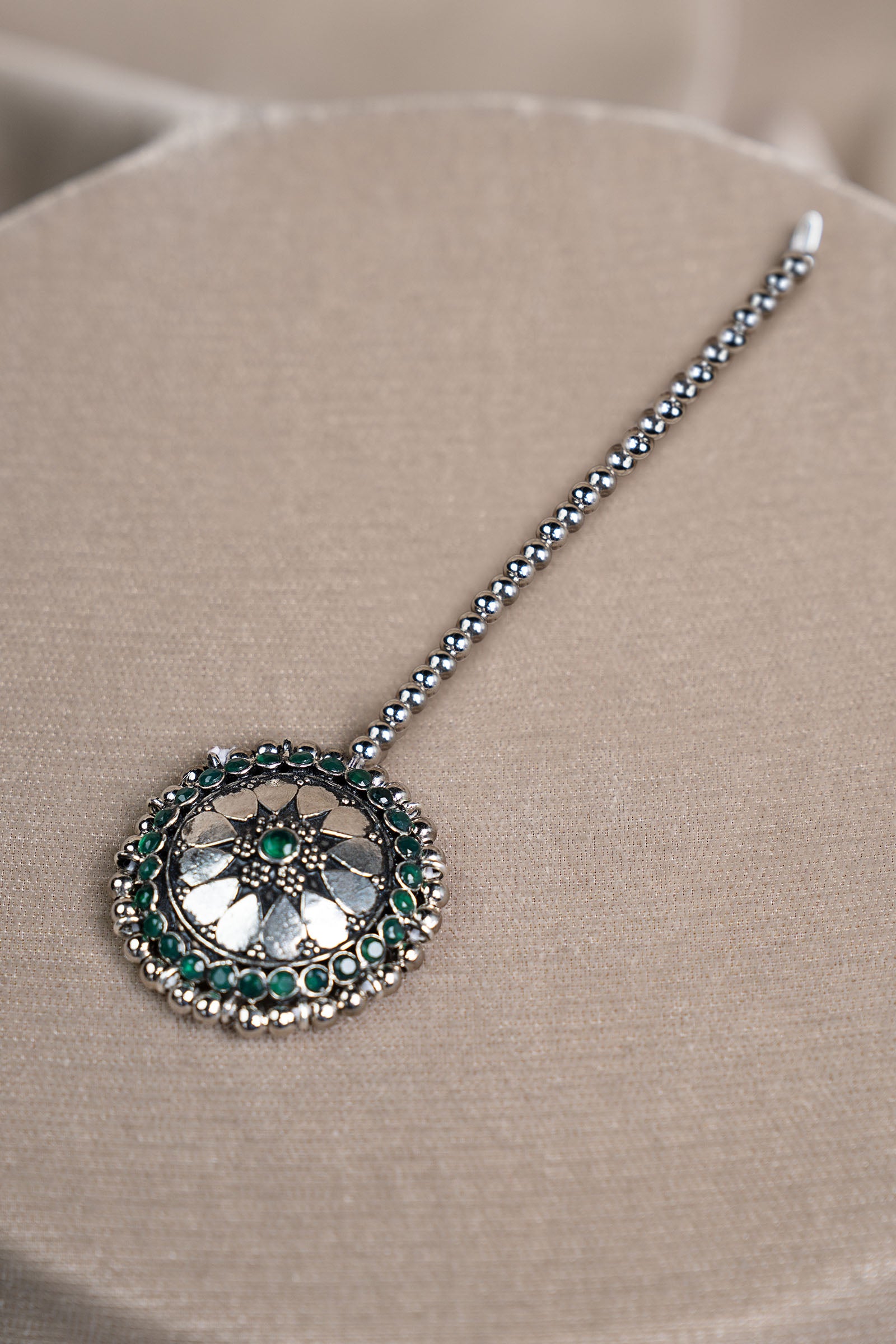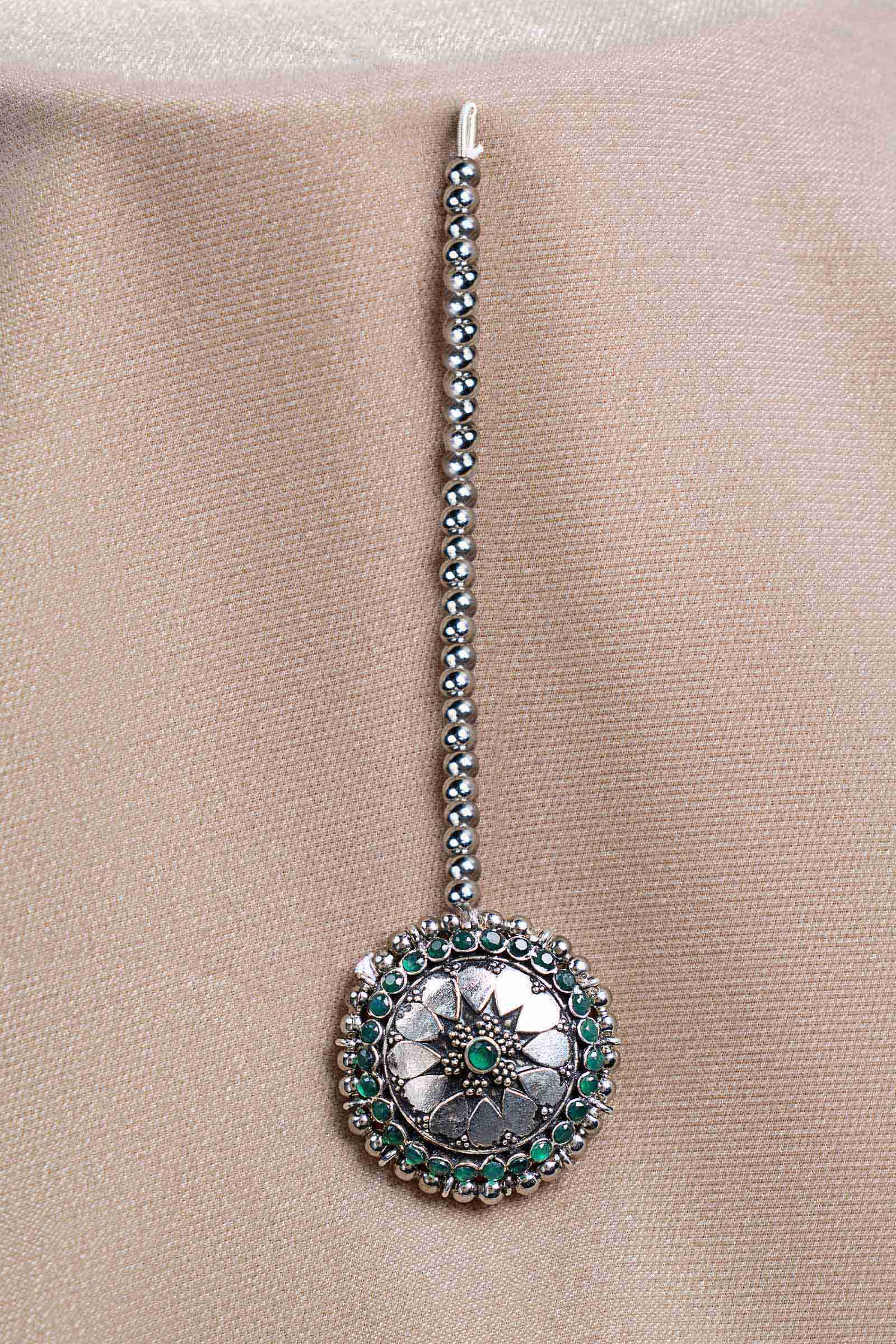 A crown of artistry - this tikka blossoms with intricate craftsmanship at its heart, embraced by deep green onyx that lends regal depth. Soft grey pearl piroi sway gracefully beneath, paired with a delicate sahra, creating movement that catches the light with every gesture. Poetic and elevated, it transforms festive elegance into a statement of timeless glamour.