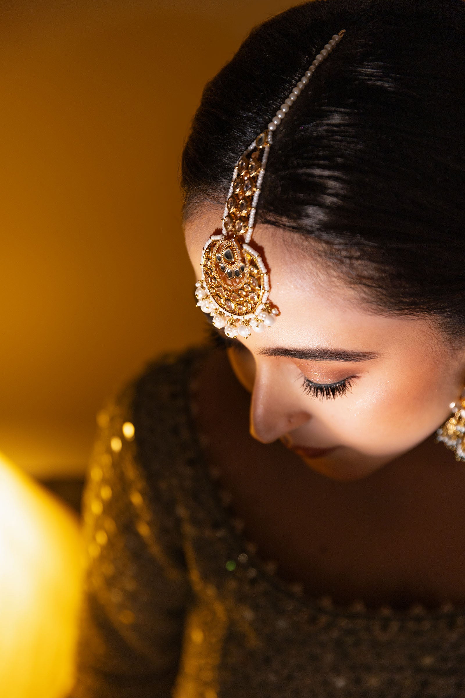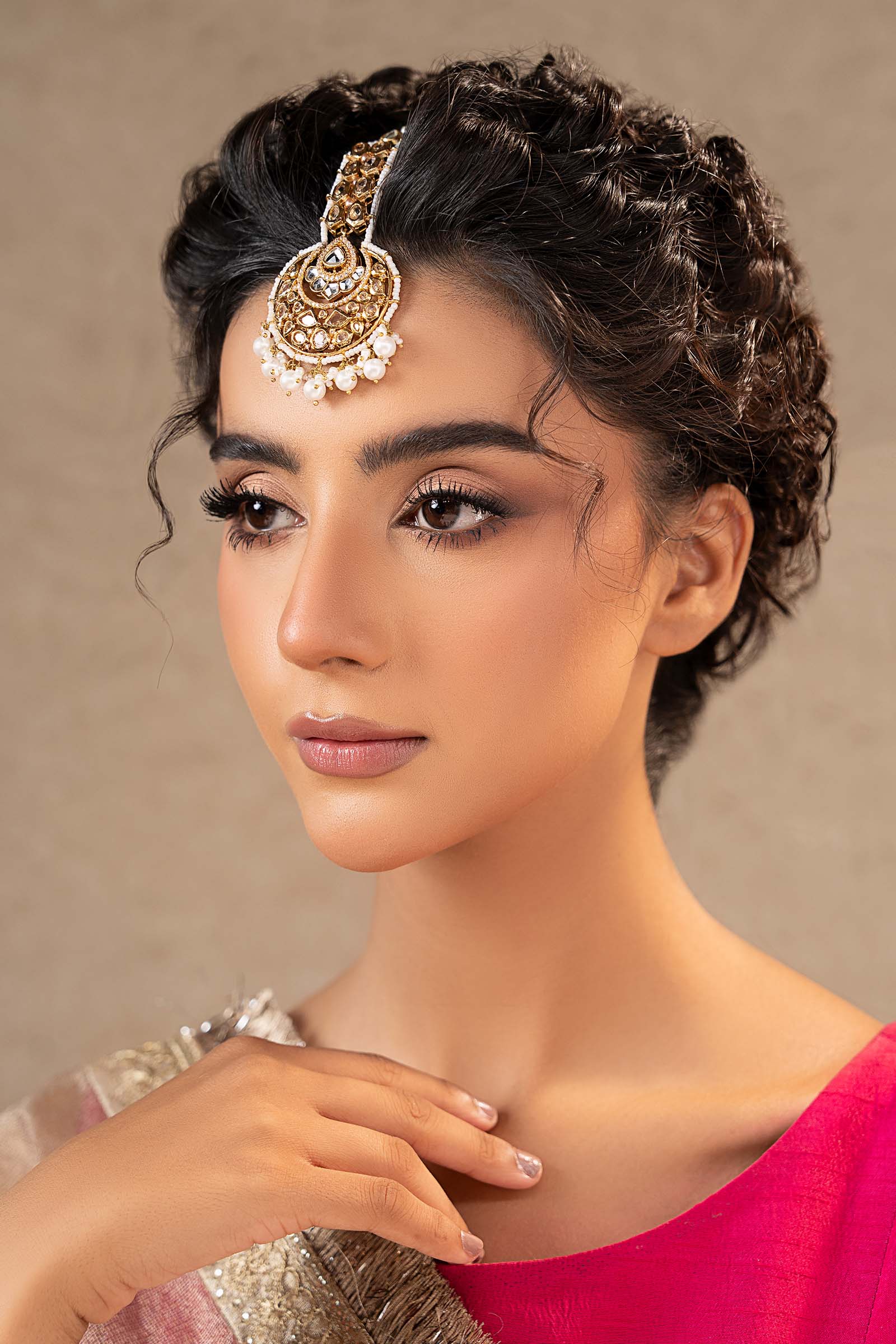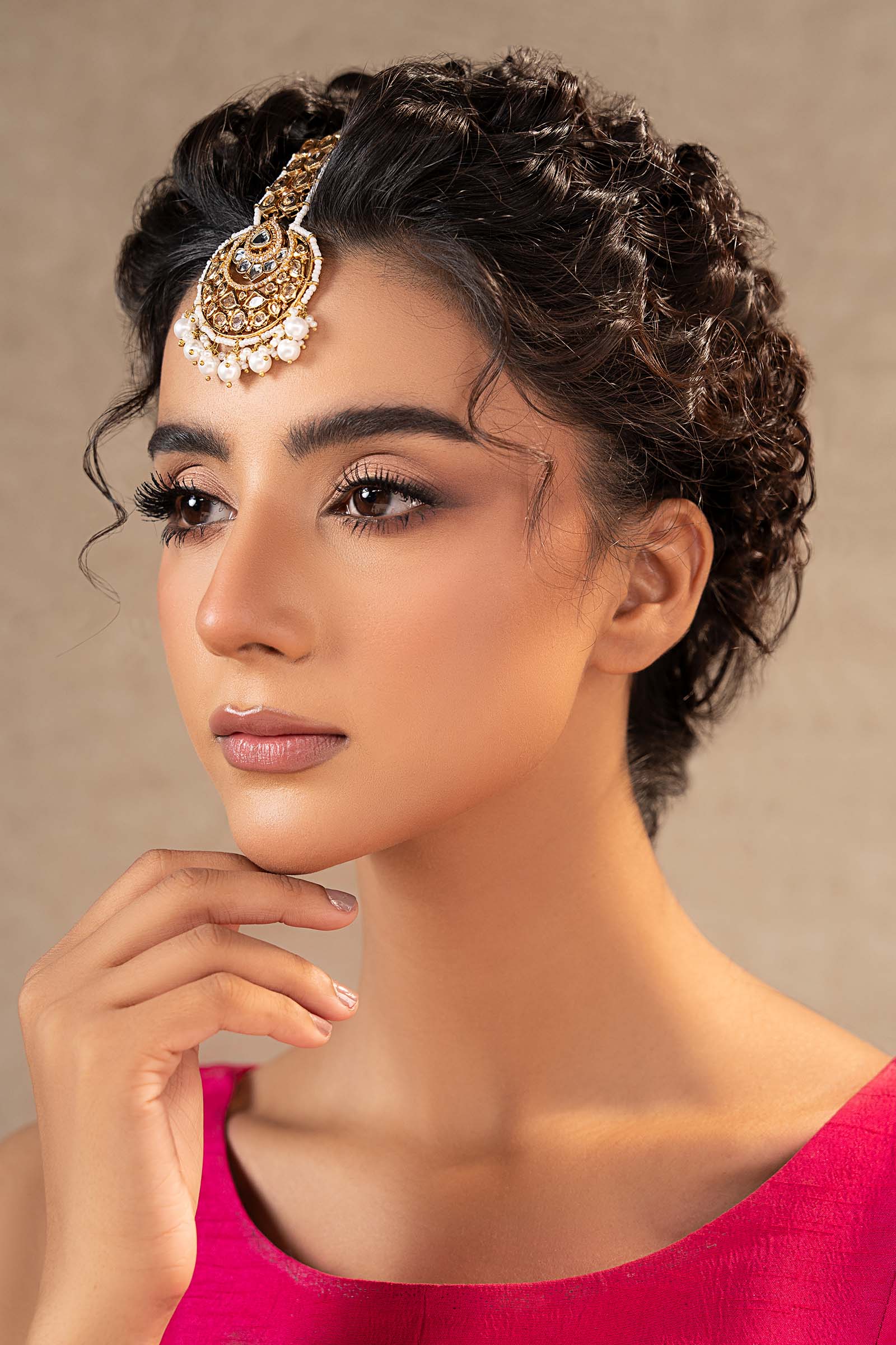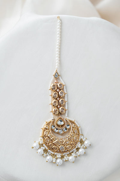 This exquisite tikka shines with the pure sparkle of white handcut glass and glittering zircons, paying obeisance to ageless tradition. Finished with pearl pyroi detailing, Indian poth accents, and exquisite white pearl hangings, this poetic piece is designed to add timeless charm and carefree elegance to your festive ensemble.