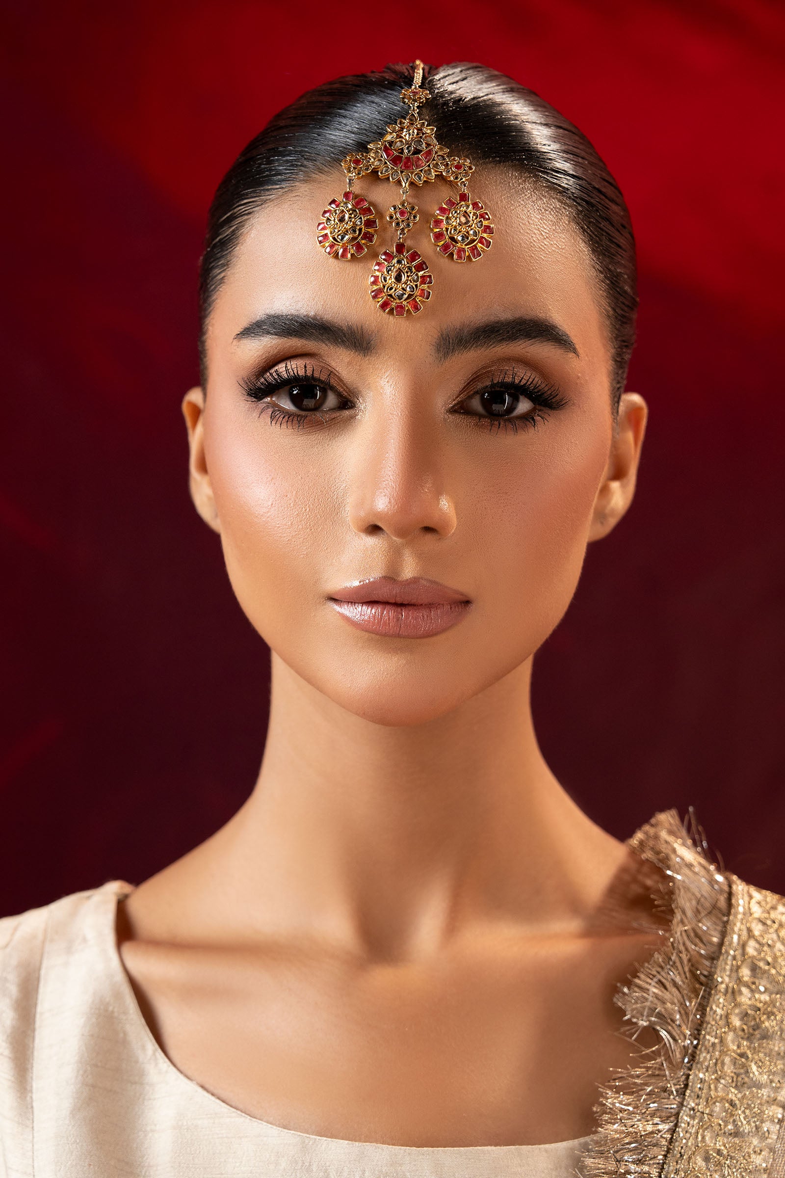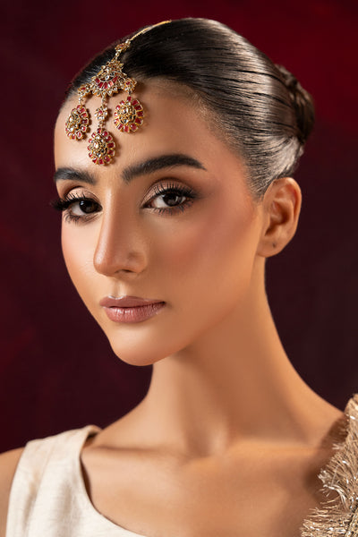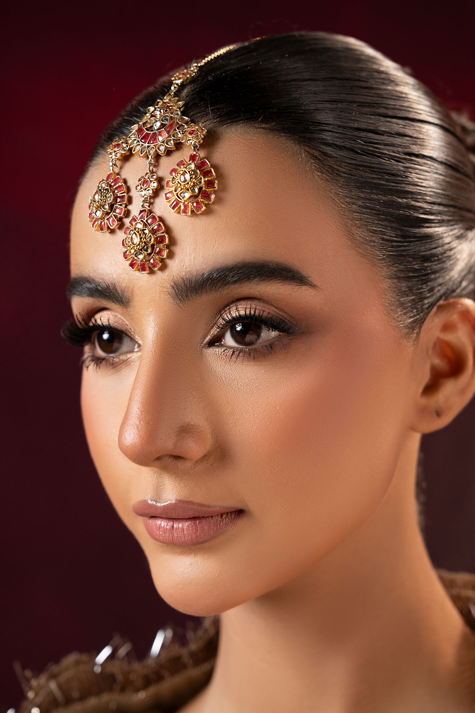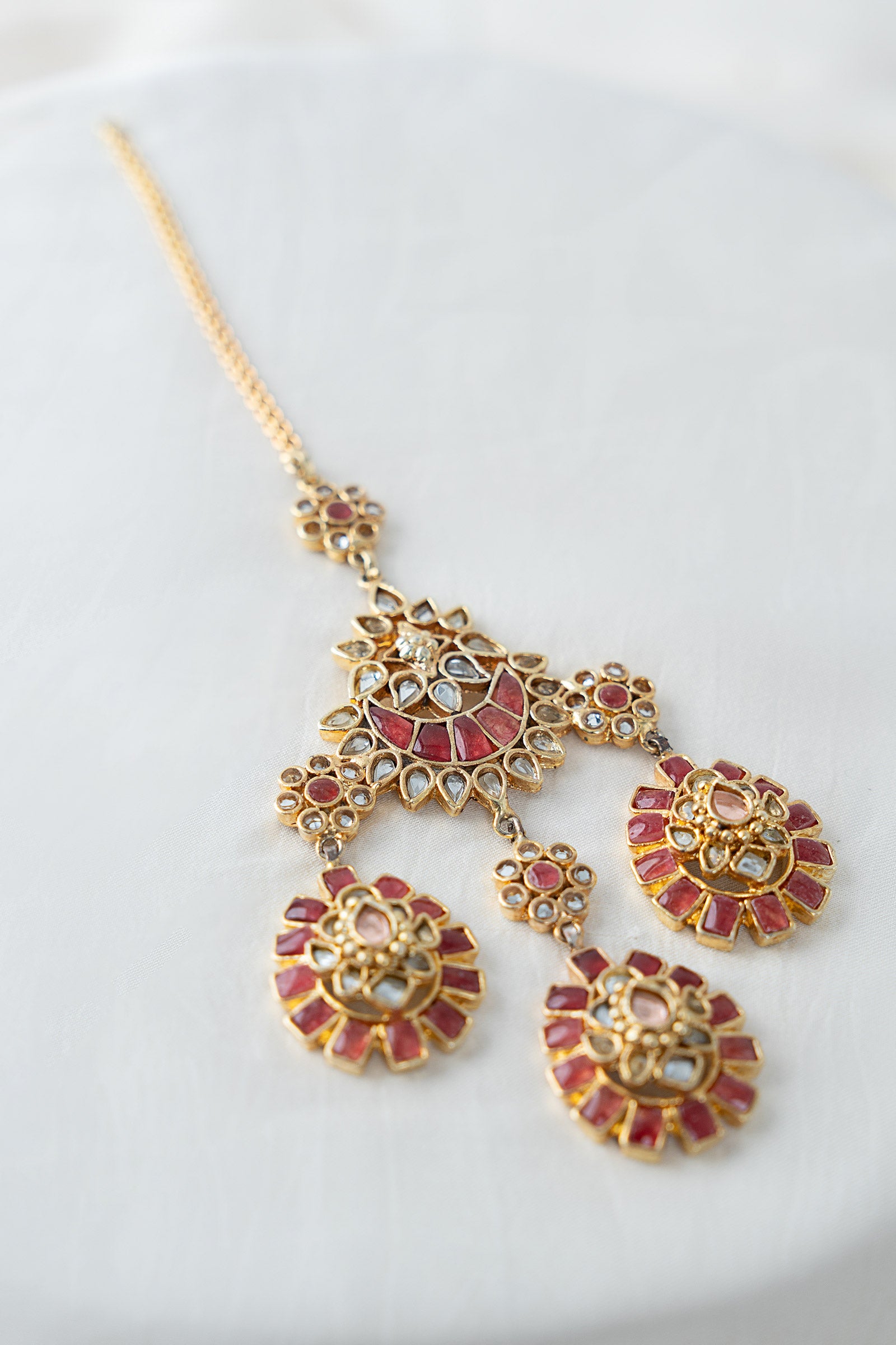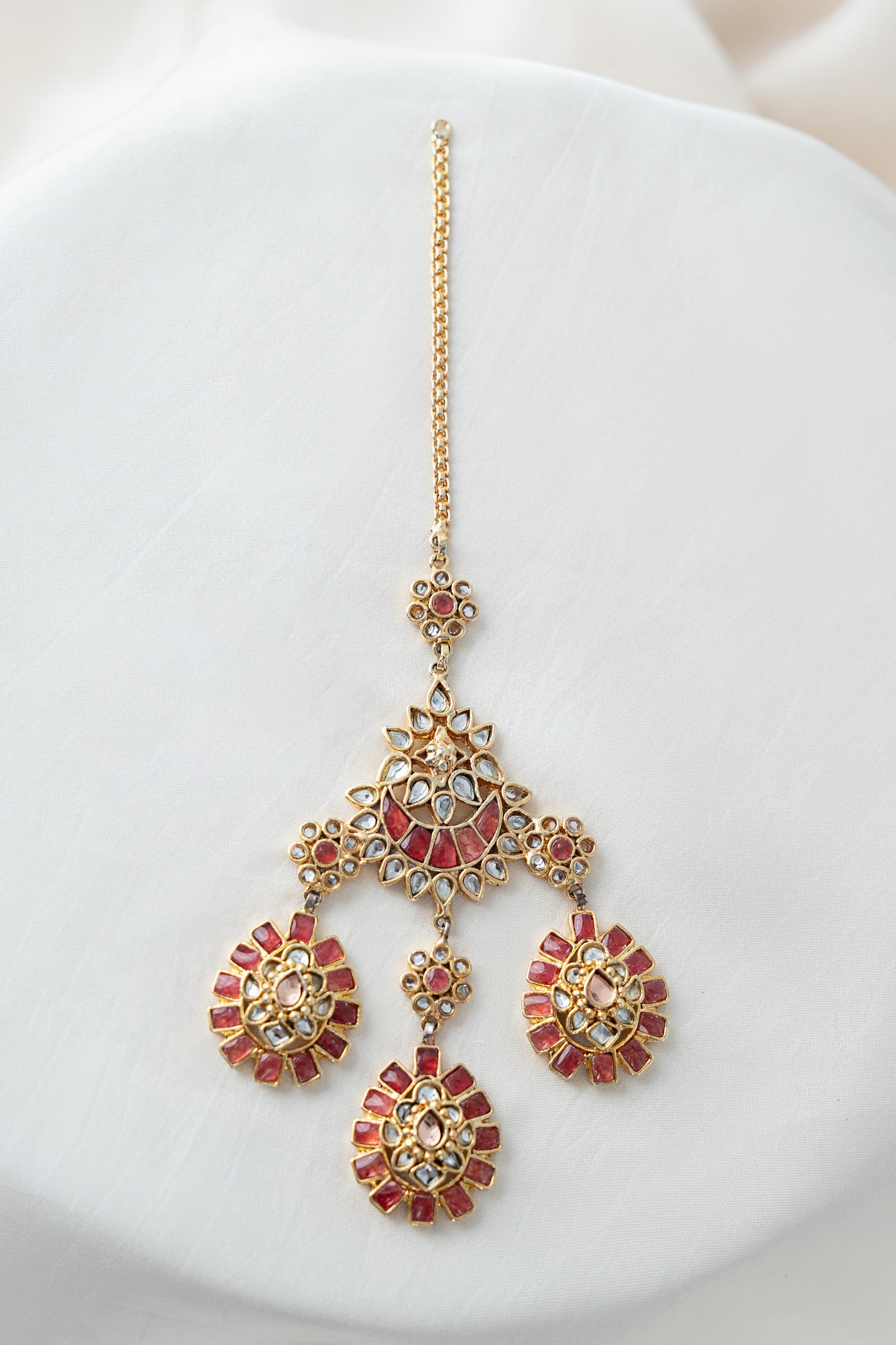 This timeless tikka combines the bright dazzle of white handcut glass with the delicate blush of pink onyx, creating a blend of classic charm and subtle elegance. It embodies the elegance of tradition with a dash of poetic refinement, making it a charming addition to celebrations.