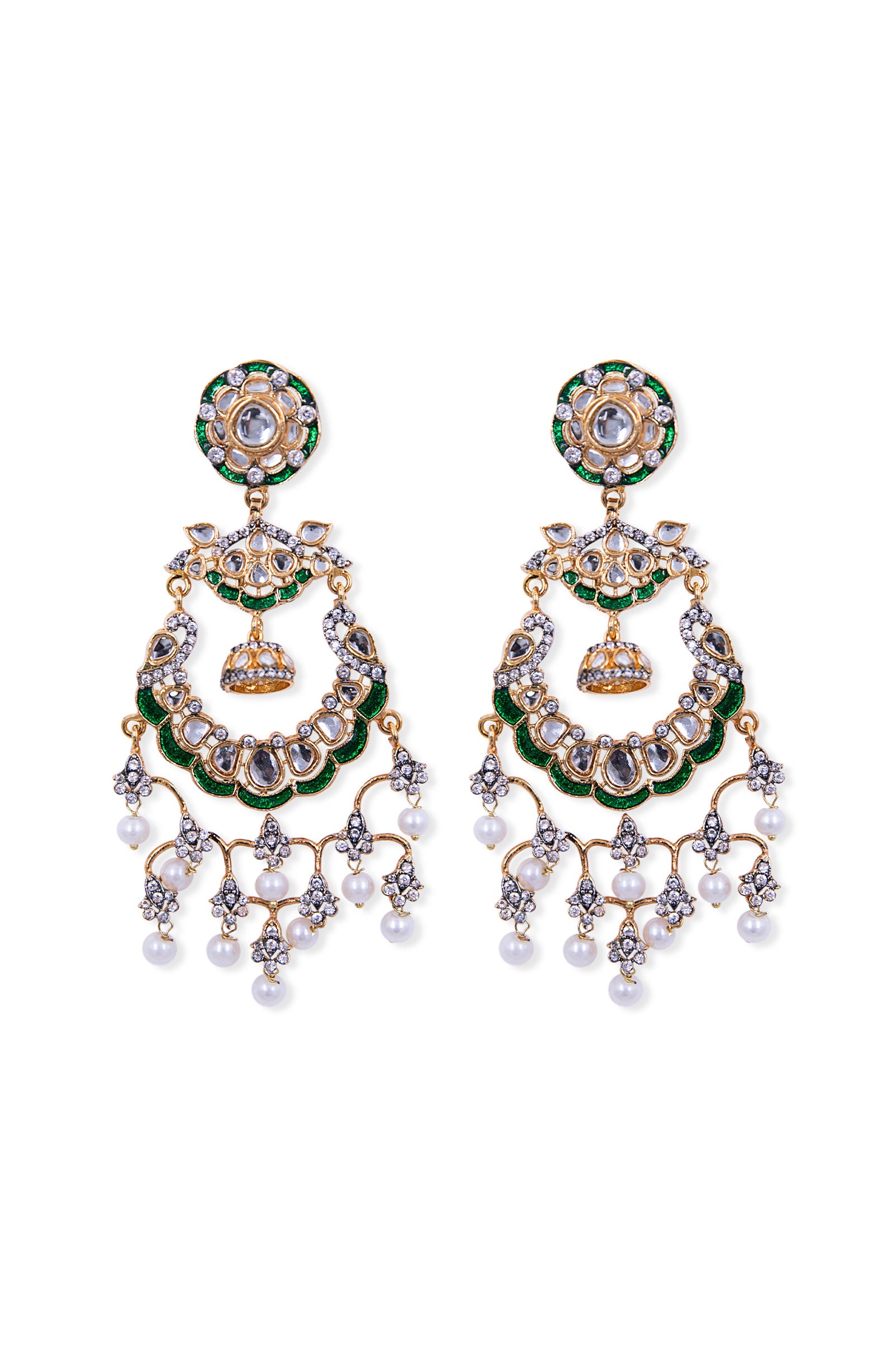 Elevate your festive wardrobe with classic 'Kundan Chandbali Earrings', embodying the essence of celebration with the richness of delicate hand-cut stones and green Meena eloped in a stunning setting of white pearls and zircons emulating sheer class and effortless elegance. Finish: 21K Gold & Silver Plated Back Pin: Sterling Silver Stud Product Care: Wipe Clean