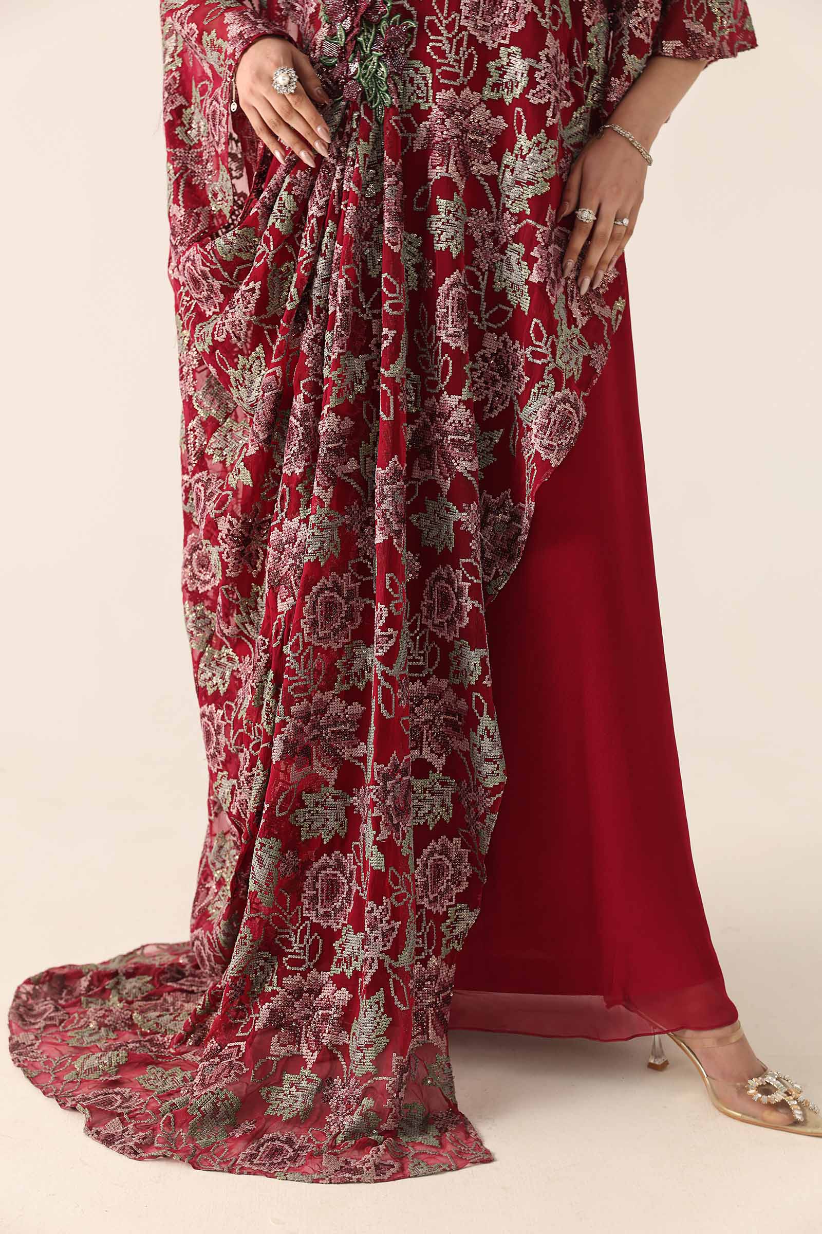 Shirt: Multi-Thread Cross-Stitch Embroidery Technique With Sequin Under Laying Back: Multi-Thread Cross-Stitch Embroidery Technique With Sequin Under Laying Spray Dupatta: Multi-Thread Cross-Stitch Embroidery Technique With Sequin Under Laying Spray & Scalloped Border Fabric: Chiffon Color: Dark Fuchsia