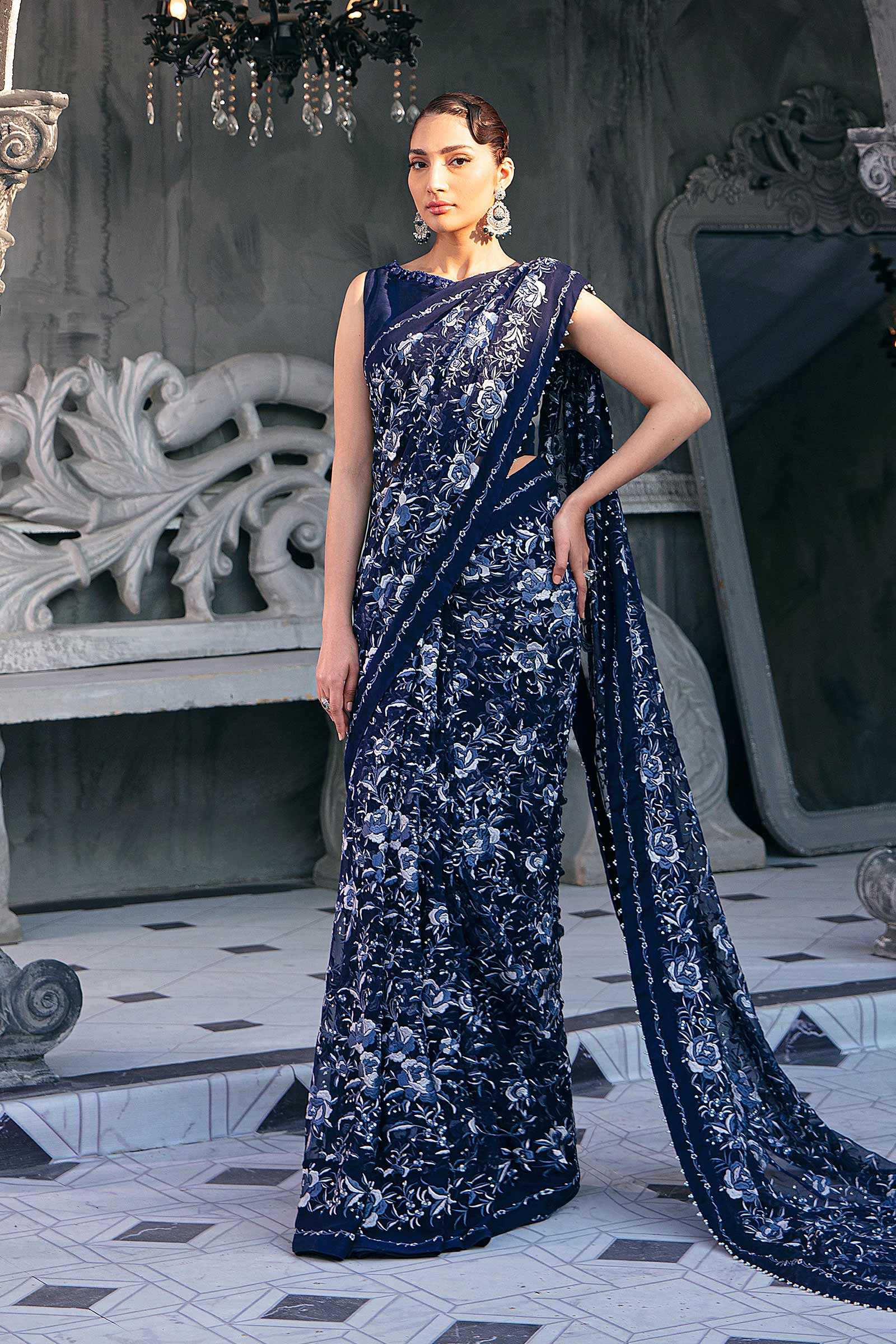 Shirt FabricGara Themed Embroidery With Dainty Sequins DetailingColor: Navy BlueFabric: ChiffonAdditional FabricTrouserDyeable TrouserColor: WhiteFabric: PK Raw SilkDupattaDyeable DupattaColor: WhiteFabric: Bemberg ChiffonNote: Only Dry CleanNote: M. Luxe cannot be Returned / Exchanged.