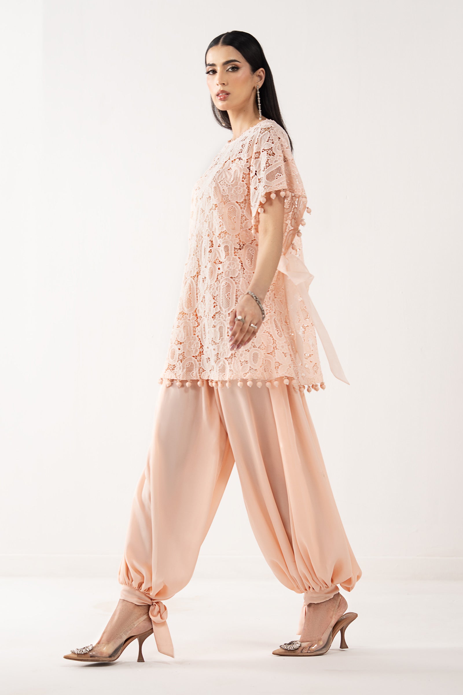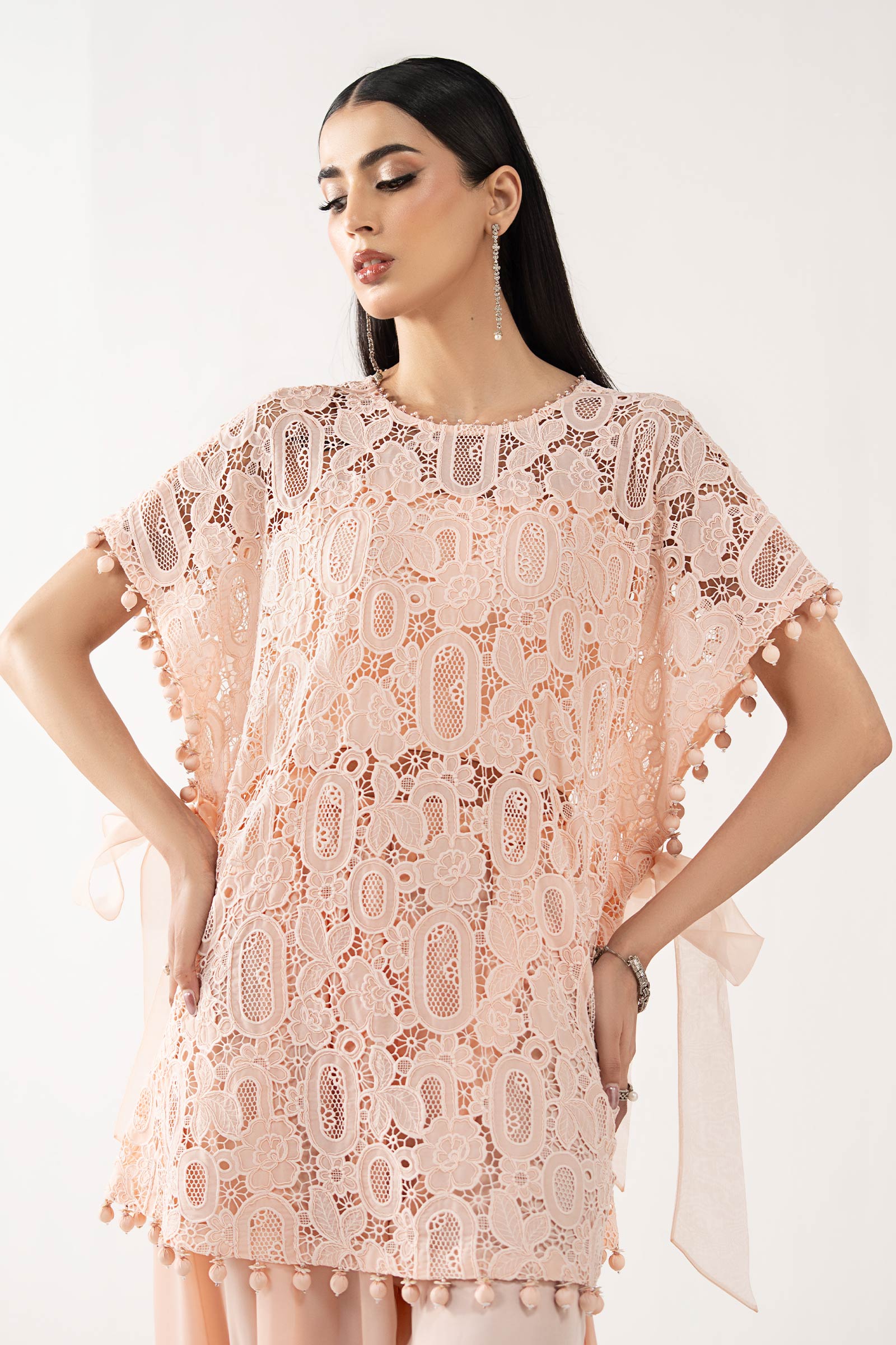 Shirt: Schiffli Laser Floral Embroidery With Cutwork & Dori Detailing Fabric: Georgette Color: Pastel Peach