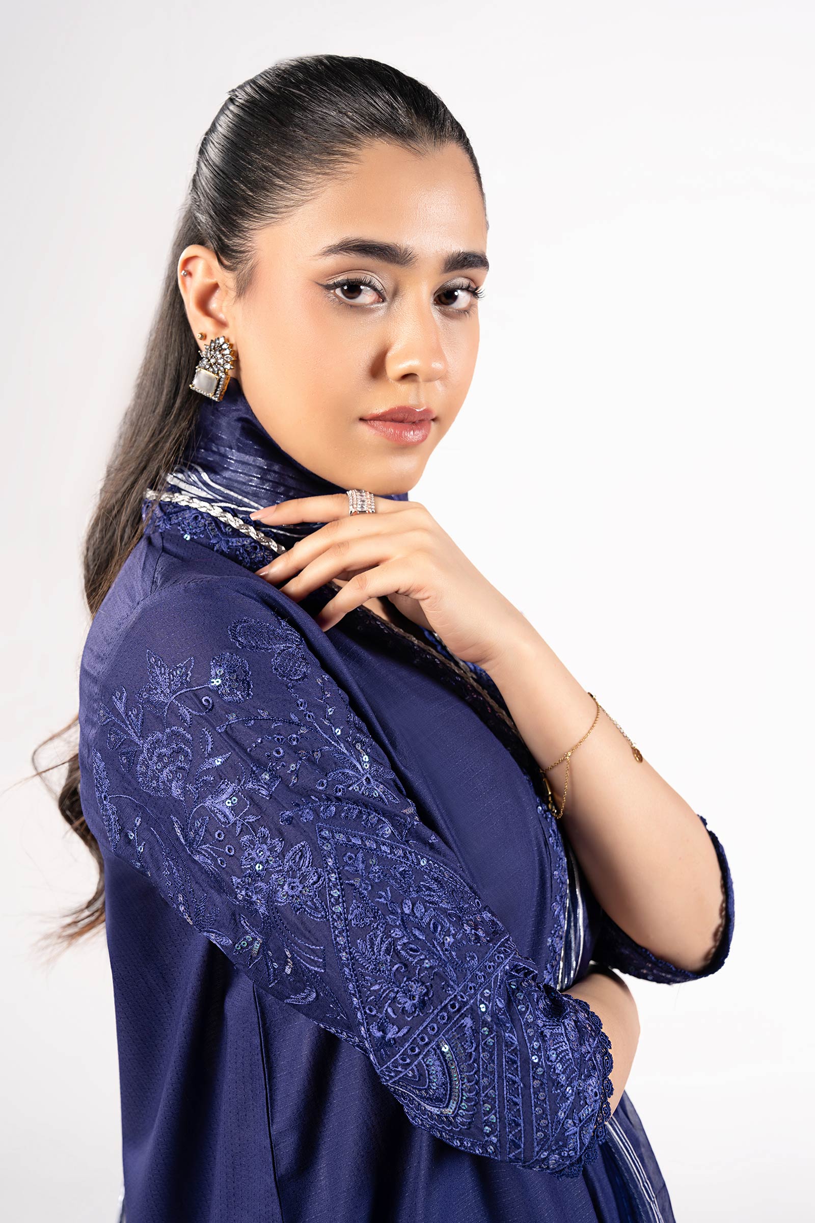 ShirtDyed Short ShirtEmbroidered Overlap NecklineEmbroidered BorderEmbroidered Half SleevesColor: Navy BlueFabric: DobbyFit: RegularShalwarLoose-Fit ShalwarElasticated WaistbandColor: Navy BlueFabric: DobbyFit: RegularDupattaDyed DupattaTwo-Side Lace BordersColor: Navy BlueFabric: Yarn DyedModel is wearing size xsNote: Dry Clean Only