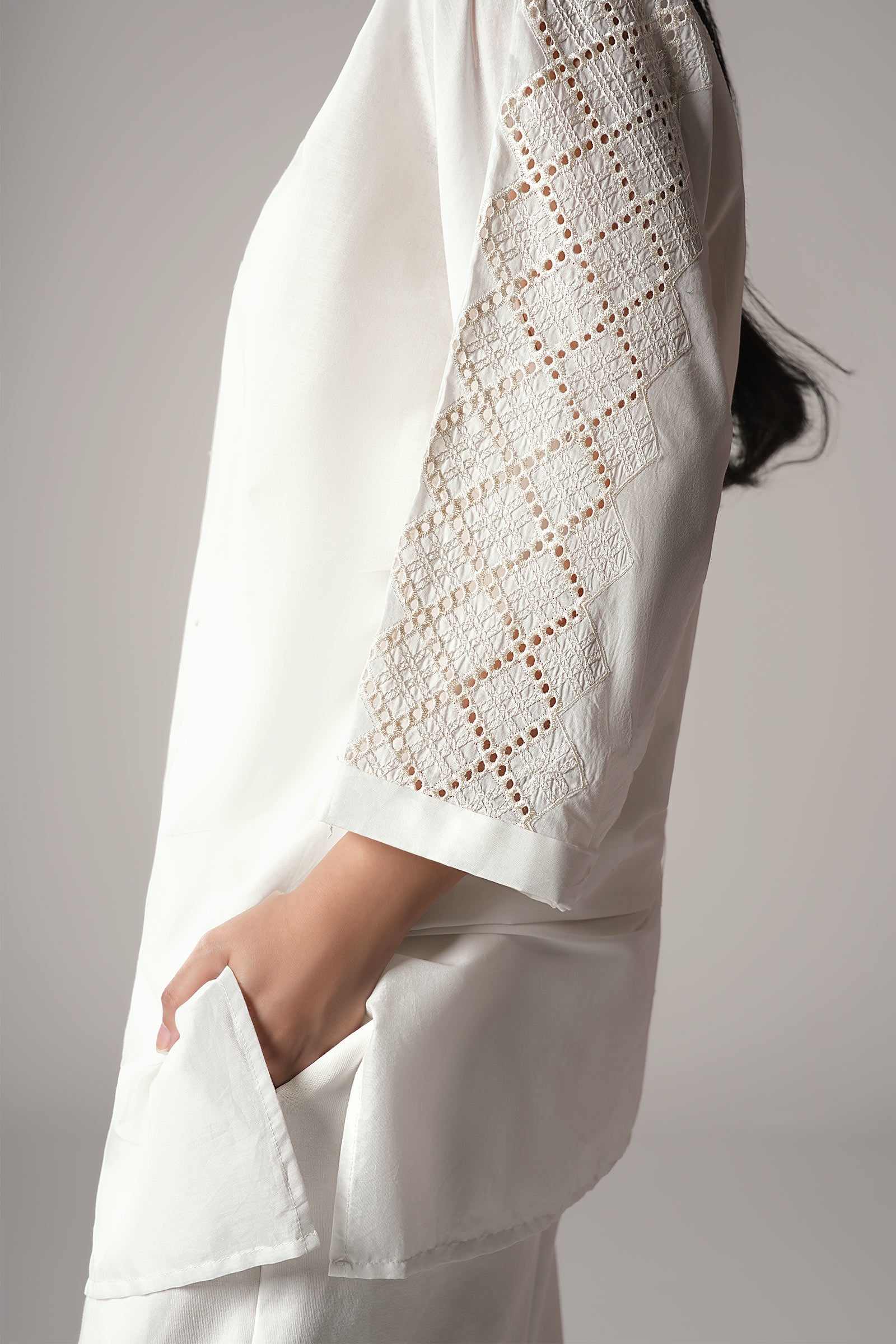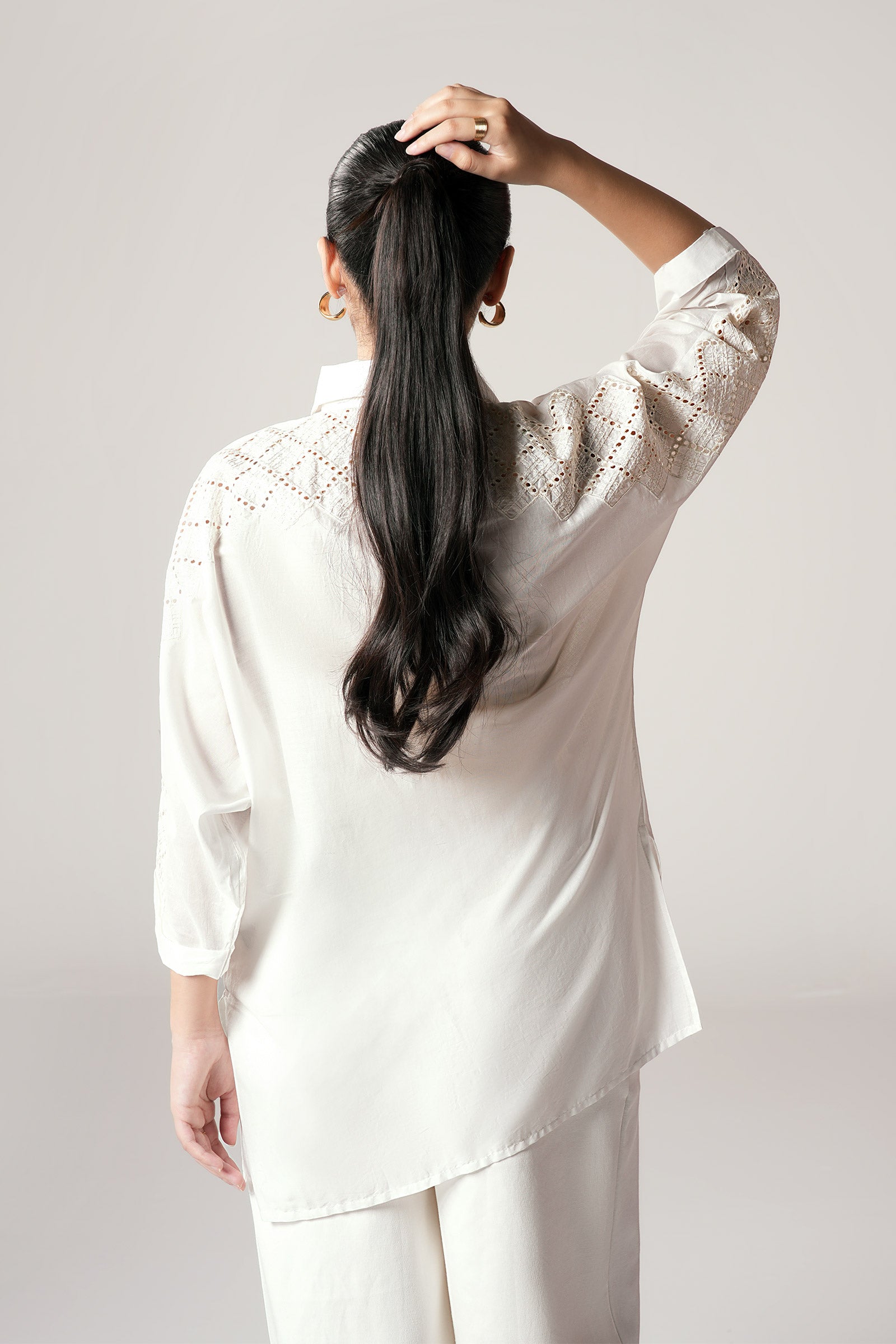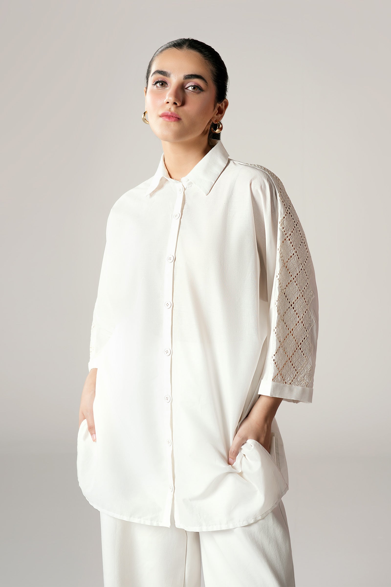 1 Piece - Shirt Dyed Button-Down Short Shirt Color: White Fabric: Lawn Fit: Regular Model is wearing size xs Note: Dry Clean Only
