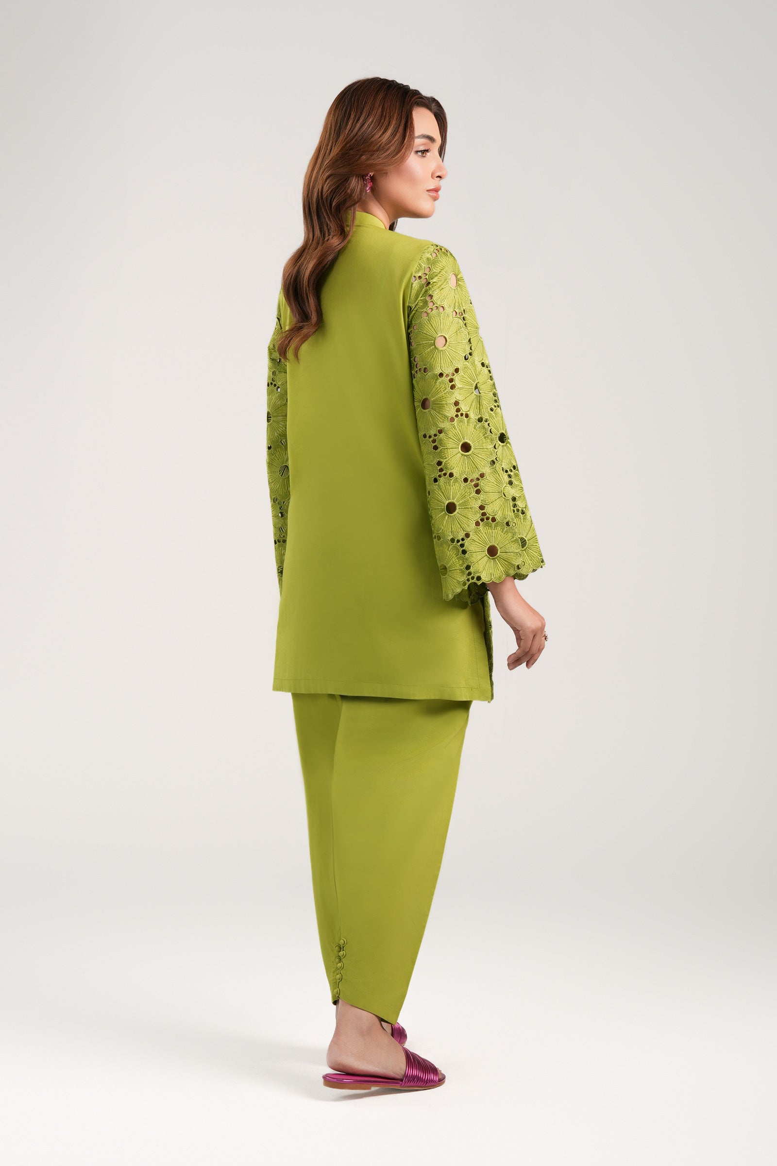 ShirtBan NecklineSchiffli Embroidered FrontSchiffli Embroidered SleevesDyed BackColor: Lime GreenFabric: LawnFit: RegularTrouserDyed ShalwarElasticated WaistbandLoop Buttons Detailing On HemColor: Lime GreenFabric: LawnFit: RegularModel is wearing size xsNote: Dry Clean Only