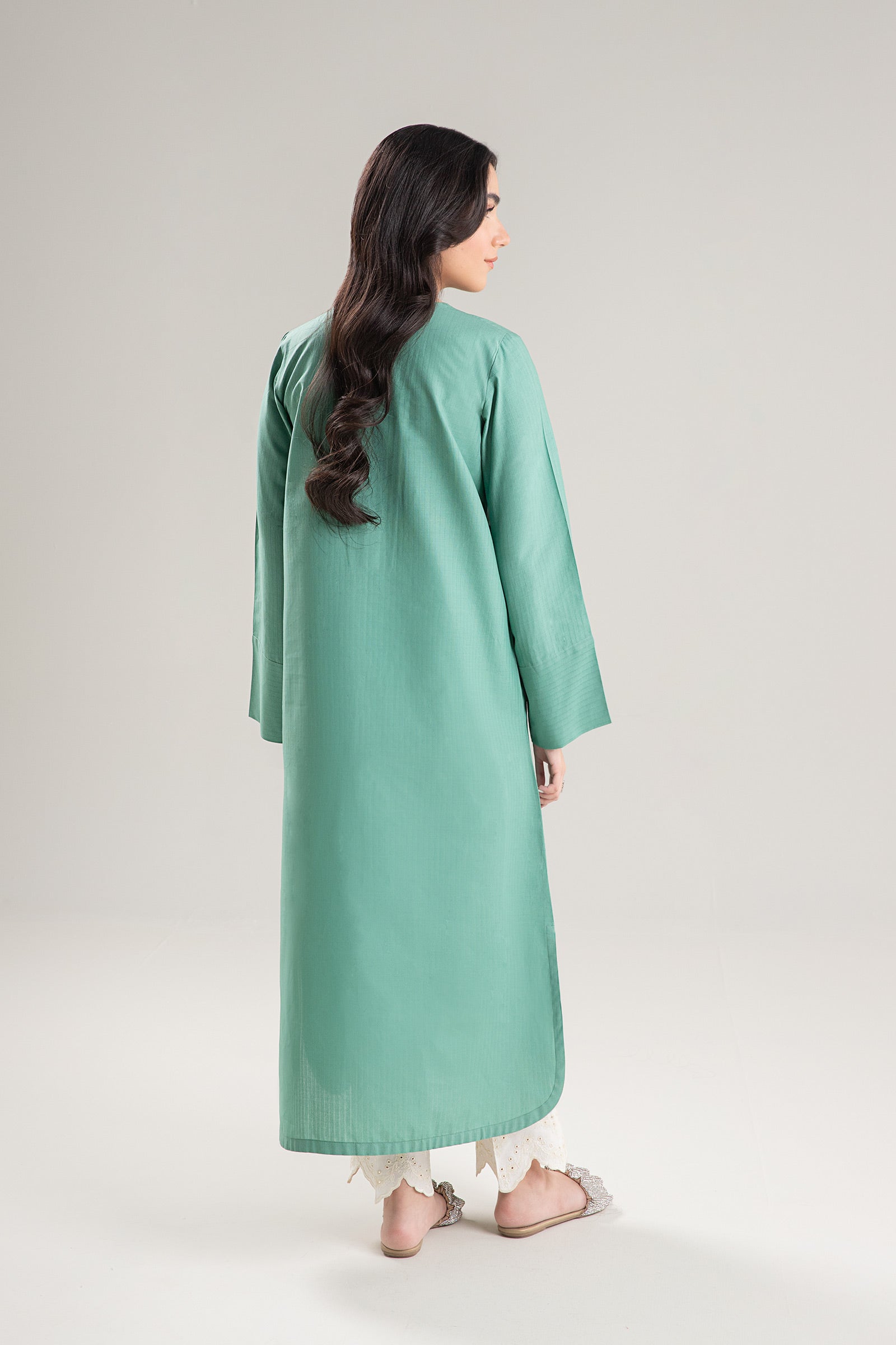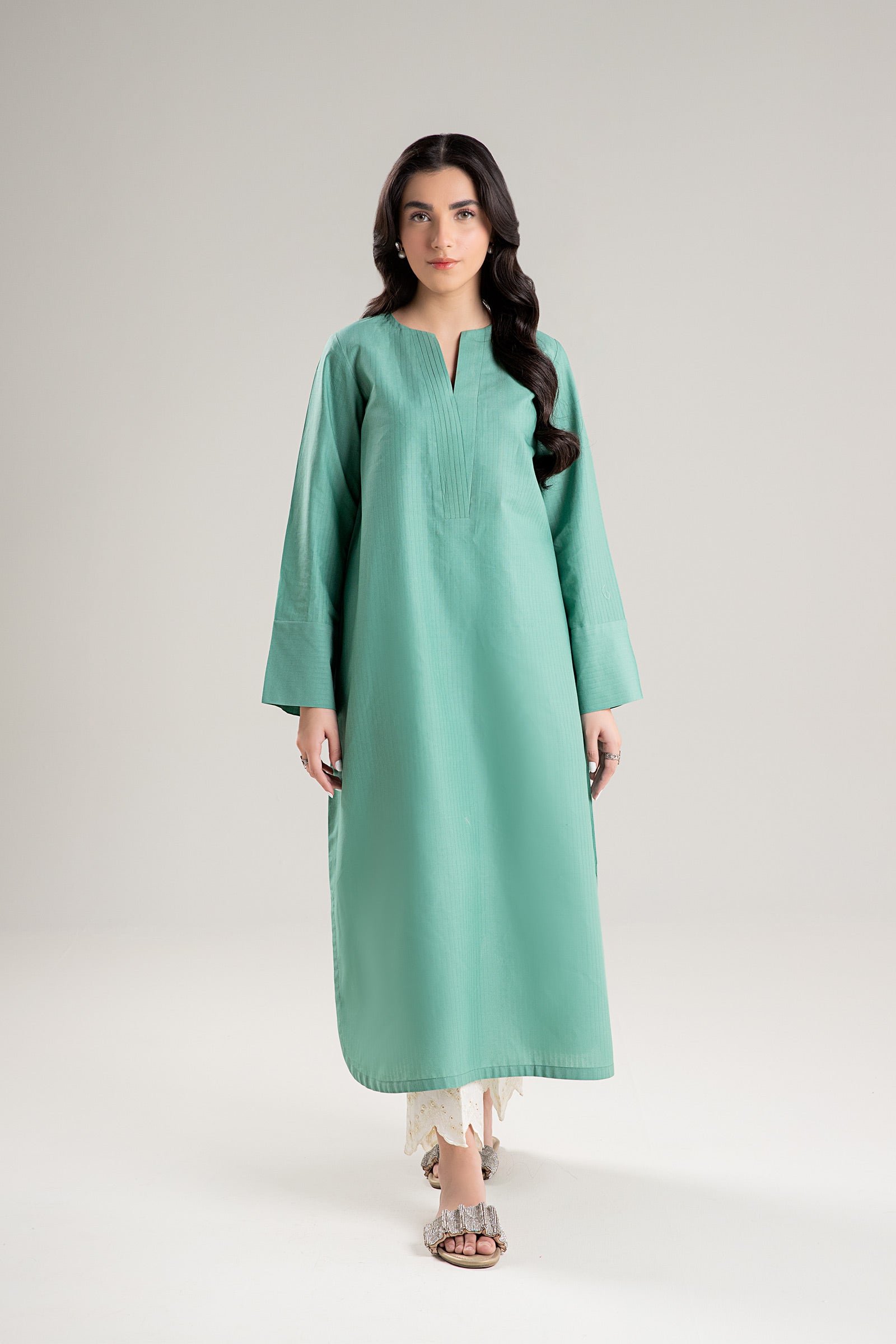 1 Piece - Shirt Dyed Long Shirt Round Neckline With V-Cut Long Sleeves Color: Breeze Fabric: Self Pinstripe Cotton Fit: Regular Model is wearing size xs Note: Dry Clean Only