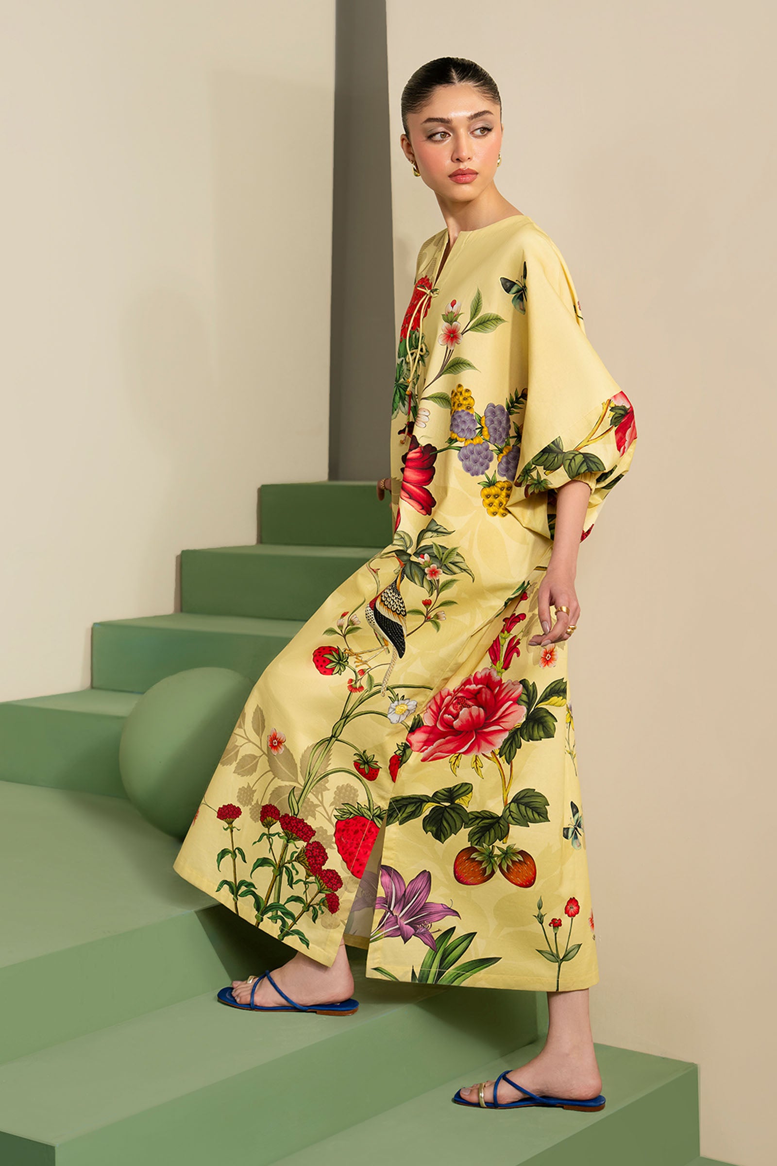1 Piece - Shirt Printed Loose-Fit Shirt Gathered Neckline With Tassel Detailing Three-Quarter Balloon Sleeves With Gathers & Tassel Detailing Color: Lemon Fabric: Lawn Model is wearing xs size Note: Dry Clean Only