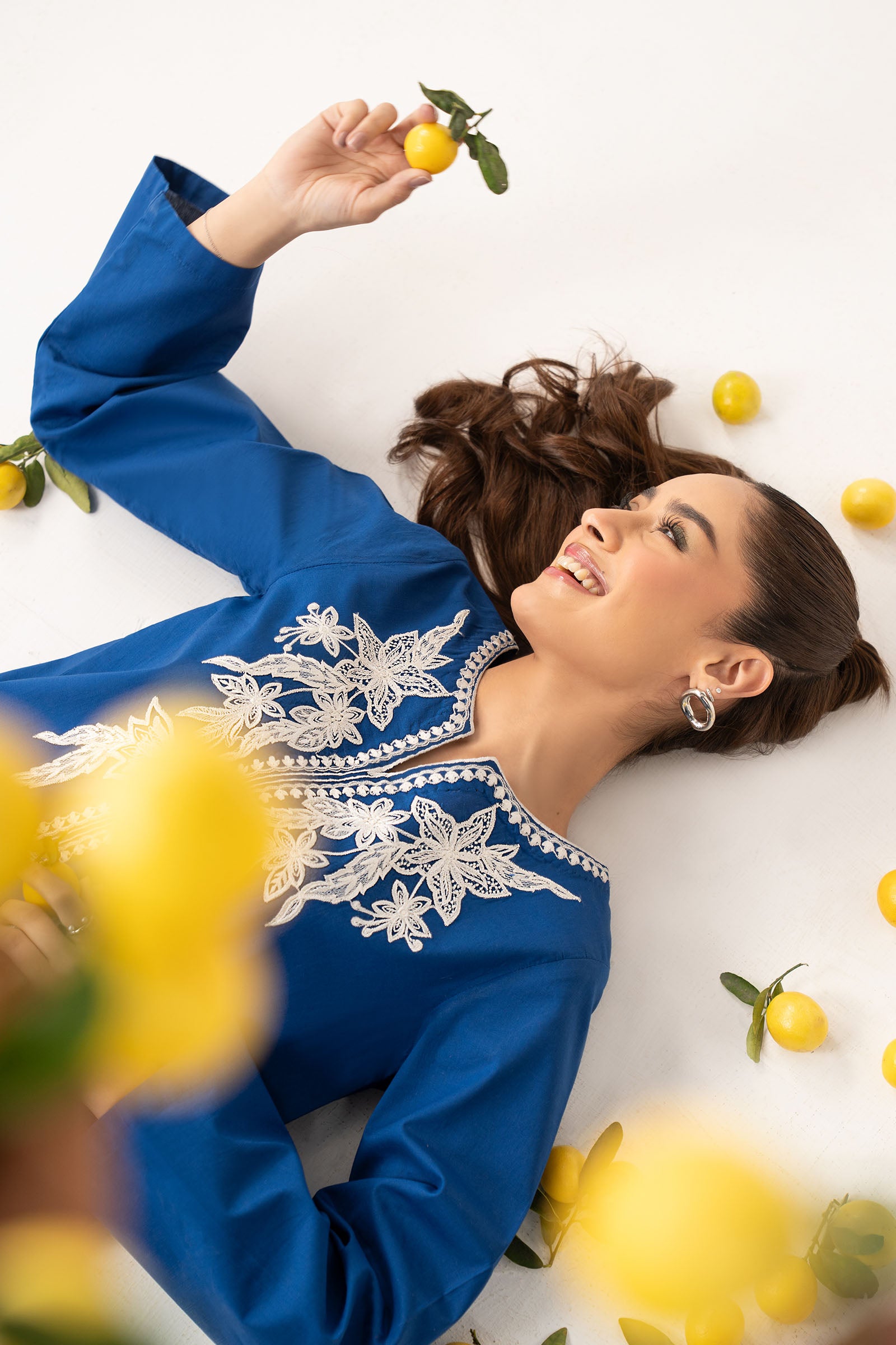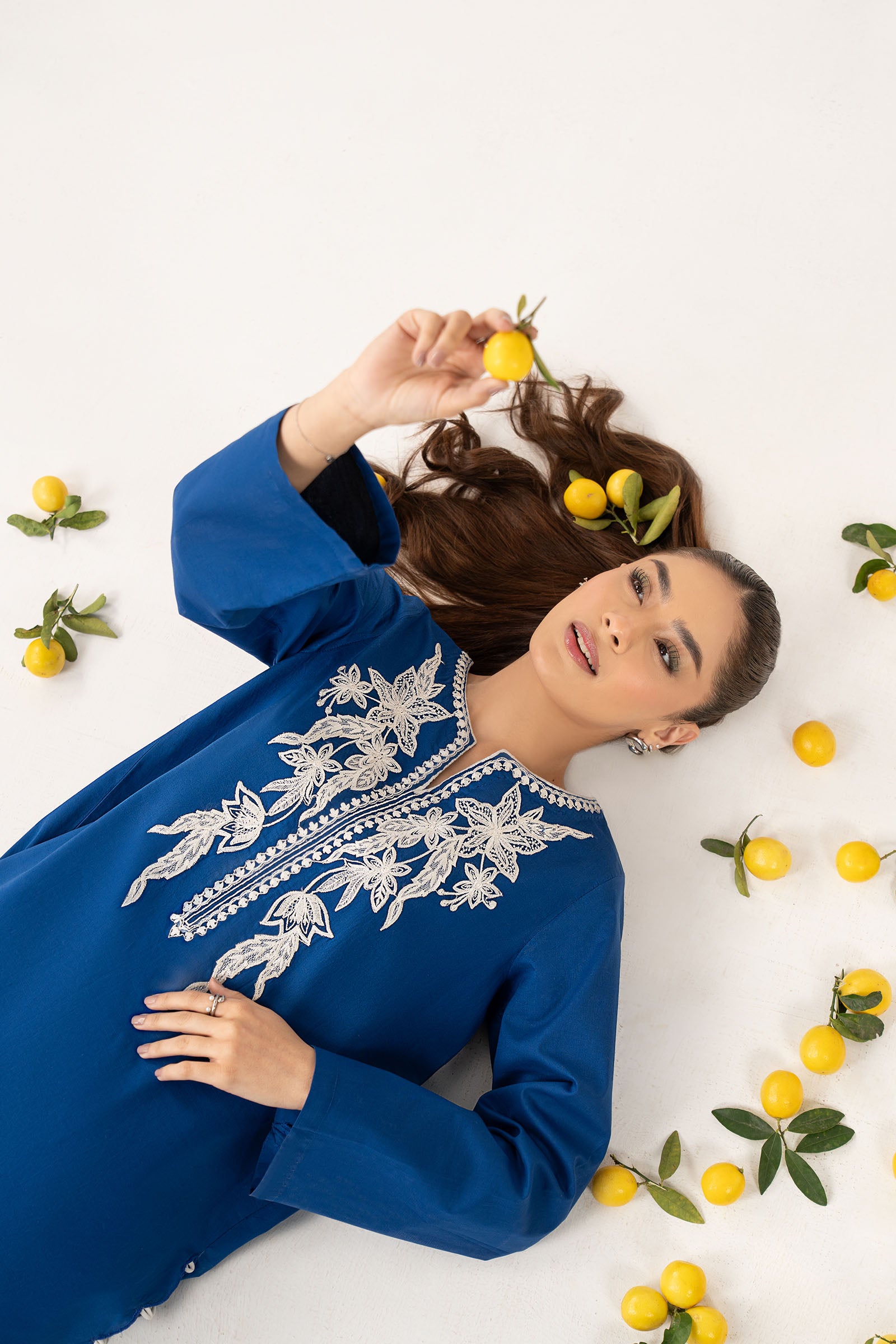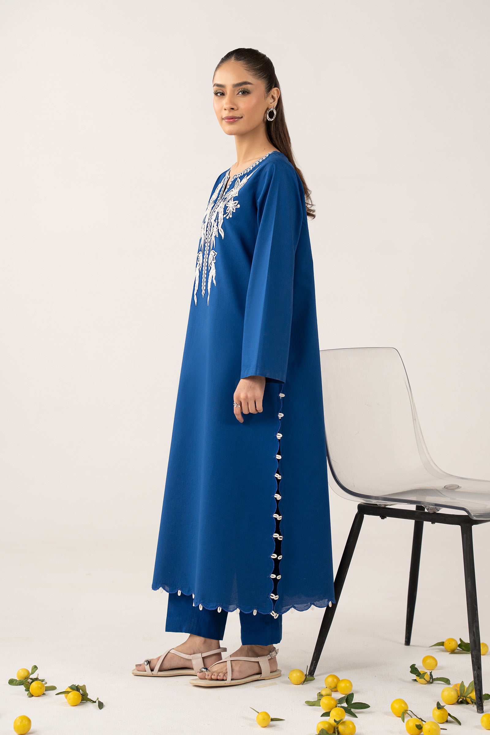 1 Piece - Shirt Straight Shirt Embroidered Neckline Loops Detailing On Side Seams & Hem Straight Sleeves Color: Blue Fabric: Dobby Cotton Model is wearing xs size Note: Dry Clean Only