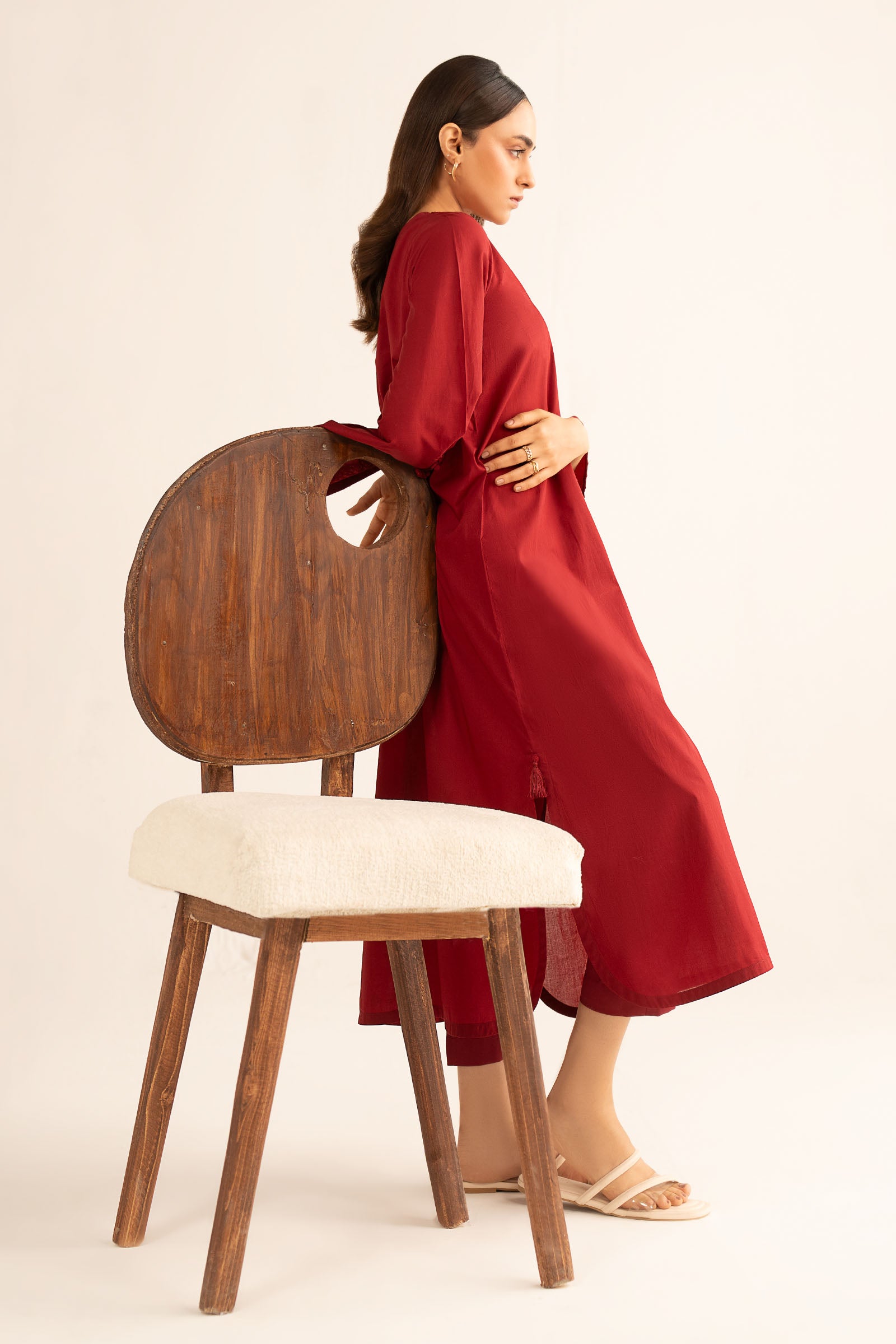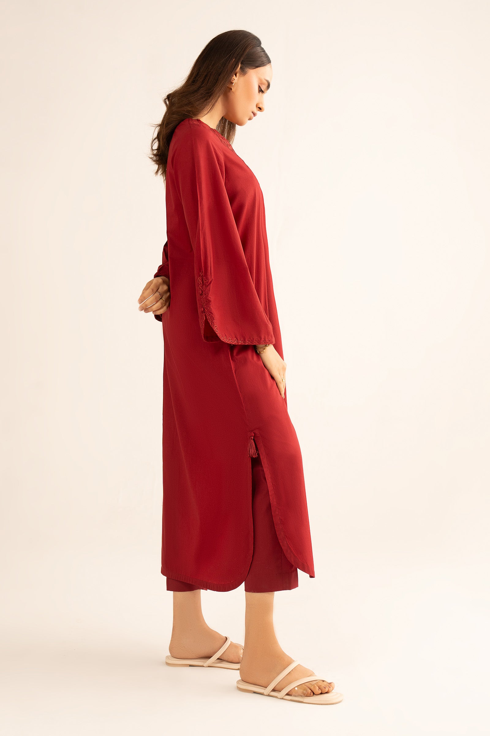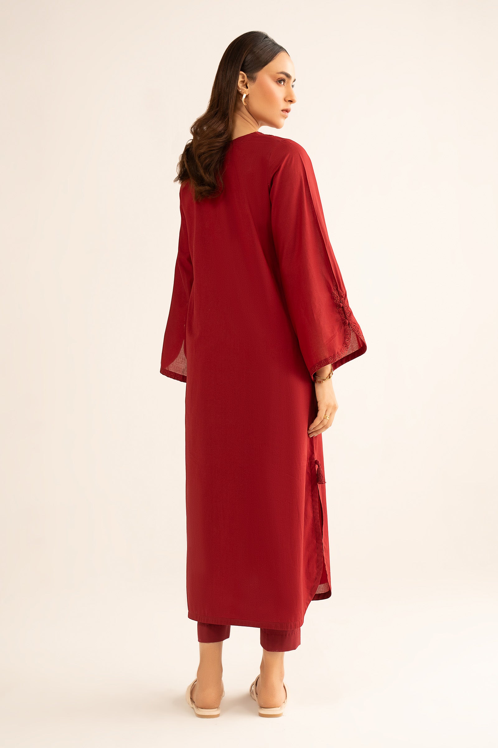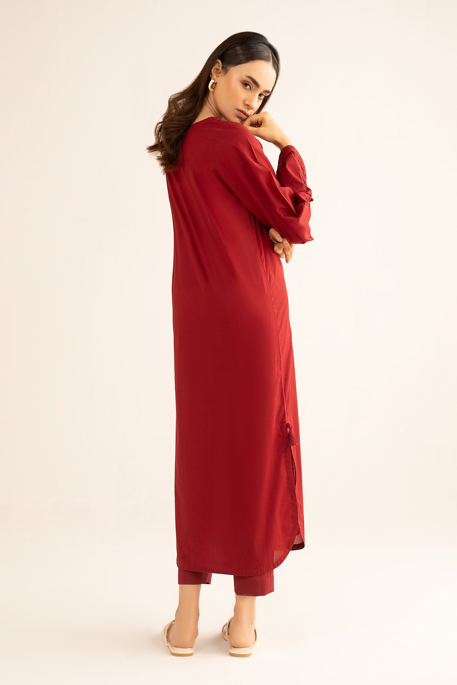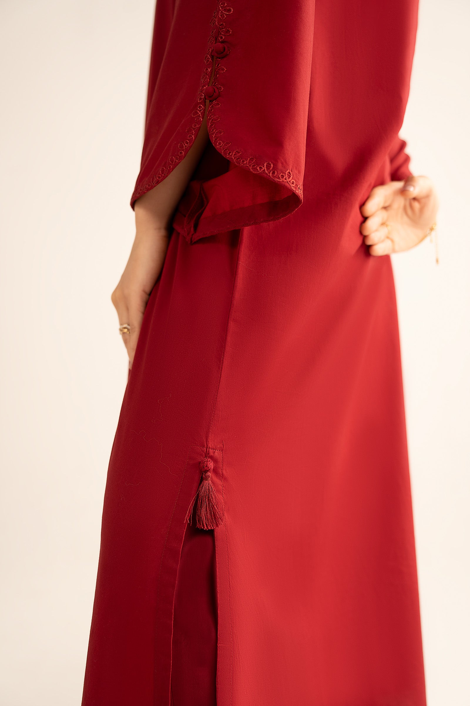 1 Piece - Shirt A-Line Shirt Embroidered Neckline Straight Sleeves With Loop-Buttons Detailing Color: Deep Red Fabric: Lawn Model is wearing xs size Note: Dry Clean Only