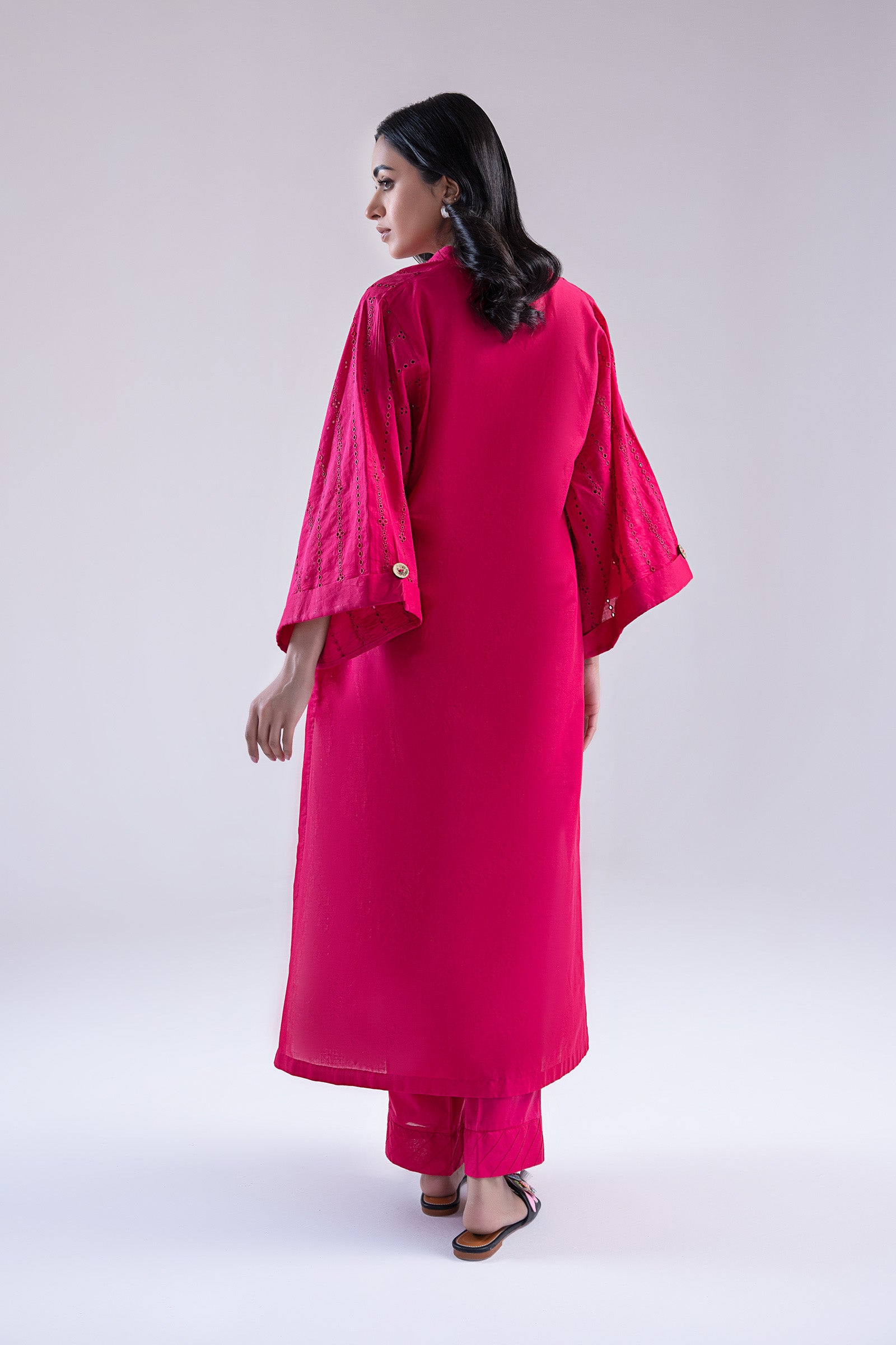 KurtaKashmiri NecklineDyed Front With EmbroideryEmbroidered Full Sleeves With Folded Cuff & Button DetailsDyed BackColor: PinkFabric: LawnTrousersDyed Straight Fit TrousersElasticated WaistbandColor: PinkFabric: CambricModel is wearing size xsNote: Only Dry Clean