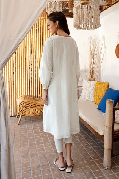 Screen printed kurta with bright coloured embroidery.
