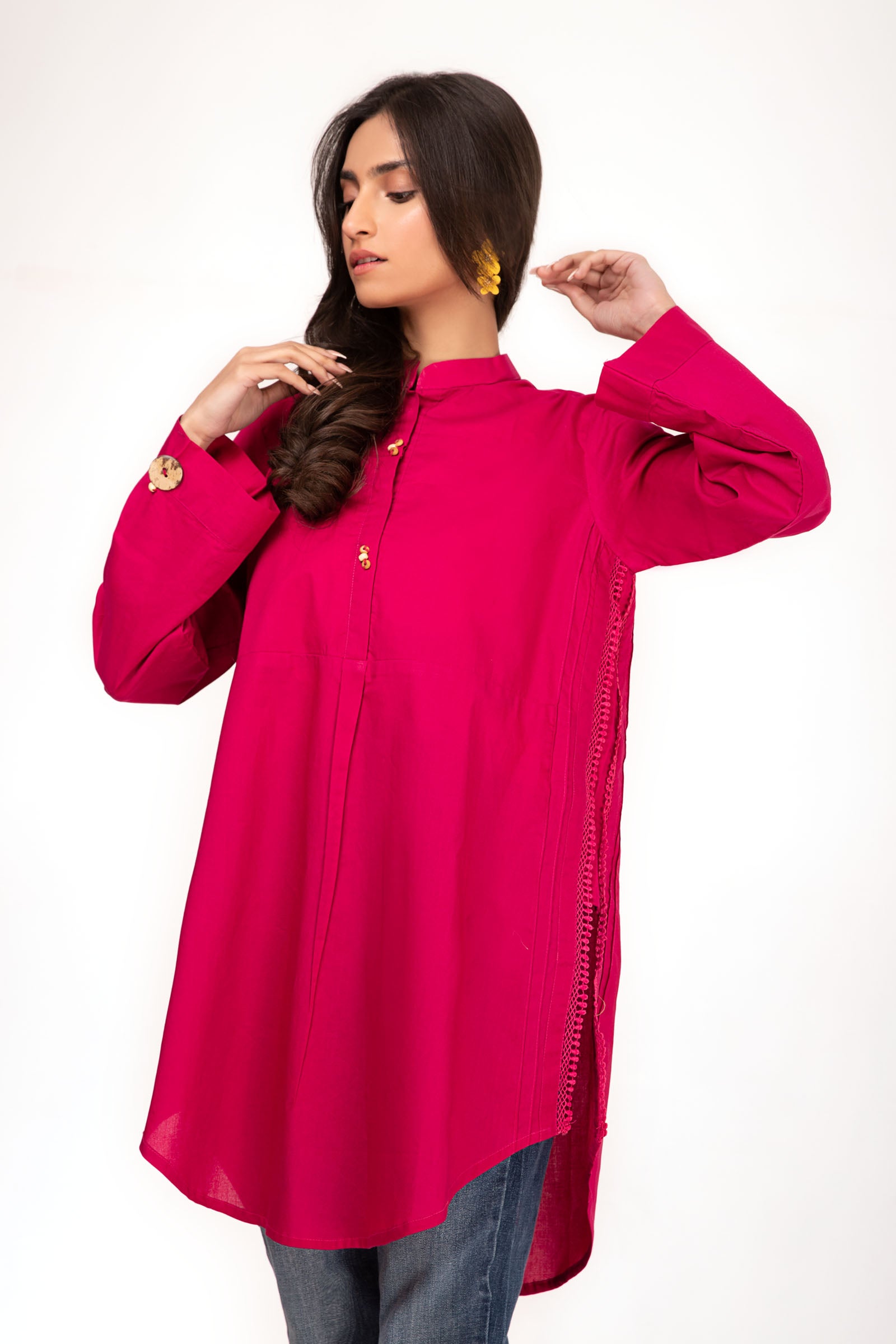 Solid top with lace finish and button details.