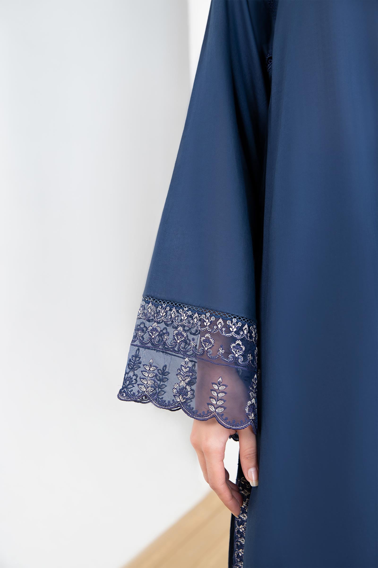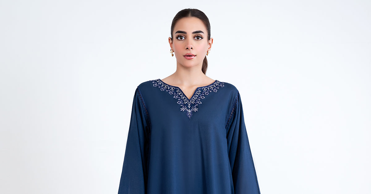 Details: Long Shirt, Dyed Front & Back, Embroidered Round Neckline With V-Slit, Full Sleeves With Embroidered Organza Detailing, Open Embroidered Side Slits, Pleated Organza Embroidered Border