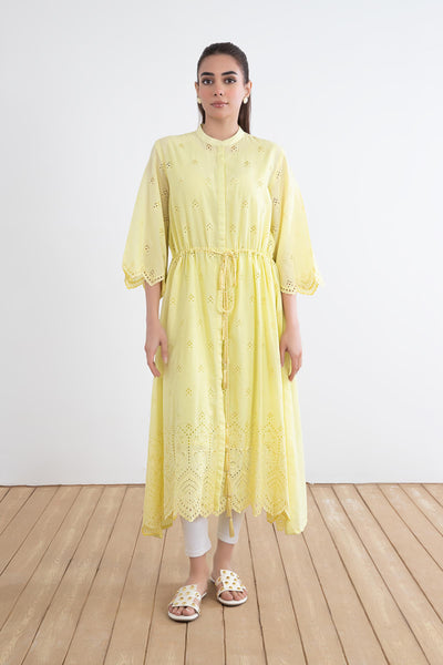 Exude charm this season with our yellow embroidered lawn dress adorning the canvas with schiffli embroidery for understated elegance.
