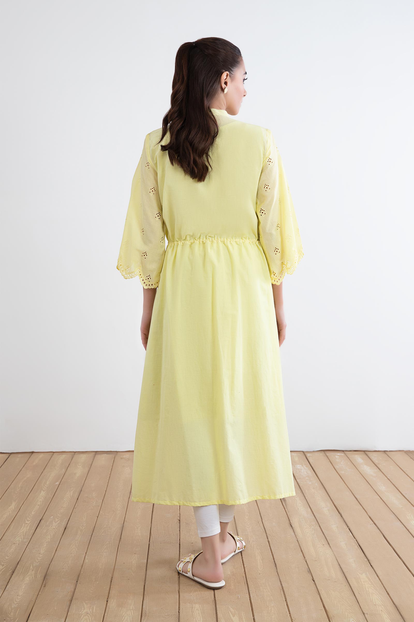 Exude charm this season with our yellow embroidered lawn dress adorning the canvas with schiffli embroidery for understated elegance. Details: Dyed Front & Back, V Collar Neckline, Drawstring On Waist Line, All-Over Schiffli Embroidered Front Colour: Yellow Fabric: Lawn Note: Only Dry Clean Model is wearing size xs