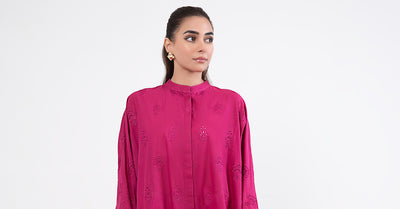 Promising a style statement with our embroidered cambric co-ord set featuring a magenta band collar shirt elevated with schiffli embroidery and paired with dyed trousers with a folded hem that instantly captivates the eye.