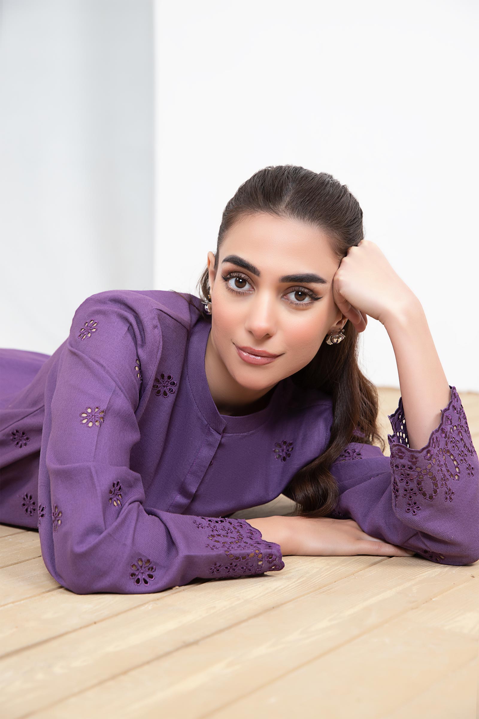 Uplift your daily style with our ash pink embroidered dobby lawn co-ord set featuring intricate schiffli embroidery in delicate floral patterns that instantly captivate the eye.ShirtDetails: Short Shirt, Dyed Front & Back, Band Collar Neckline, Full Sleeves, All-Over Schiffli EmbroideryColour: PurpleFabric: Dobby LawnTrousersDetails: Dyed Straight Trousers With Schiffli Embroidered HemColour: PurpleFabric: CambricNote: Only Dry CleanModel is wearing size xs