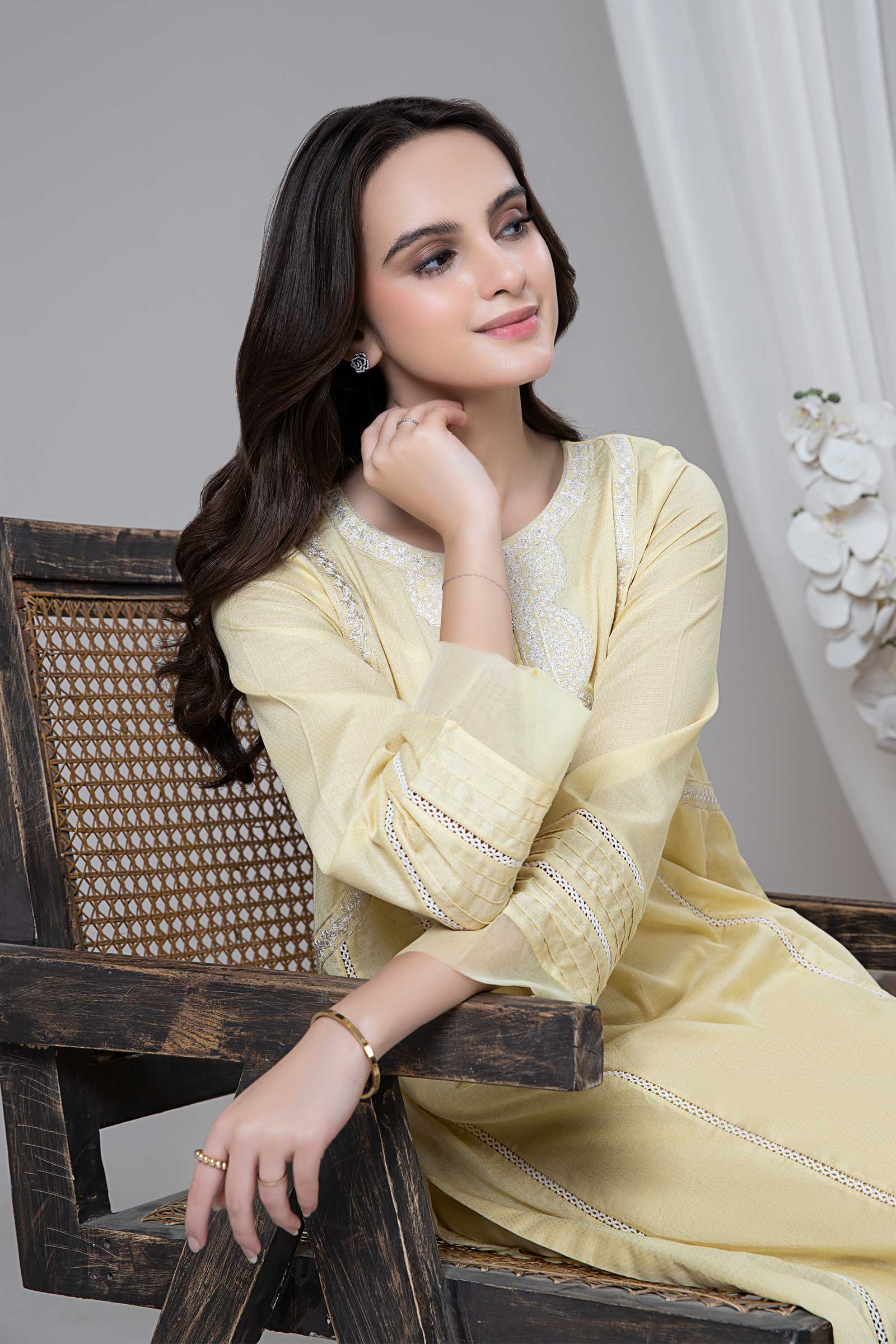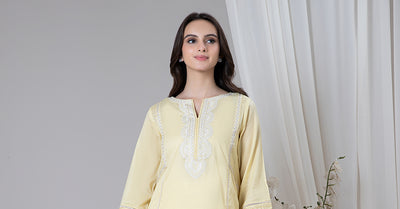 Immerse yourself in our soft light yellow two-piece embroidered dobby lawn suit graced with meticulous embroidery, Delicate pleats, and organza detailing.