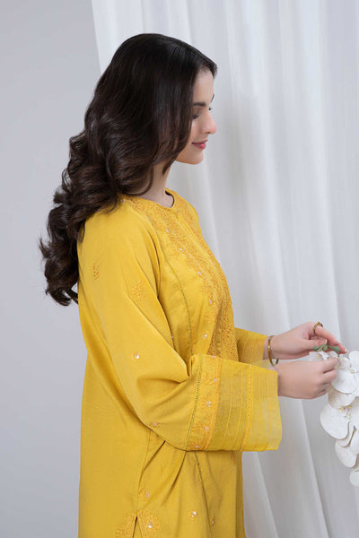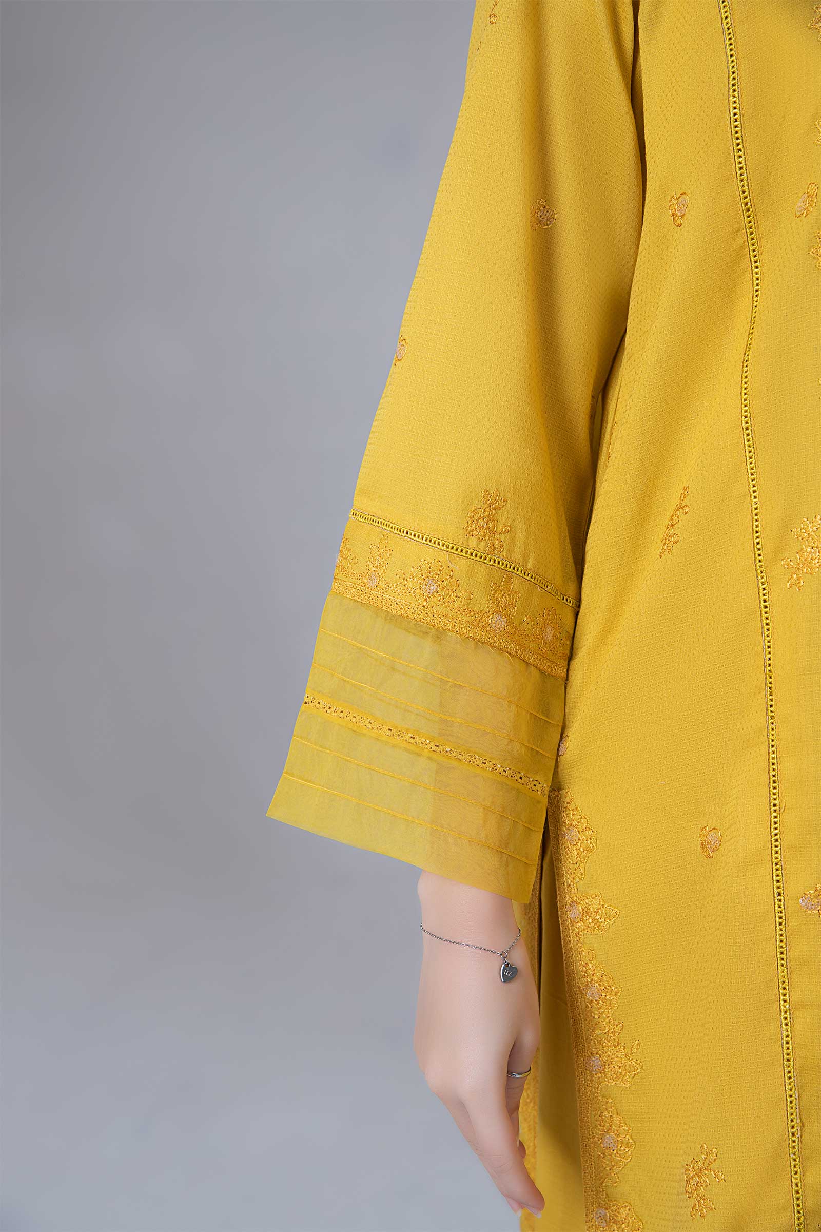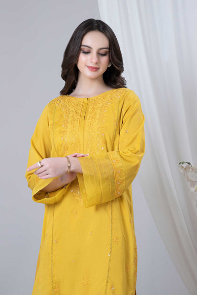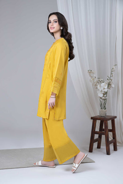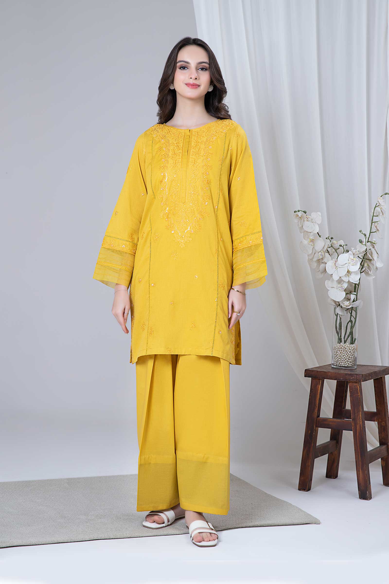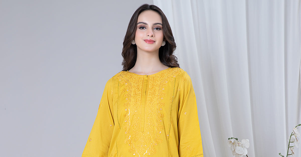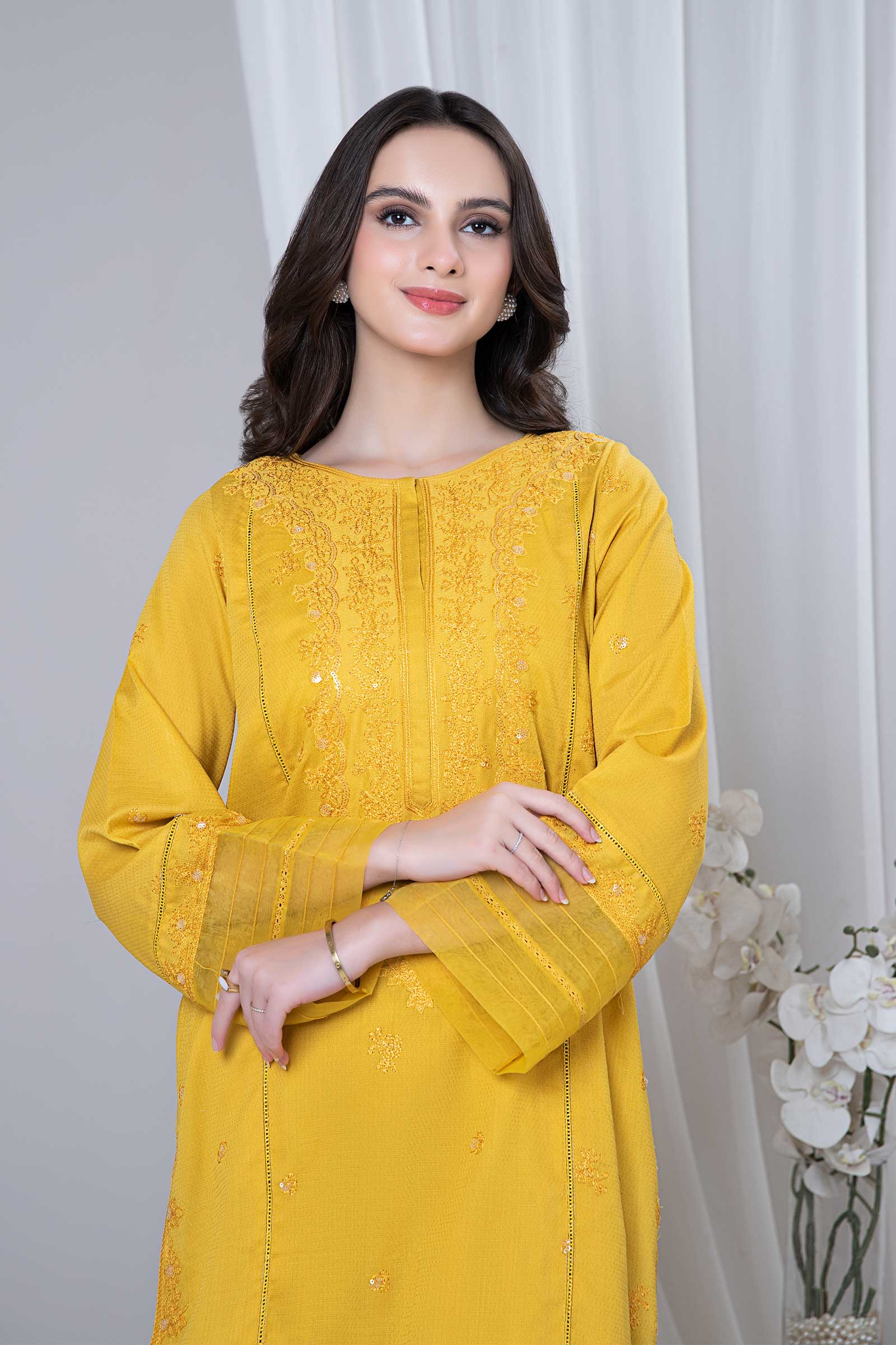 Revive classic vibes with our yellow two-piece dyed dobby suit crafting tradition with sequins and thread embroidery elevated with organza detailing.