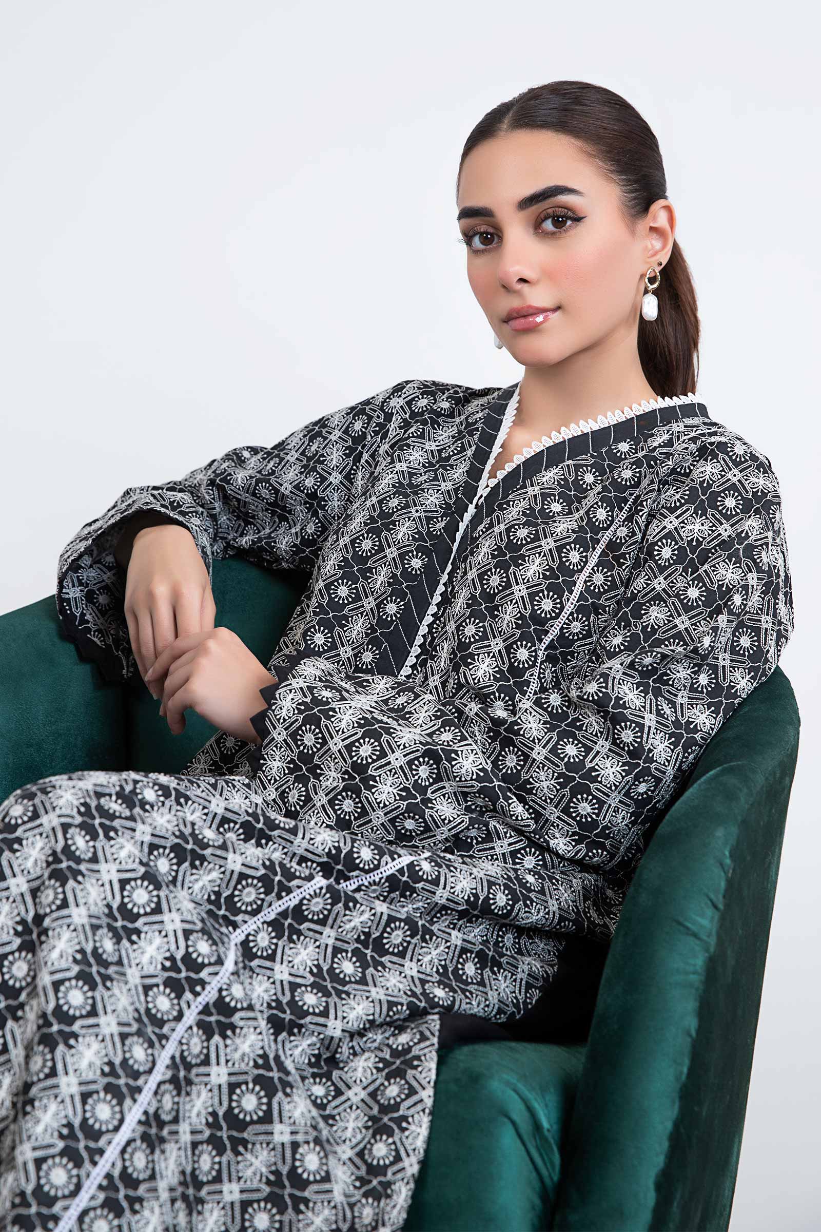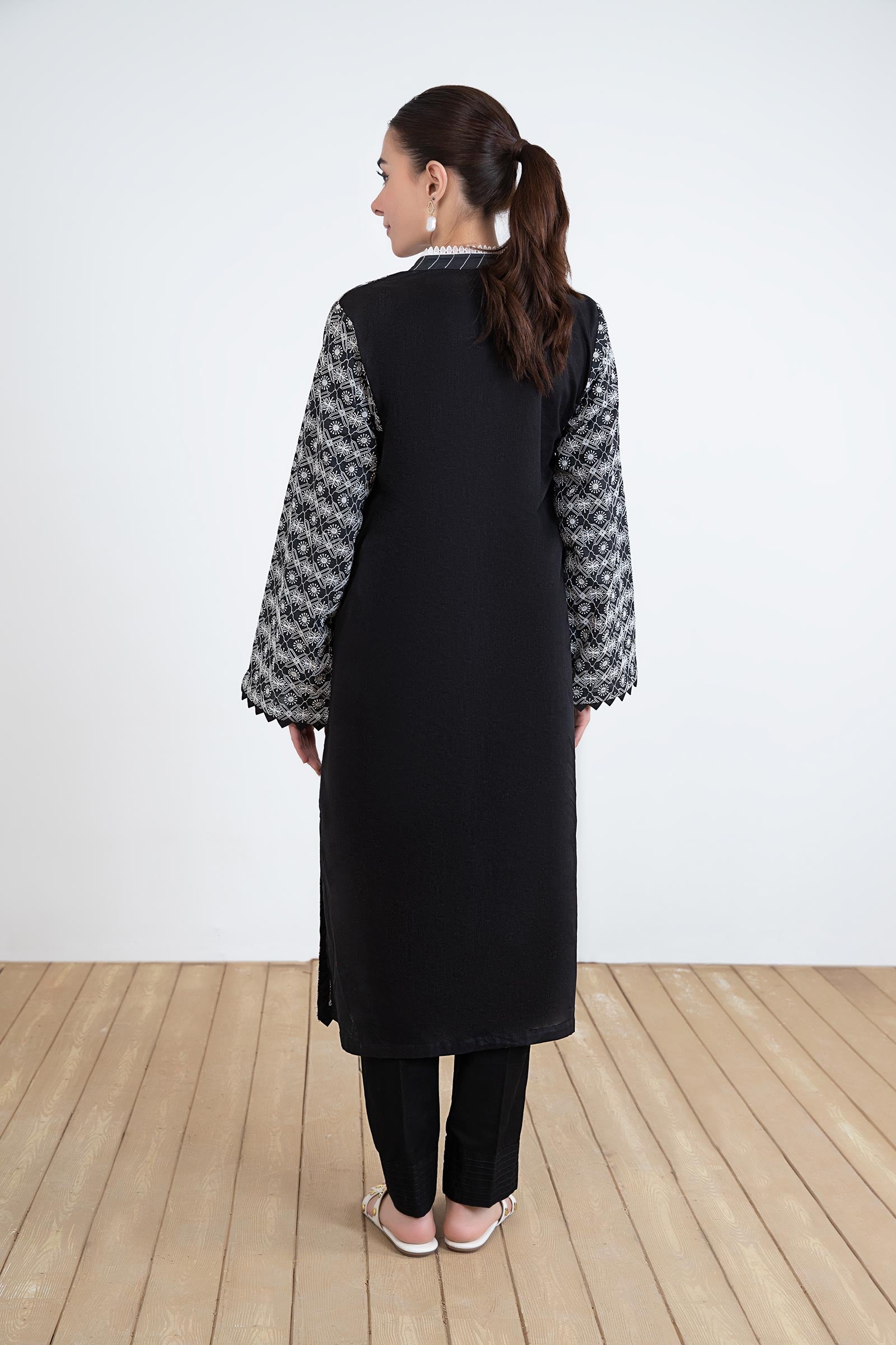 Details: All-Over Embroidered Long Shirt, Kashmiri Neckline With Top Stitches, Full Sleeves, Triangle Detailing On Sleeves & Border