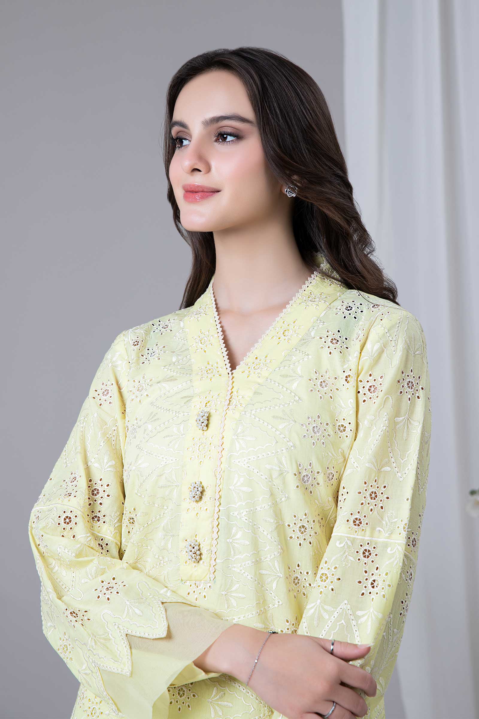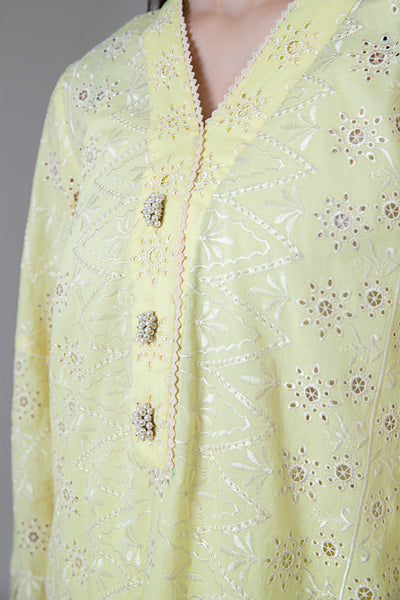 Bursting into full bloom, our embroidered lawn kurta features a yellow canvas meticulously crafting floras with thread and schiffli embroidery and organza detailing.