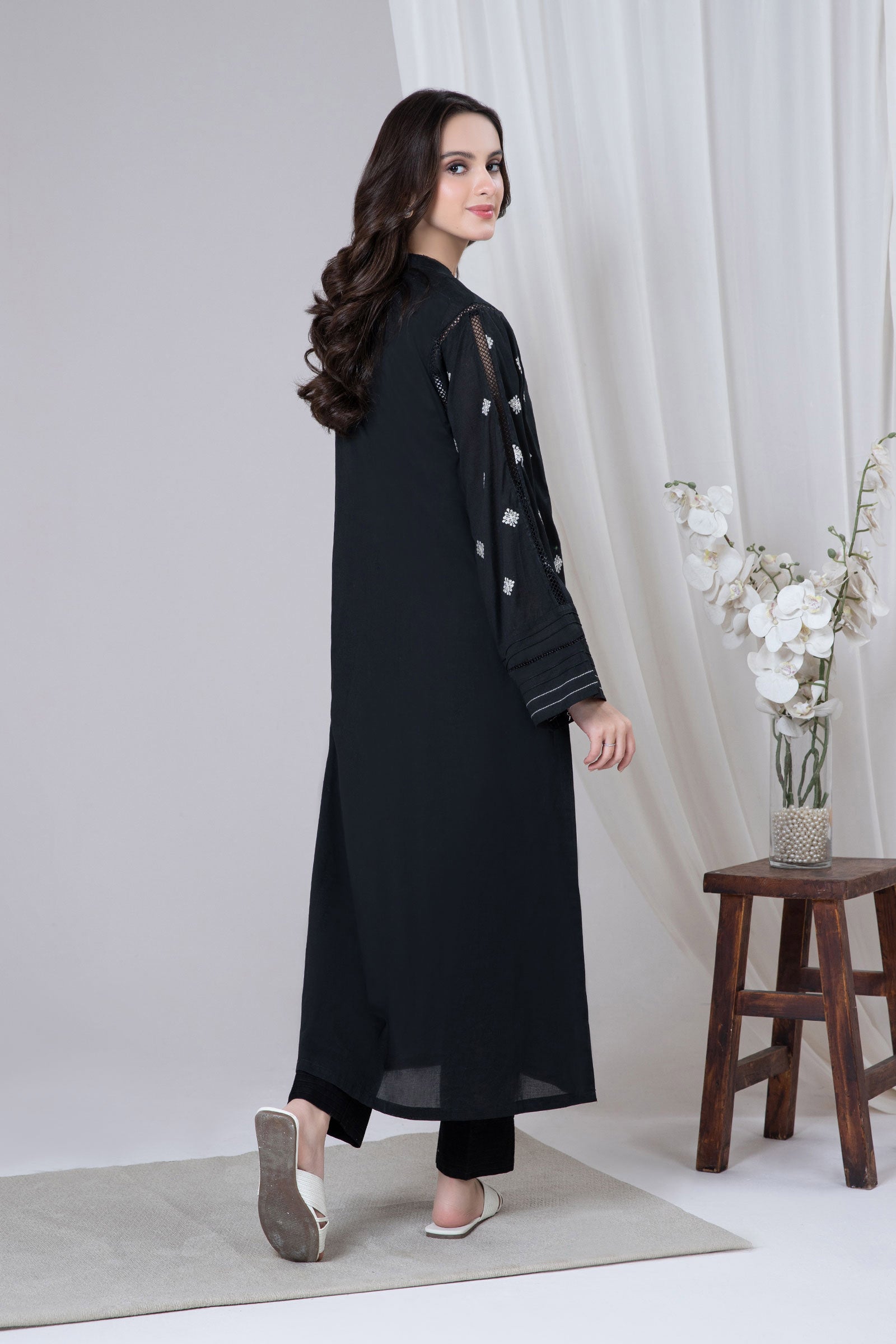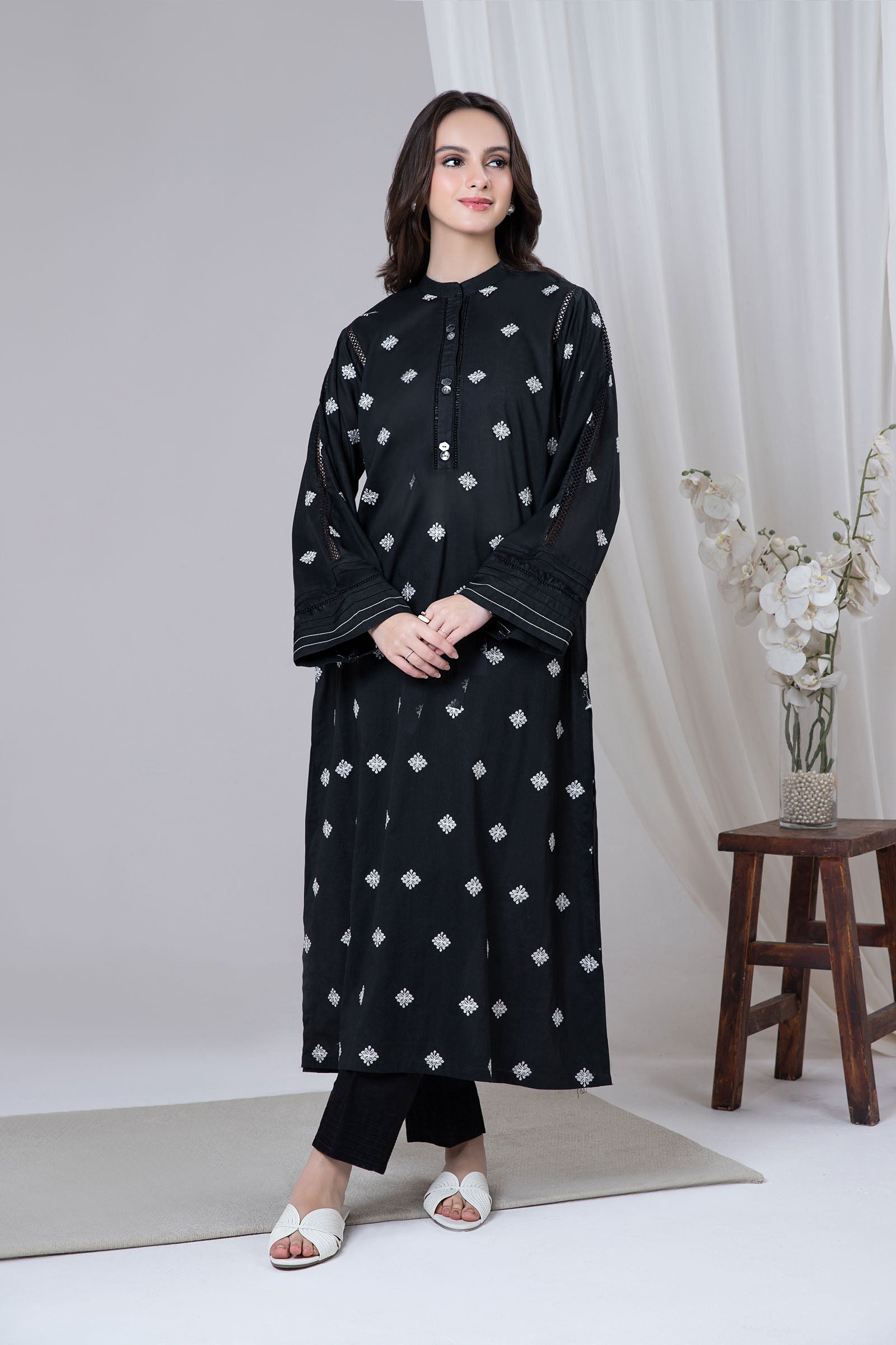 Ode to summer grace, our embroidered lawn shirt offers timeless allure with abstract-pattern embroidery heightened with delicate button detailing.Details: Long Shirt, Dyed Front & Back, Band Collar Neckline With Button Detailing, Embroidered Full Sleeves With Pleats, Threadwork & Lace Detailing, All-Over Embroidered FrontColour: BlackFabric: LawnNote: Only Dry CleanModel is wearing size xs