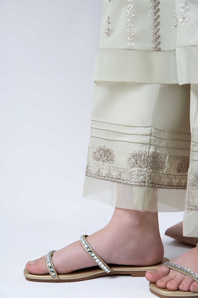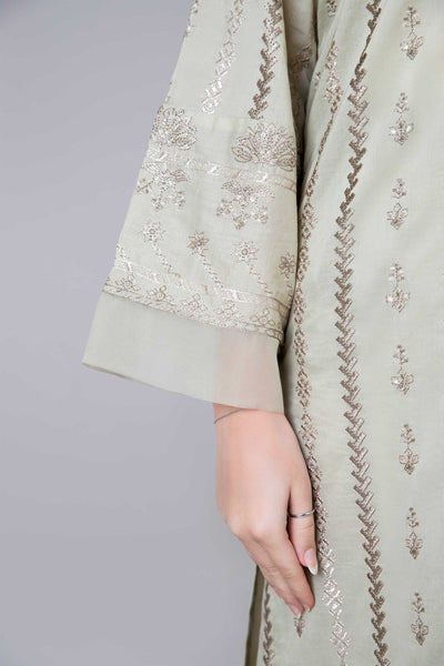Casting a spell of elegance with our two-piece embroidered lawn suit weaving the coffee canvas with intricate geometric elements paired with straight trousers for the ultimate style statement.