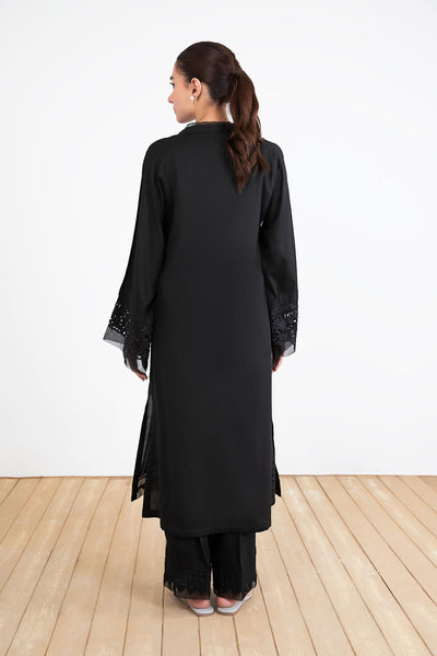 Exude sophistication with our black 2 pieces dyed dobby lawn suit accented with flourish embroidery and organza detailing paired with straight trousers.