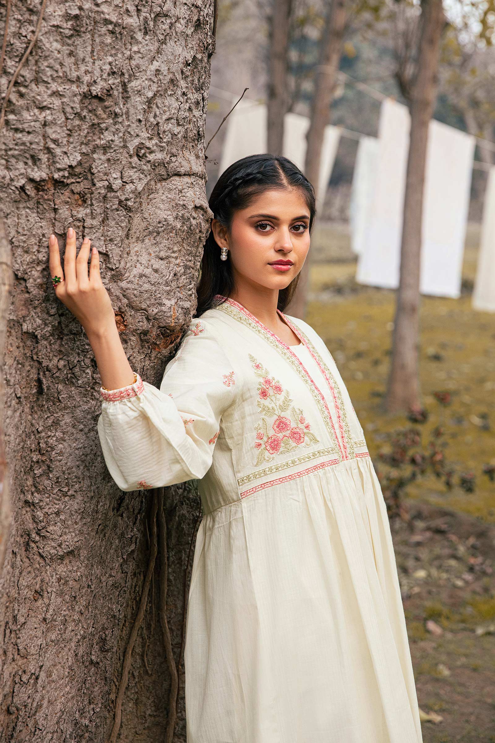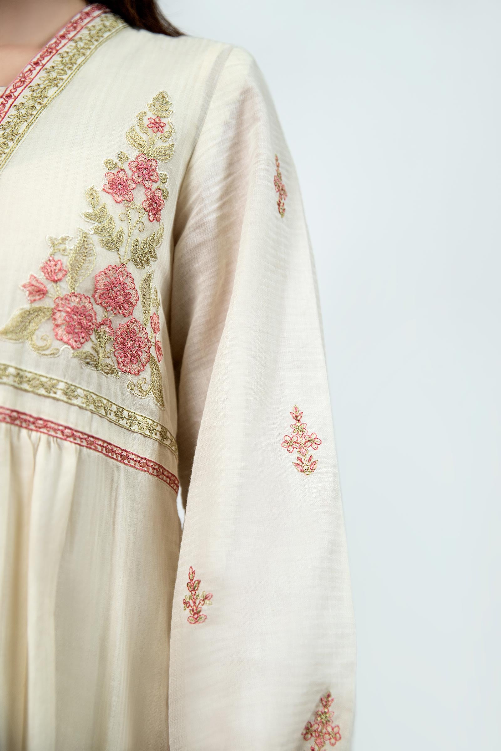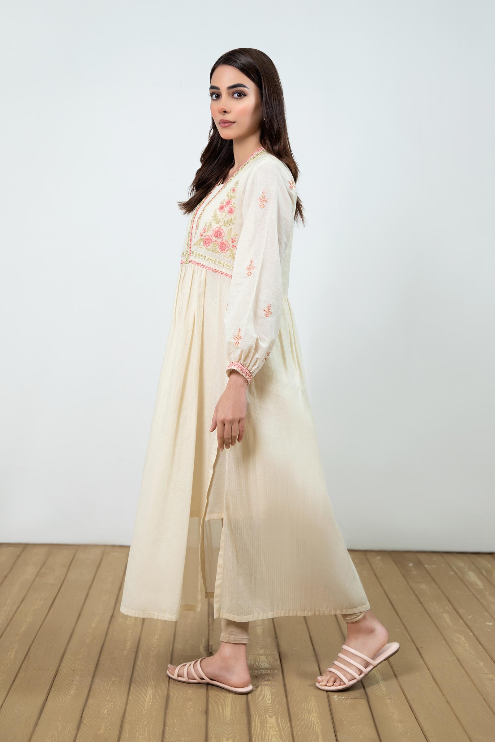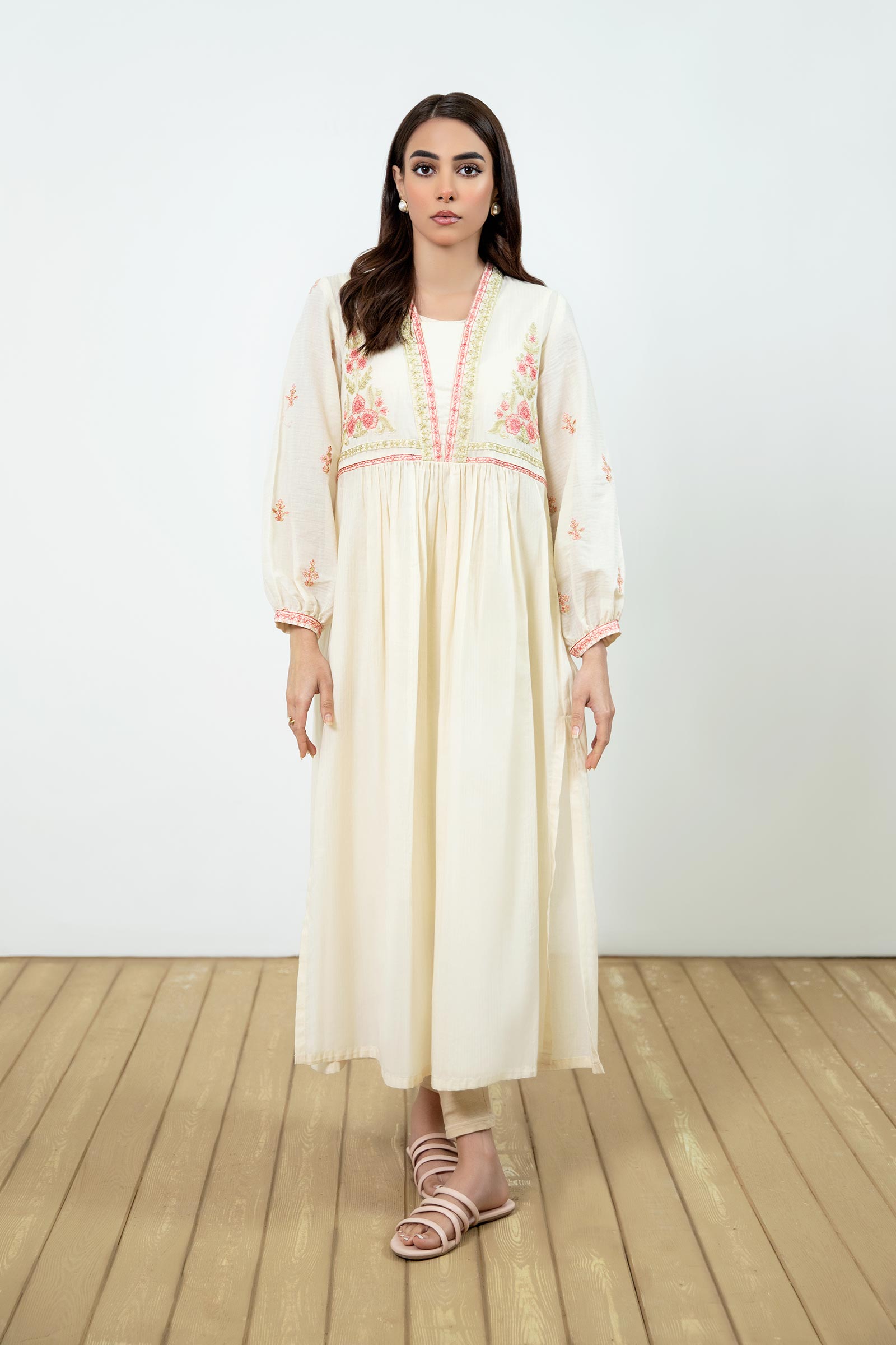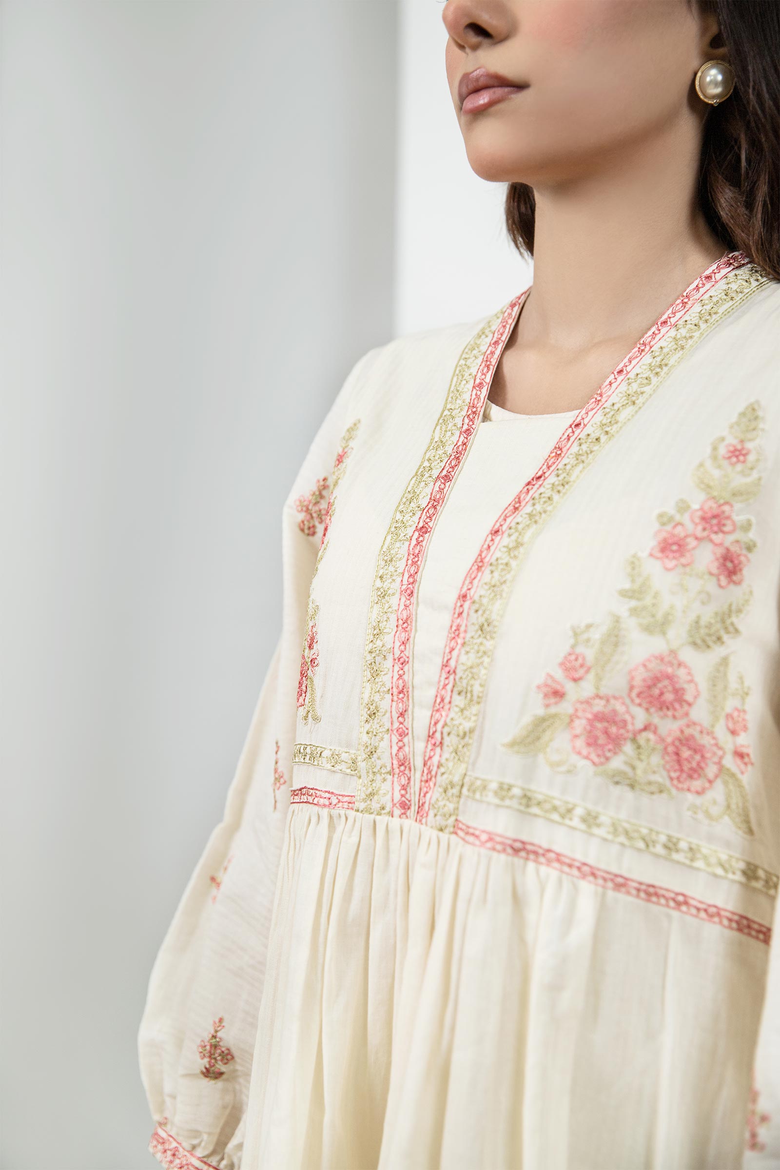 Dive into floral fantasy with our off-white dyed dobby lawn dress weaving festoons in soft coral threads. Details: Dyed Front & Back, V Neck Collar, Embroidered Sleeves, Embroidered Front With Gathers Colour: Off-White & Coral Fabric: Dobby Lawn Note: Only Dry Clean Model is wearing size xs