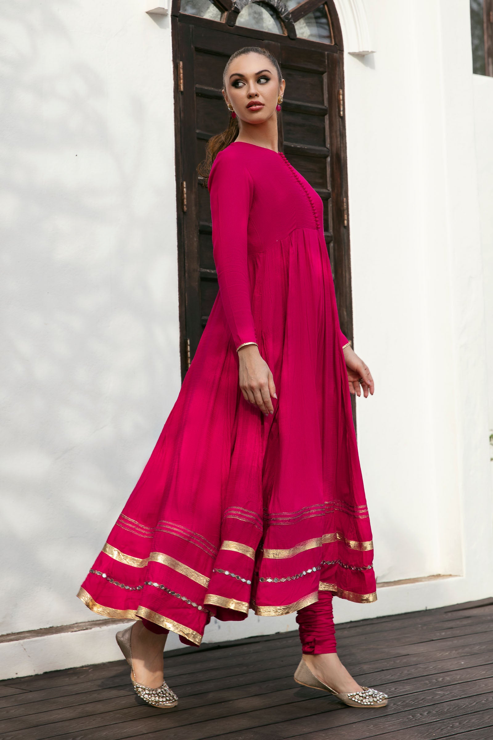 Embroidered dress with loop buttons and lace details.