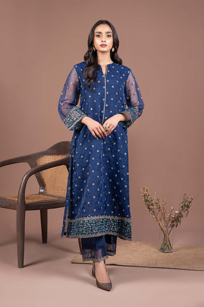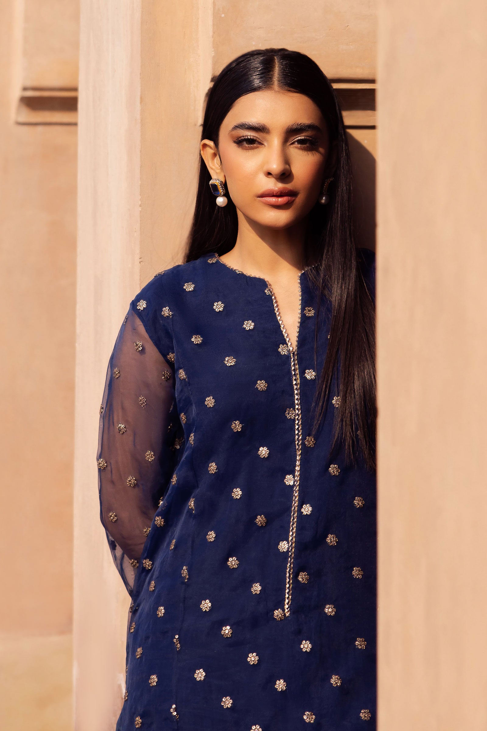 A classically rich composition is portrayed in this contemporary two-piece embroidered organza suit. It features a trendy silhouette illustrating an aesthetic anthracite navy blue canvas enriched with scintillating sequins embroidery and paired with matching culottes heightened with pleats and sequins embroidery, making this glamourous outfit a style statement for this festive season.