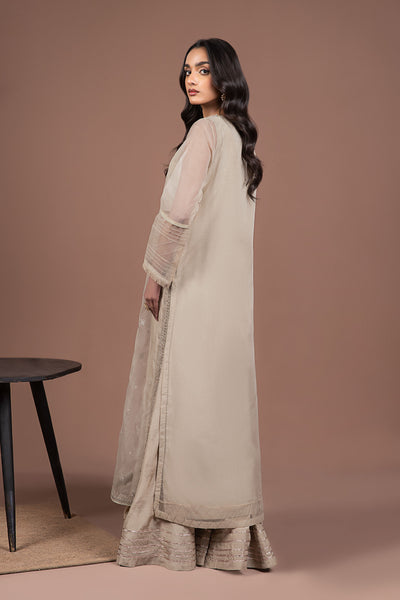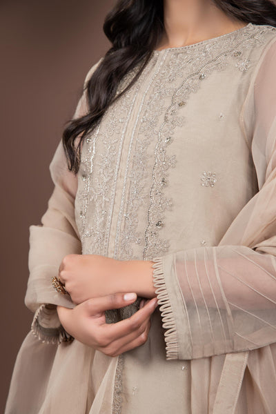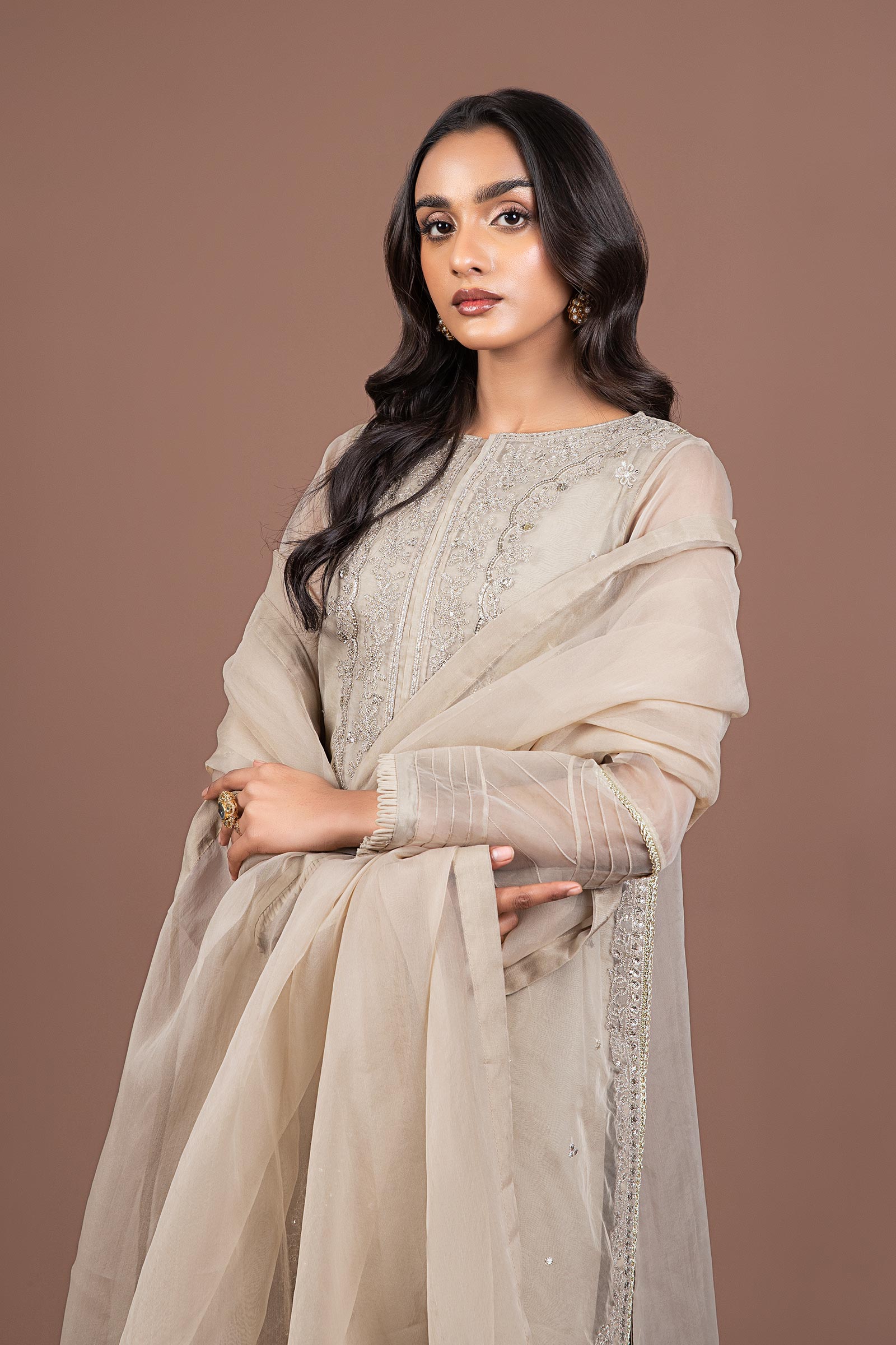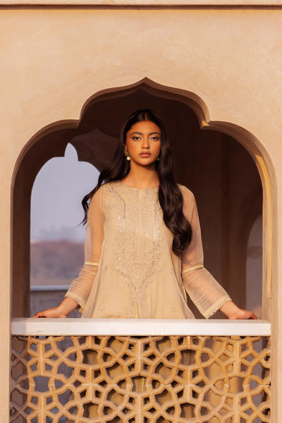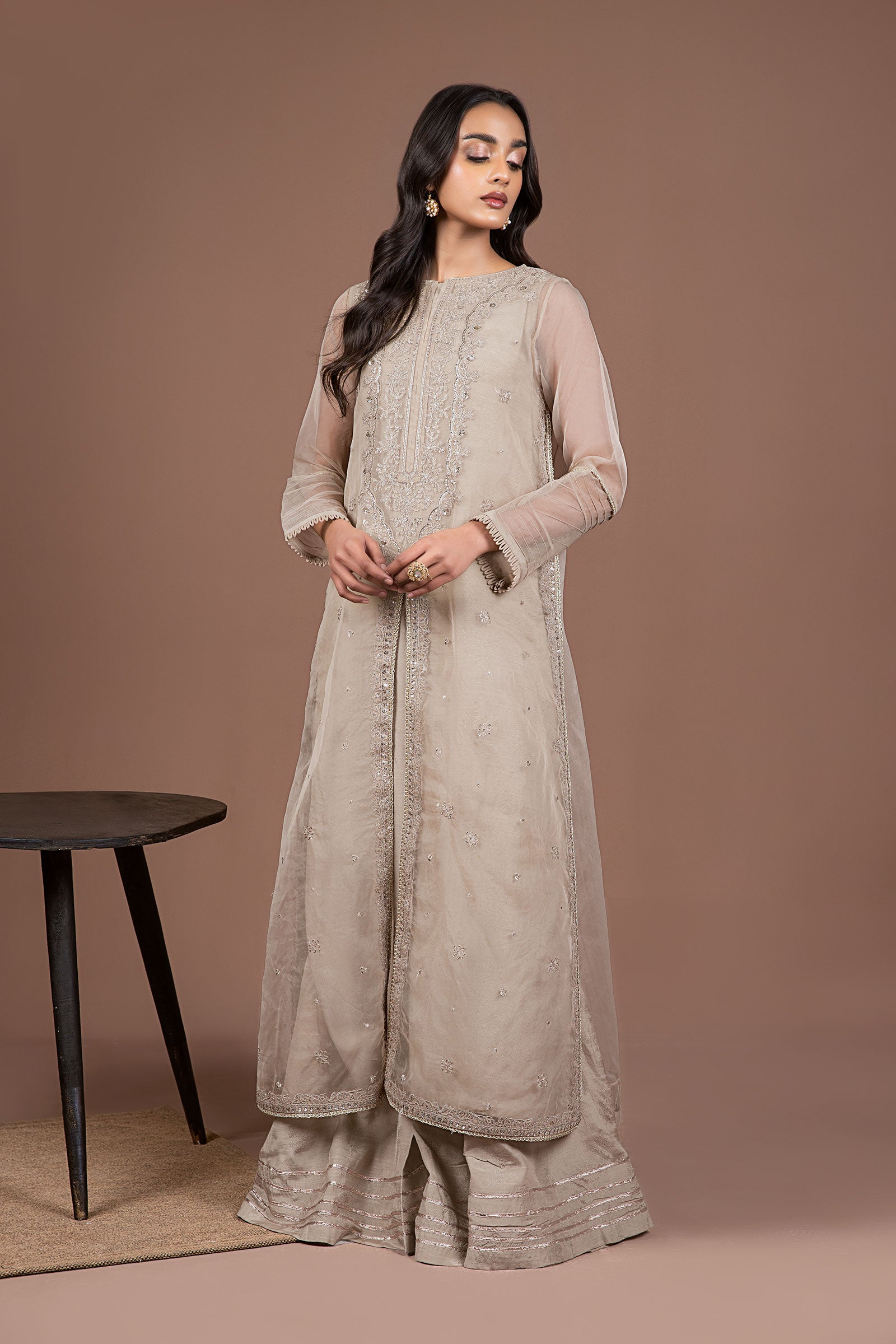 An aesthetically appealing composition is layered over this graceful two-piece embroidered organza ensemble rendered in coffee shade. It features a contemporary silhouette front open shirt beautifully enriched with scintillating sequin-tilla embroidery and lace detailing illustrating captivating floral designs. Paired with graceful screen printed azaar trousers with a gotta lace hem that offers a statement at festive occasions.