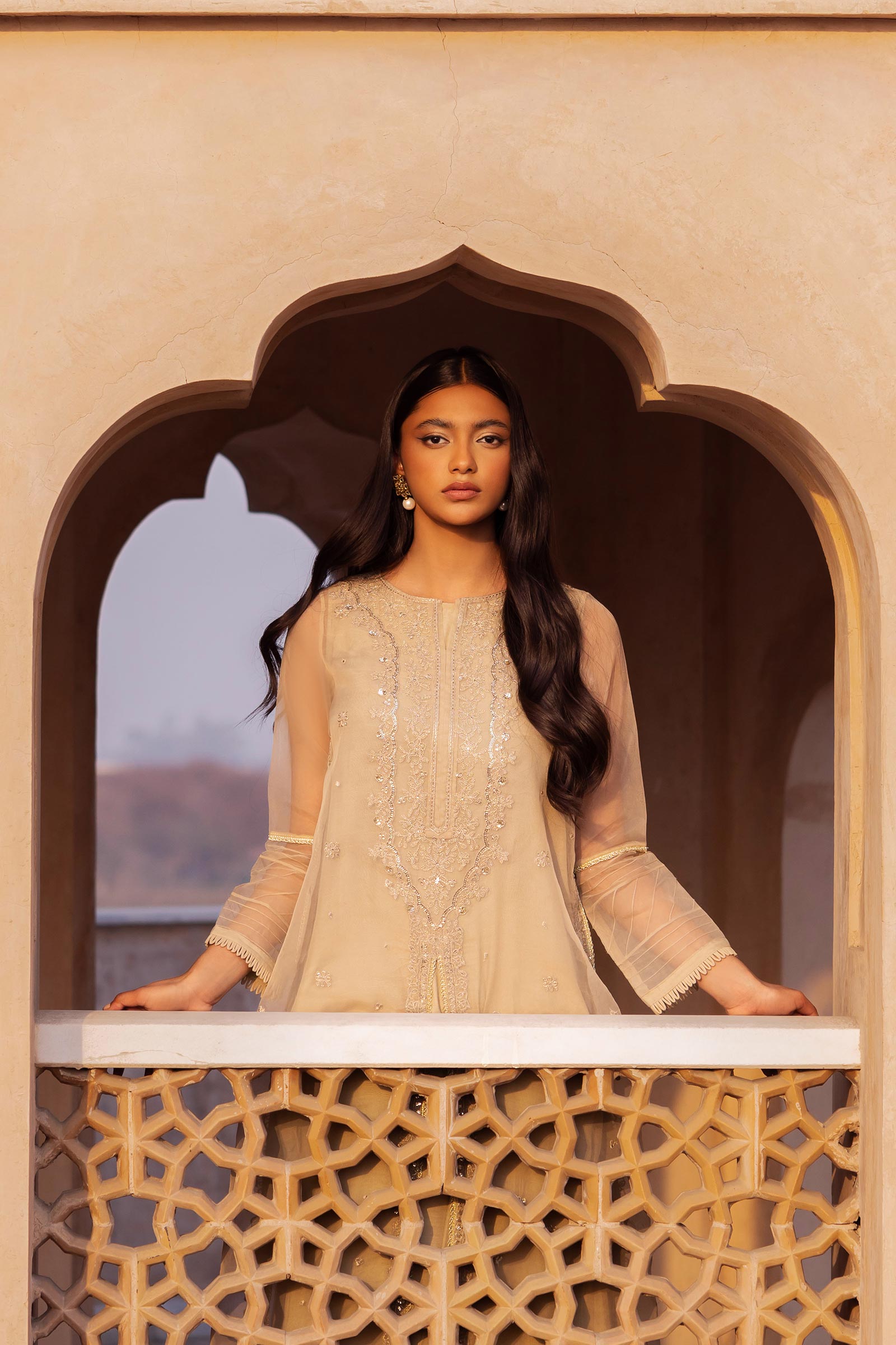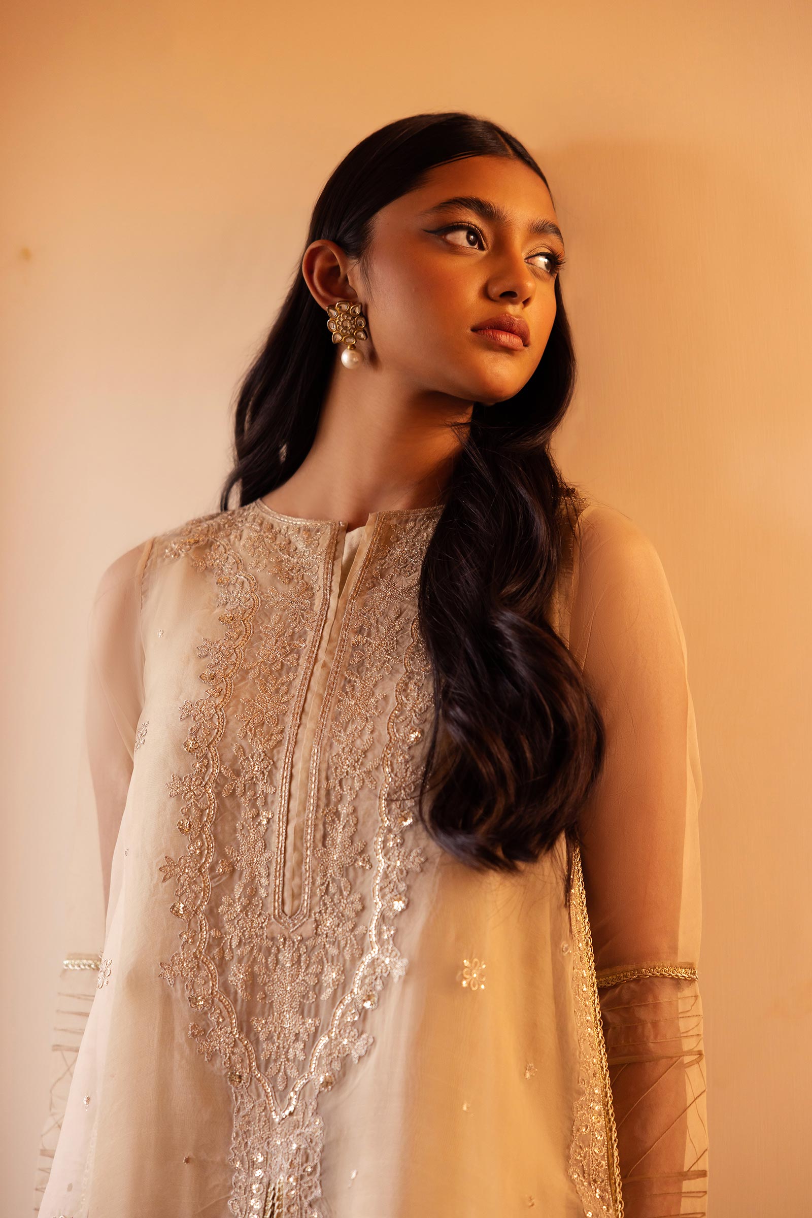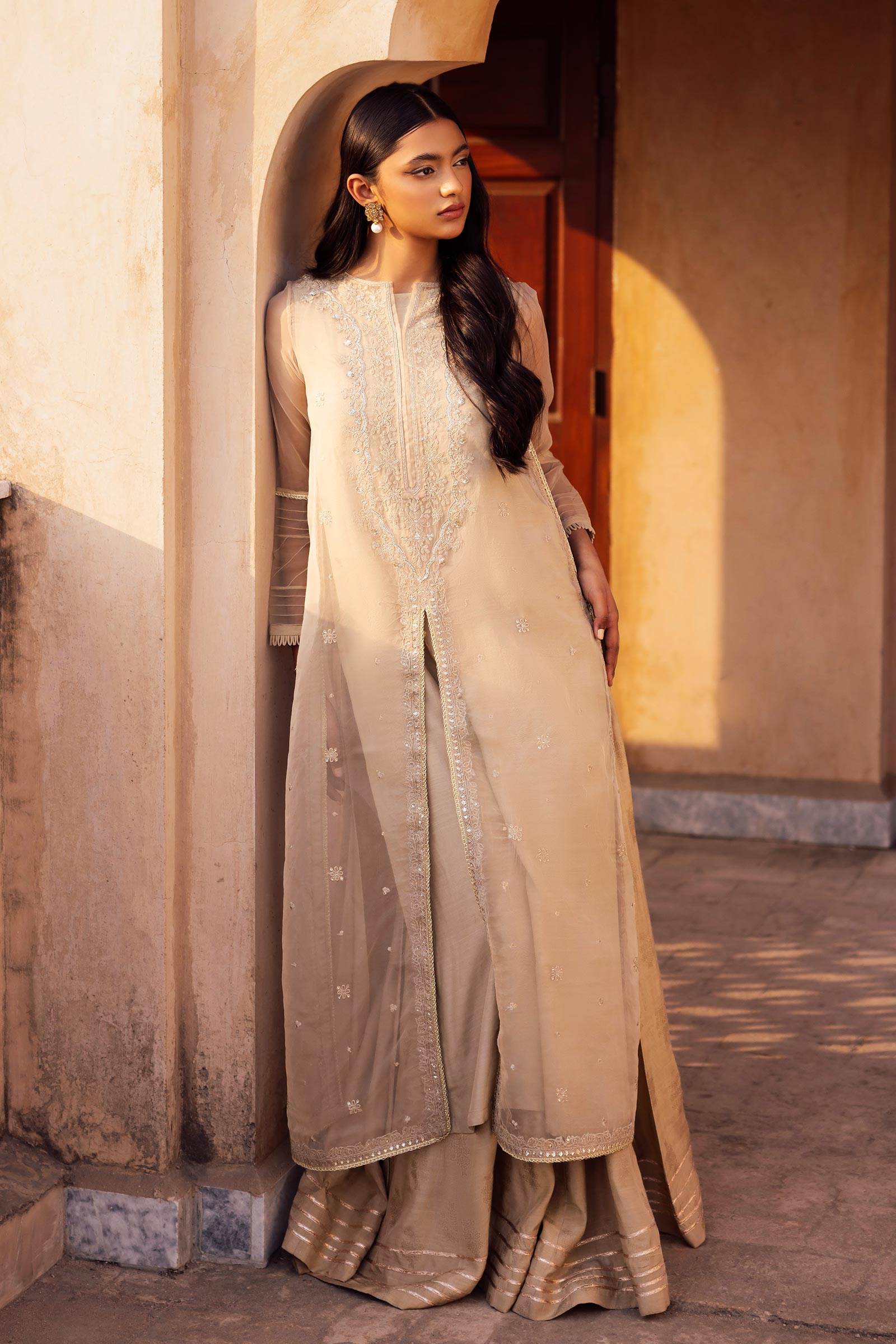 Details: Front Open Straight-Cut Shirt, Boat Neckline, Full Sleeves With Pleasts & Lace Detailing, All-Over Sequins, Tilla & Thread Embroidery