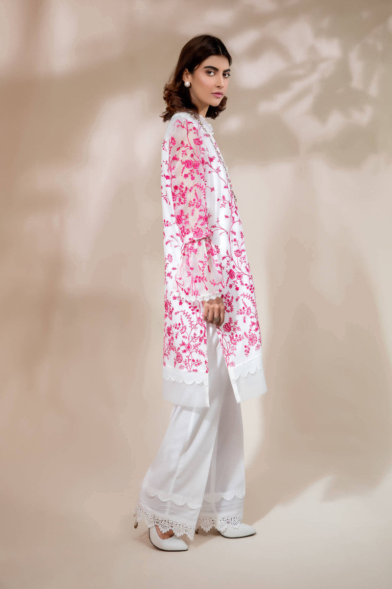 Shirt fabric: Lawn All over embroidered kurta with chiffon sleeves featuring lace details