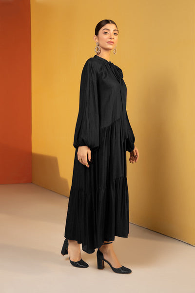 long gathered dress with tie neck