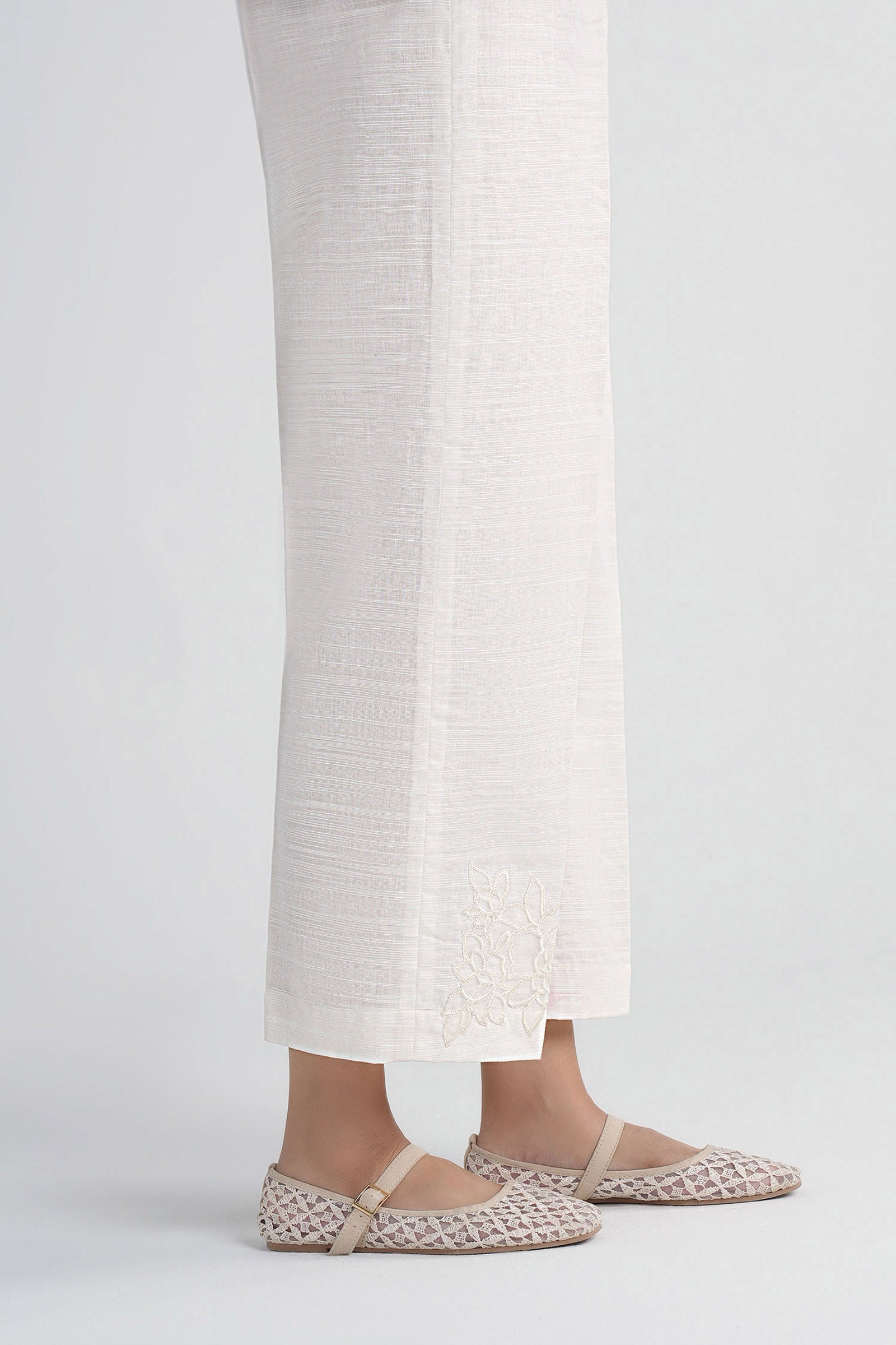 Culottes Elasticated Waistband One Side Embroidered Motif Color: Off-White Fabric: Slub Khaddar Fit: Regular Occasion: Daily Casual Model is wearing xs size Note: Dry Clean Only