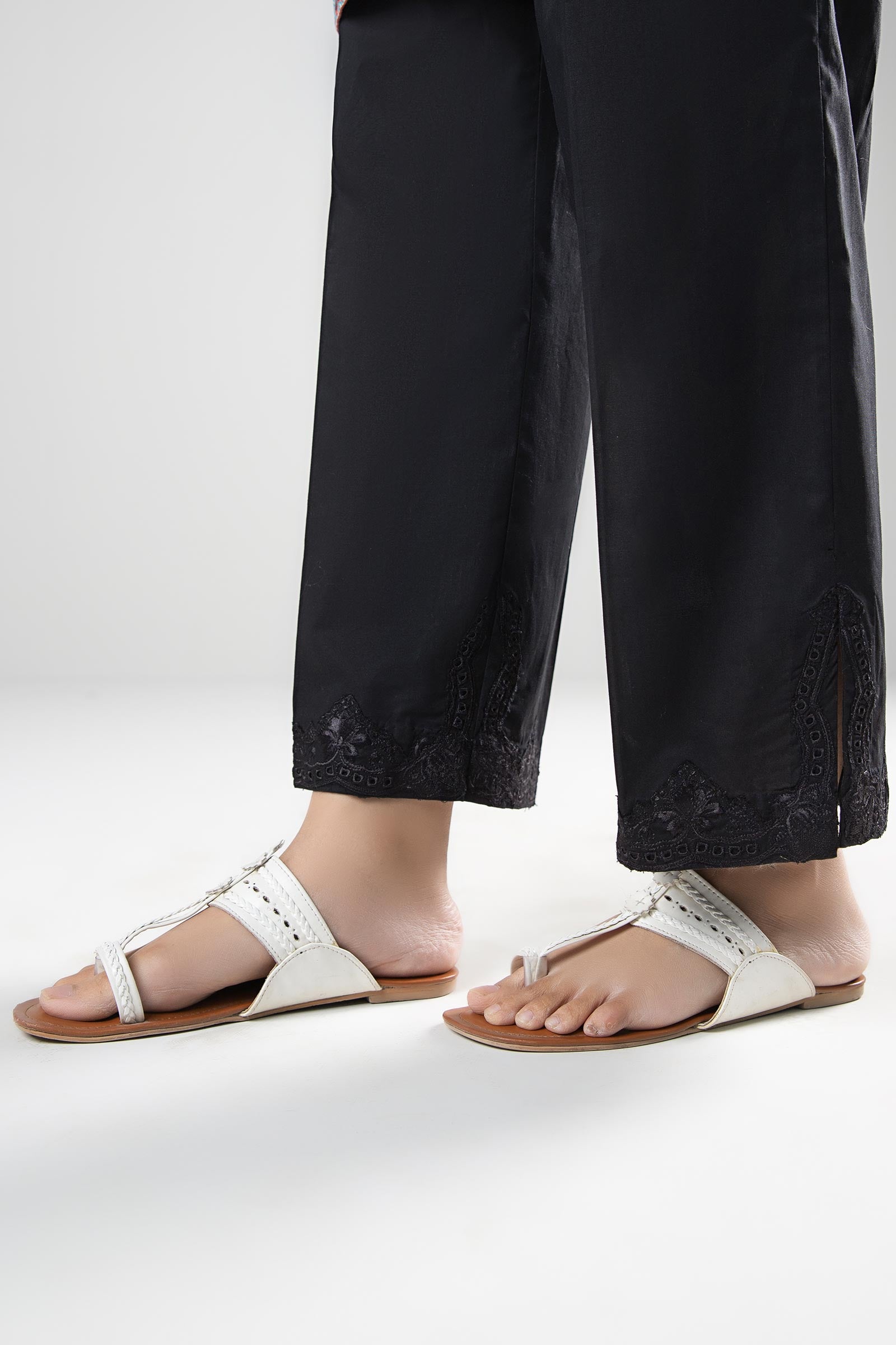 Dyed Culottes Elasticated Waistband Embroidered Hem With Side Slit Color: Black Fabric: Cambric Fit: Relaxed Occasion: Daily Casual Model is wearing size xs Note: Dry Clean Only