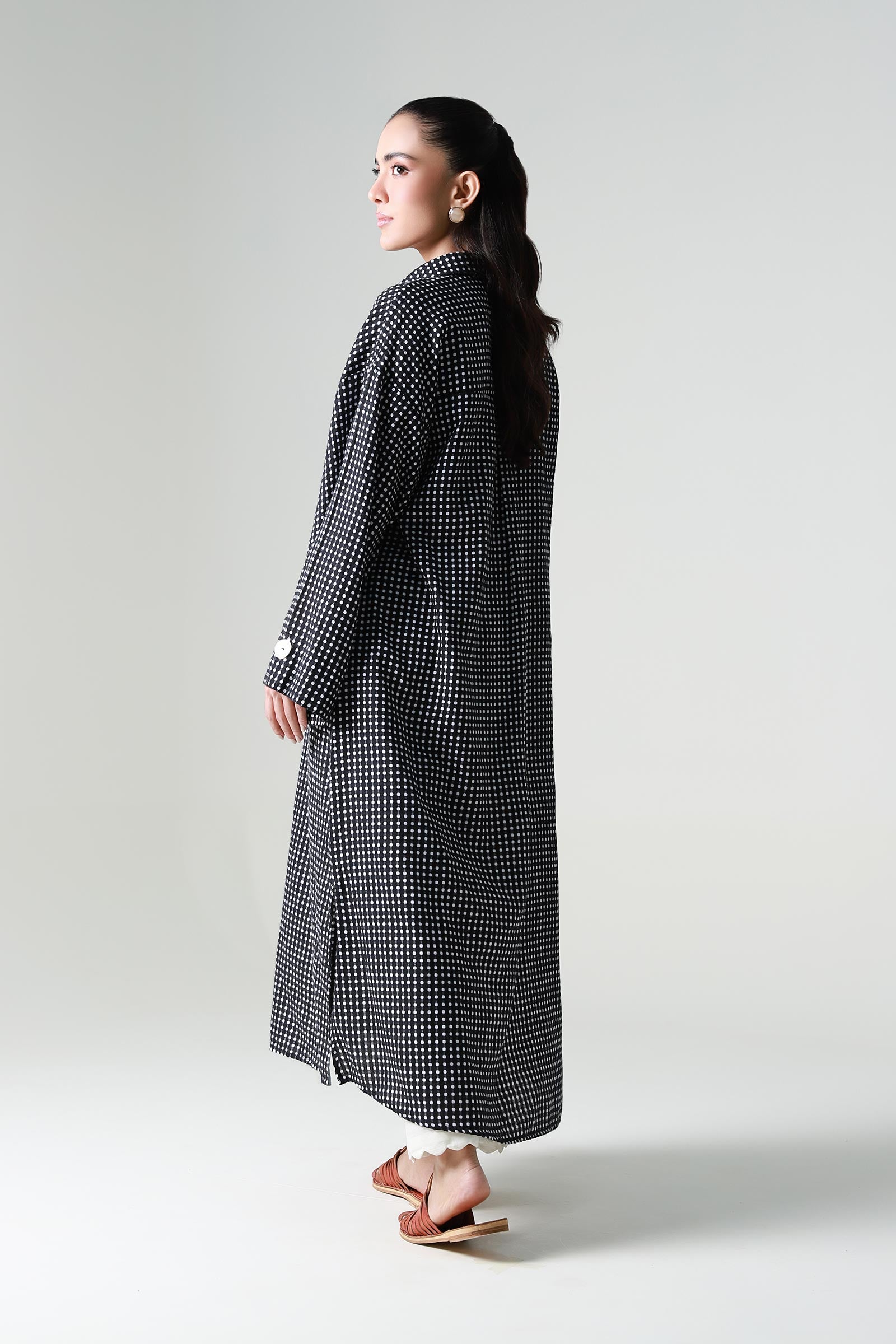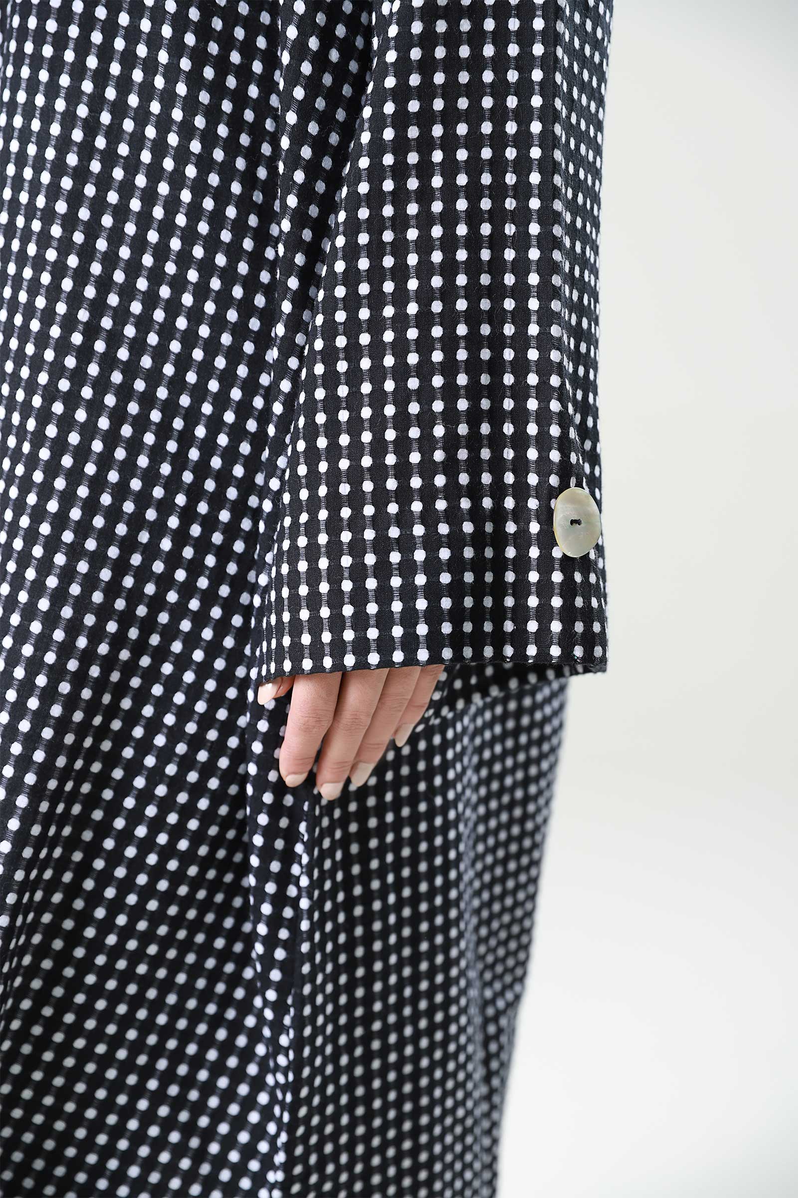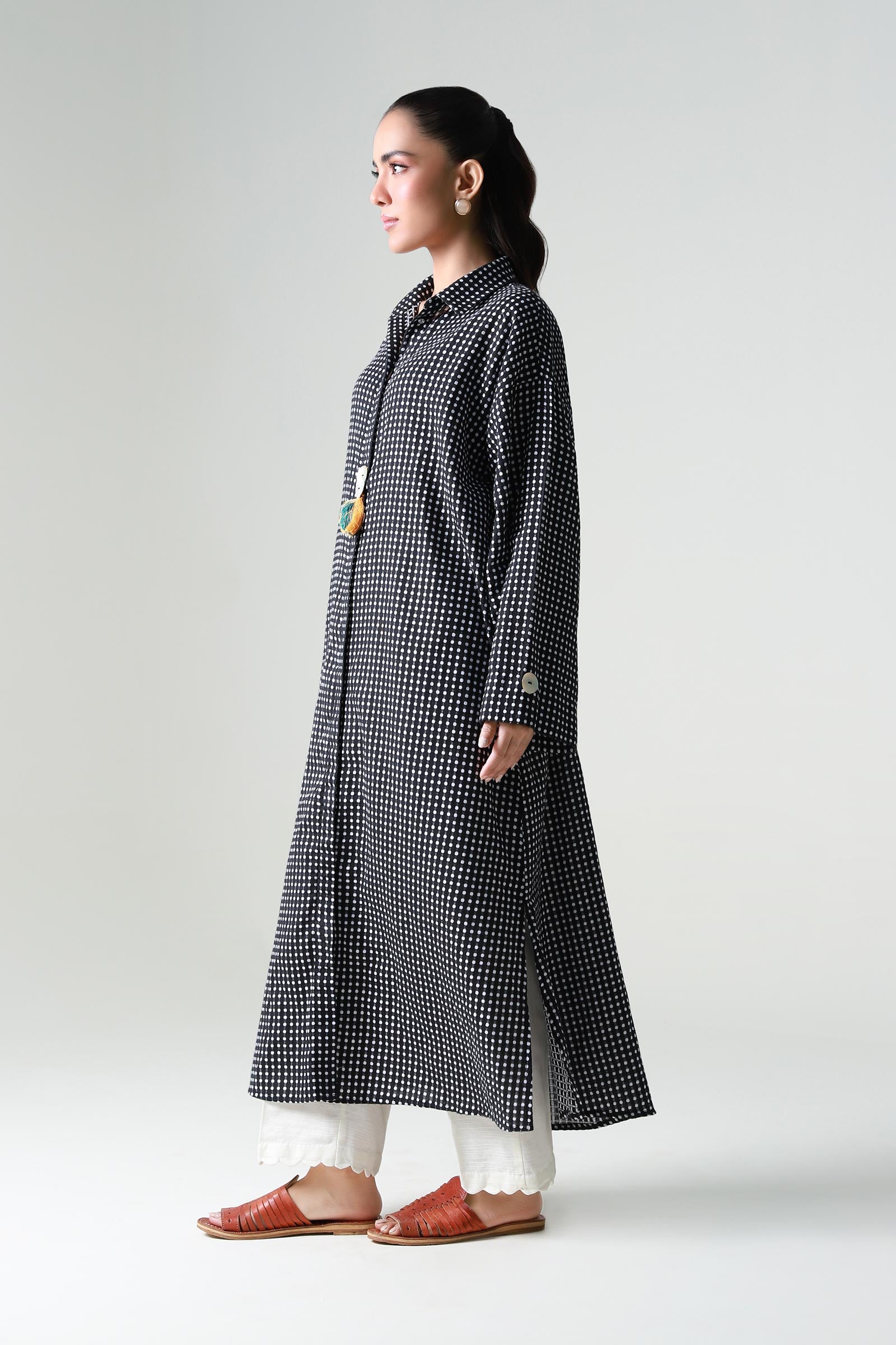Dyed Straight Cut ShirtTwo Piece Collar With TasselsFull SleevesColor: Black & WhiteFabric: Yarn DyedFit: RegularModel is wearing size xsNote: Dry Clean Only