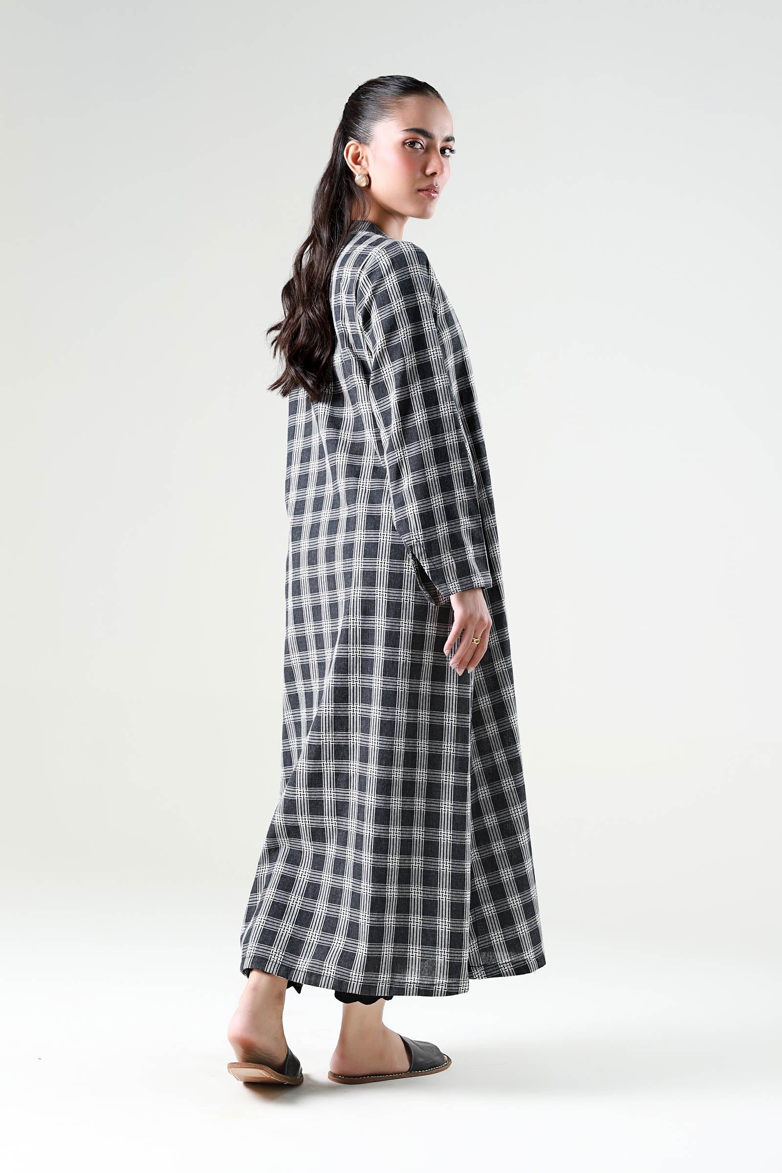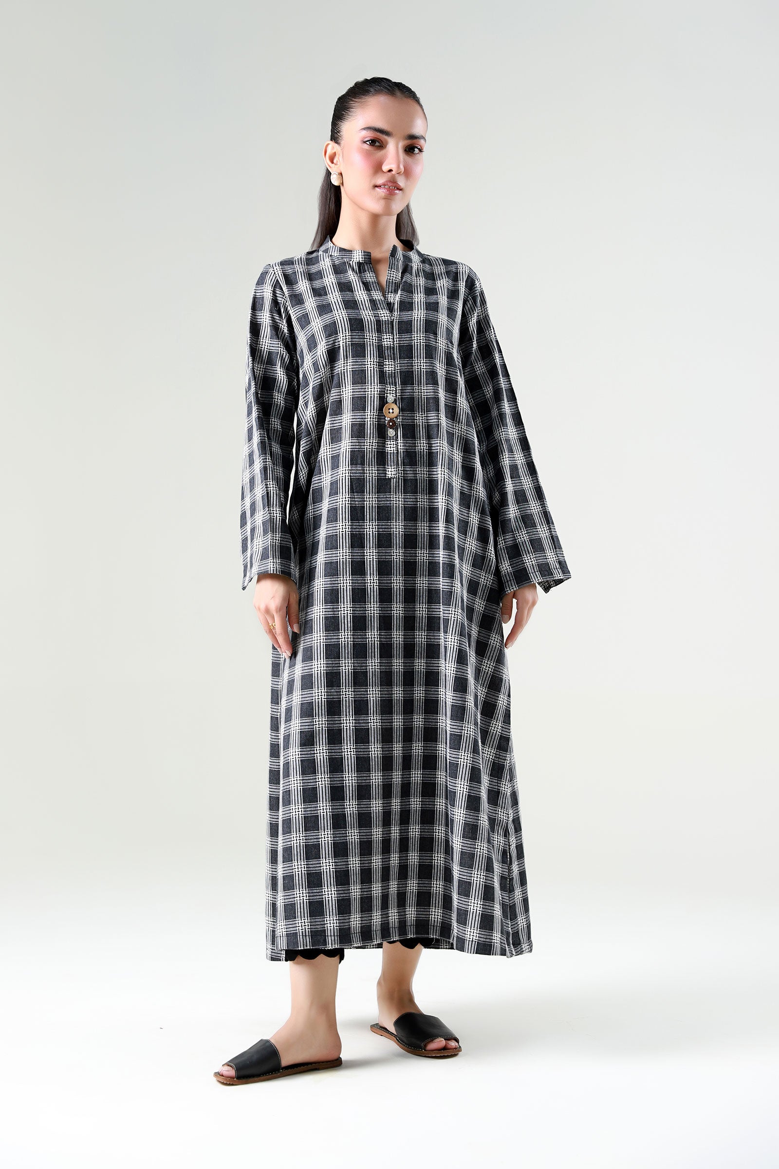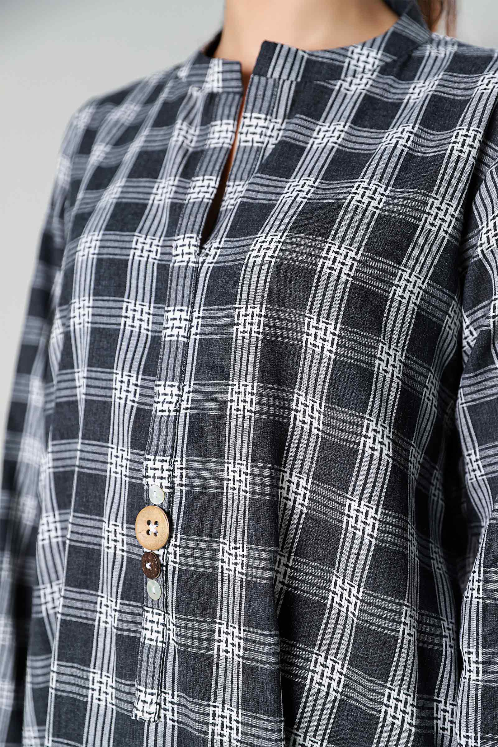 A-Line Shirt Ban Neckline With Button Detailing Full Straight Sleeves Color: Black & White Fabric: Yarn Dyed Fit: Relaxed Model is wearing size xs Note: Dry Clean Only