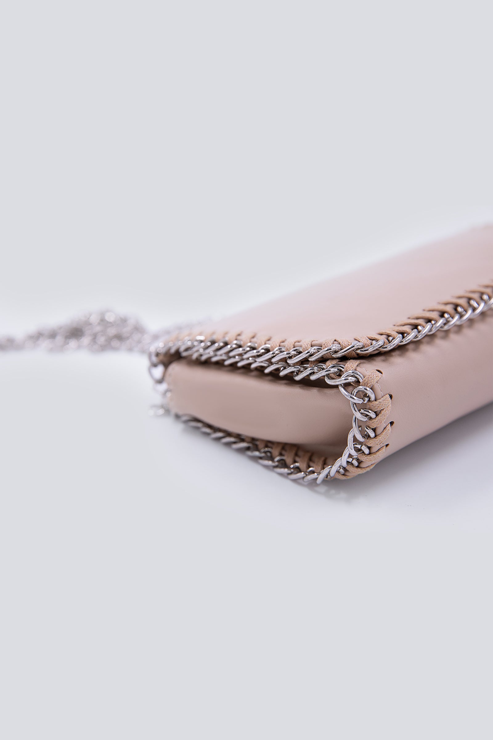 Crafted with a durable yet matte leather exterior and silver-tone hardware, this clutch is your go-to accessory for an elevated style, completing the design with a braided chain that instantly up your panache.