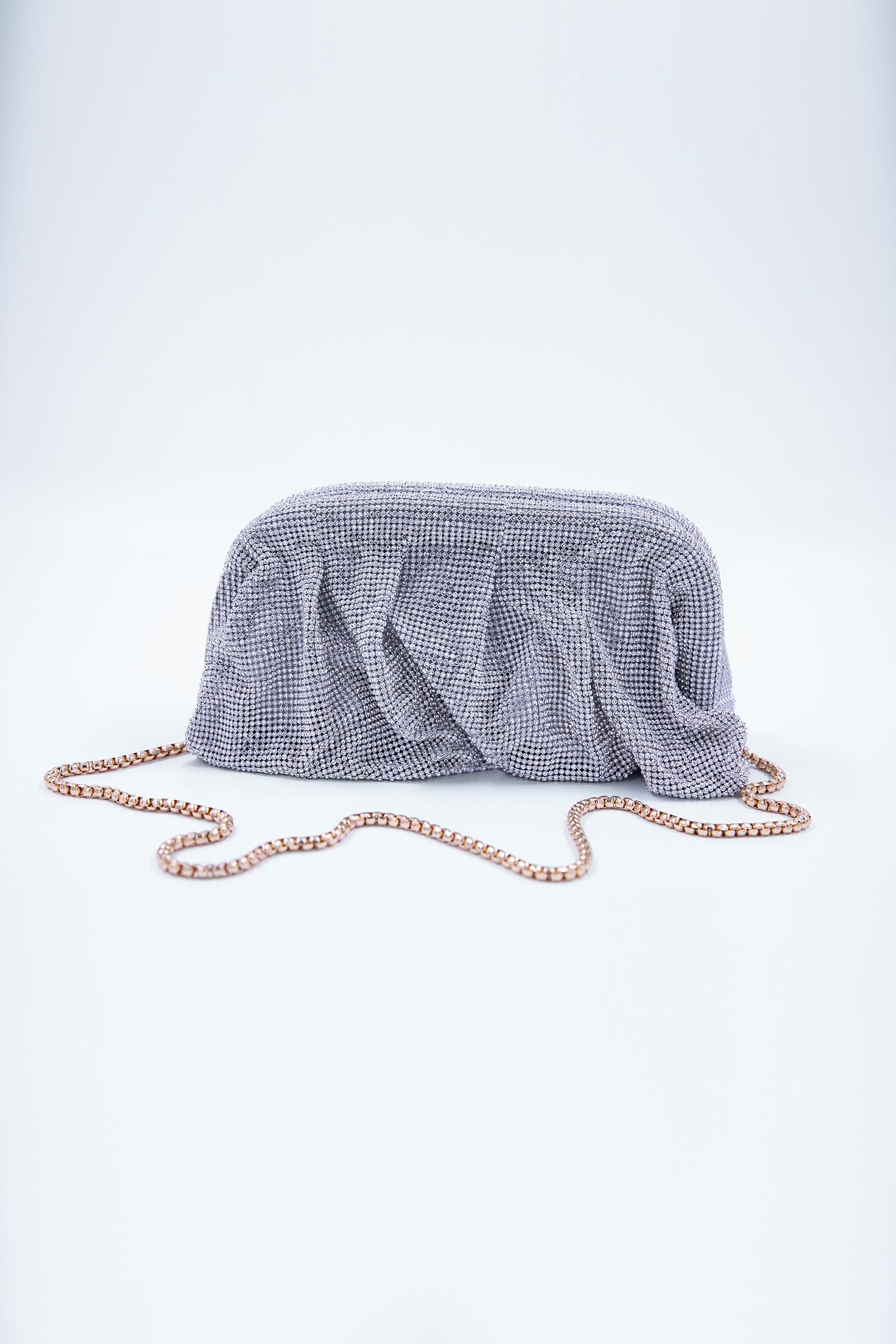This dazzling clutch is adorned with shimmering rhinestones, making it perfect for special occasions or adding a hint of luxury to your everyday style. It comes in 7 diverse yet stunning colors: Green, Black, Purple, Blue, Silver, Beige, and Golden. Details Clutch Metallic braided shoulder chain Material: Embellished Interior Details: Single compartment Dimensions: 10”W X 6”H X 4”D