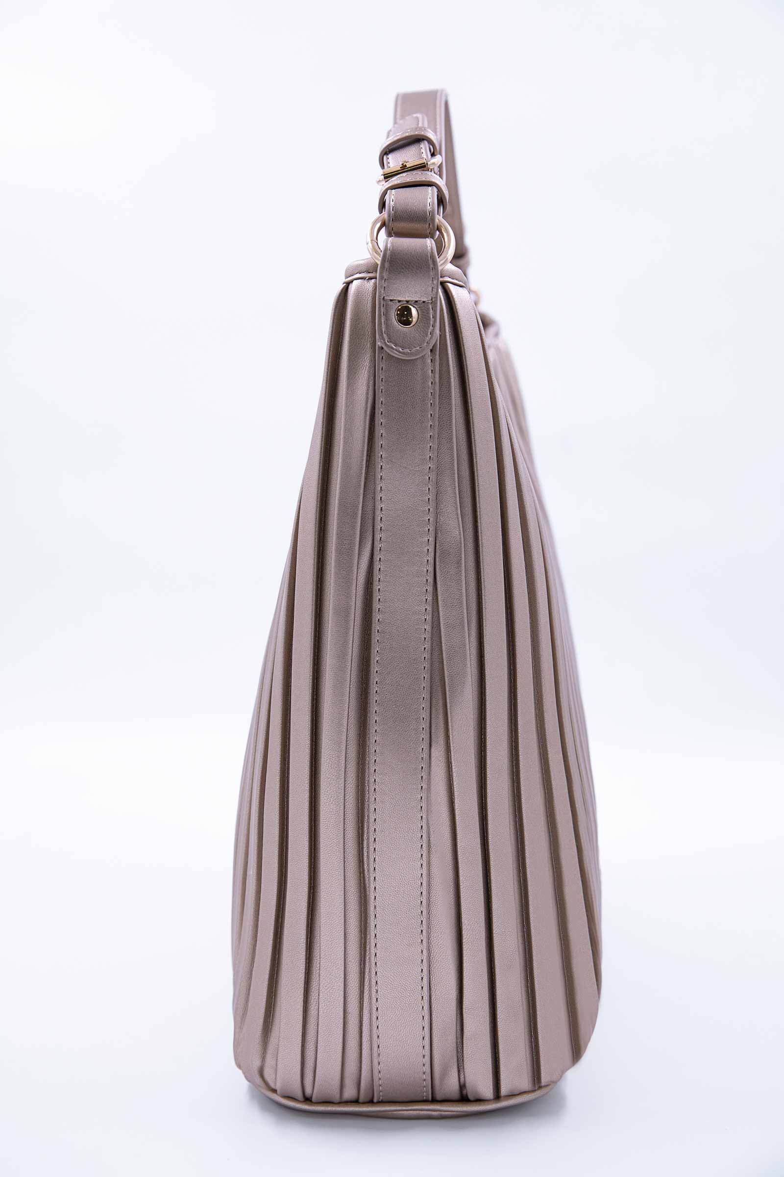 Spacious, sophisticated, and bold; crafted with polished leather and matte finishing, designed in a classic stripe embossed silhouette for an elegant look. It opens to a compact interior that is spacious enough to hold all your essentials. Wear it for a classy yet elegant look. Details Tote Bag Adjustable Strap Zip fastening Material: Metallic Leather Gold-tone hardware Interior Details: Single Compartment One zipped inner pocket Two card slots Dimensions: 13”W X 14”H X 5.6”D