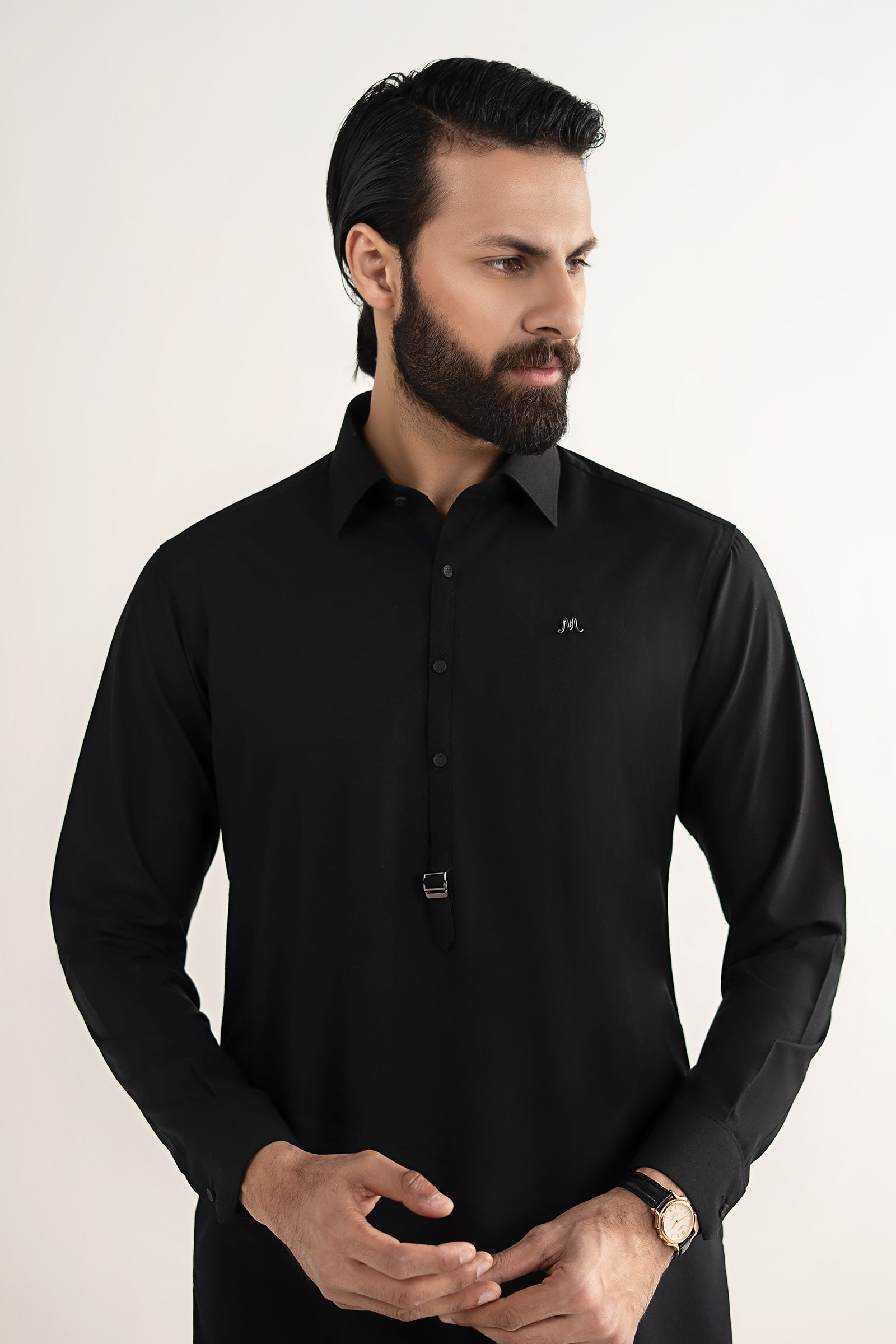 KurtaCollar NecklineMetal Logo Pin On Front & BackOne Side PocketStraight HemSide-Cut Double Cuffed SleevesShalwarRegular ShalwarColor: Night BlackFit: RegularWear Type: FormalFabric: BlendedModel is wearing medium sizeNote: Dry Clean Only