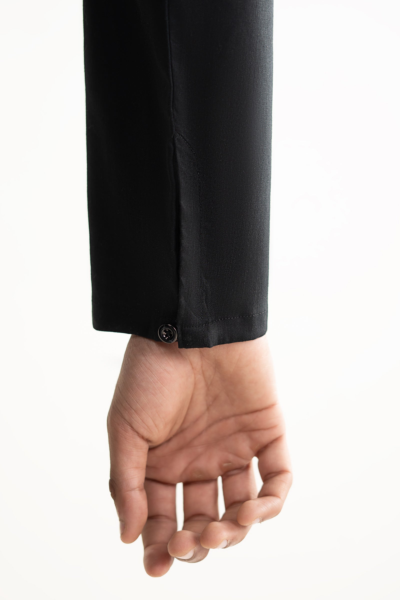 Over Band Collar Neckline With Signature Placket One Side Pocket Straight Sleeves With Loop Buttons Detailing Saddle Stitch On Back With Metal Stud Detailing Color: Spider Black Fit: Regular Wear Type: Formal Fabric: Blended Model is wearing medium size Note: Dry Clean Only