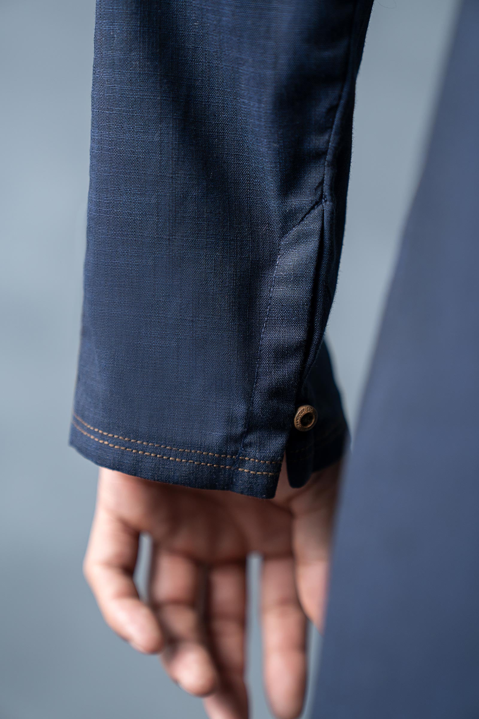 Band Collar Neckline One Side Pocket Straight Sleevees With Elbow Patch Patch On Back With Cross Stitch Detailing Color: Evening Blue Fit: Regular Wear Type: Formal Fabric: Nova Yarn Dyed Khaddar Model is wearing medium size Note: Dry Clean Only