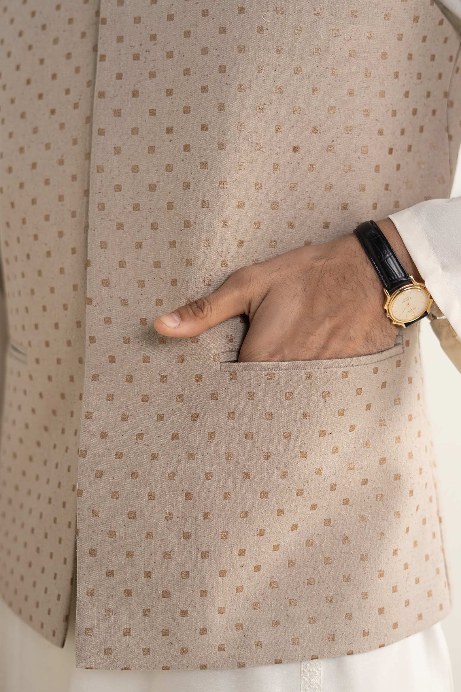 Printed WaistcoatBand Collar With Hidden Placket2 Lip Bone PocketsMetal Logo Pin On FrontStraight HemSilk LiningColor: ConcreteFit: RegularWear Type: FestiveFabric: Pure KarandiModel is wearing medium sizeNote: Dry Clean Only