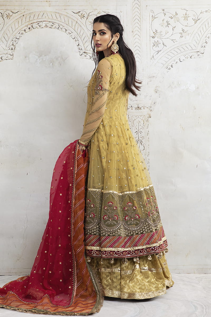 Three-piece traditional flared Angrakha with gilded gota, mirror, and sequence work. It is set with a contrast two-toned gota plaited dupatta finished with dori kiran.